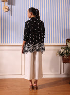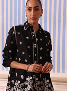 Crafted in soft, breathable linen, this shirt is elegance in its most effortless form. The classic black base is adorned with intricate embroidery along the scalloped hemline. Featuring a classic collared neckline and relaxed A-line silhouette, this piece blends comfort with understated sophistication.