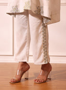 Where minimalism meets charm—this ivory co-ord set is all about effortless grace. The oversized shirt features a collared neckline, drop-shoulders, and wide three-quarter sleeves, all brought to life with soft botanical embroidery.
