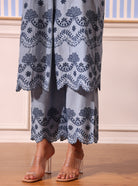Minimalism meets elegance in the co-ord set, a powder blue linen ensemble that speaks to effortless sophistication. This set features delicate navy floral embroidery along the shirt and scalloped hemline.