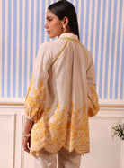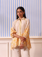 Voluminous bishop sleeves are softly gathered at the cuffs, adding structure without compromising on ease. A structured shirt collar and front placket give it a polished touch, The intricate yellow piping detail running along the shoulders and front enhances the design’s depth with subtle contrast.