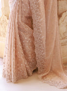The Ahlira Saree in Beige is understated elegance at its finest - subtle, graceful, and timeless. Made from sheer organza, the saree is delicately embroidered with tonal thread and sequin motifs that glisten softly under the light. Scalloped lace edging lines the border, adding just the right touch of detail to this dreamy silhouette.