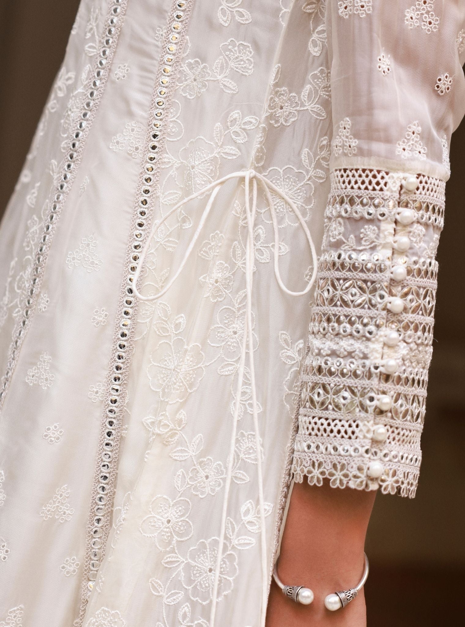 It’s paired with tonal cotton pants embroidered at the hem, keeping the look cohesive and polished. A matching organza dupatta, embroidered all over and finished with scalloped lace, completes the ensemble with a touch of lightness and movement.