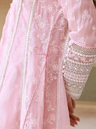 The Lomika Anarkali Set in pink, embodies an effortless charm and celebration-ready grace. Crafted in light-as-air organza, its flowing silhouette is adorned with floral embroidery that trails across the bodice, sleeves, and kurta hem; creating a romantic interplay of texture and movement. With a unique Y-neckline, it features handmade tasssles on the neck and sheer full sleeves that add a modern touch to this timeless classic.