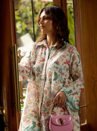 Styled with co-ordinated printed straight pants featuring playful vertical embroidery and a vibrant border at the cuff, this set feels just right for sun-dappled mornings, gallery strolls, or café catchups.