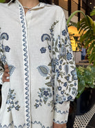 This co-ord is your canvas of calm. The Fleur shirt set, crafted in breathable linen, features a floral vine print in deep blue and slate green set against a crisp off-white base. Delicate contrast borders and subtle detailing at the hem and cuff lend it a polished, put-together charm.