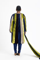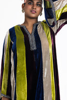 MULTI COLOUR VELVET PANNELED TUNIC WITH GUNMETAL EMBROIDER AND DHOTI SALWAR