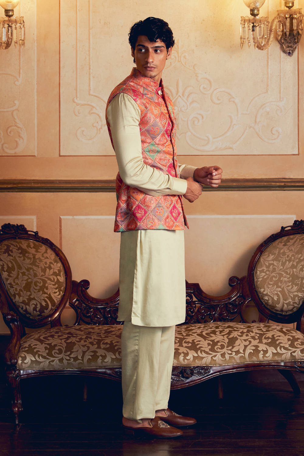 The classic Multicoloured banarasi jamawar men's jacket is quilted using silk zari thread and adorned with semi precious meenakari buttons.