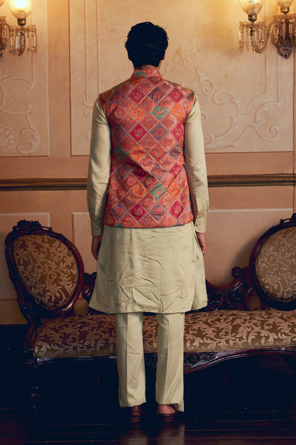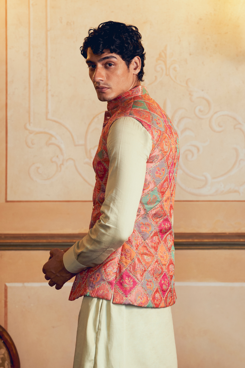 This classic Multicolored Banarasi Jamawar men's jacket set is intricately quilted with silk zari and adorned with semi precious meenakari buttons, is paired with a mint green silk cotton kurta and pants, blending opulence with refined simplicity.