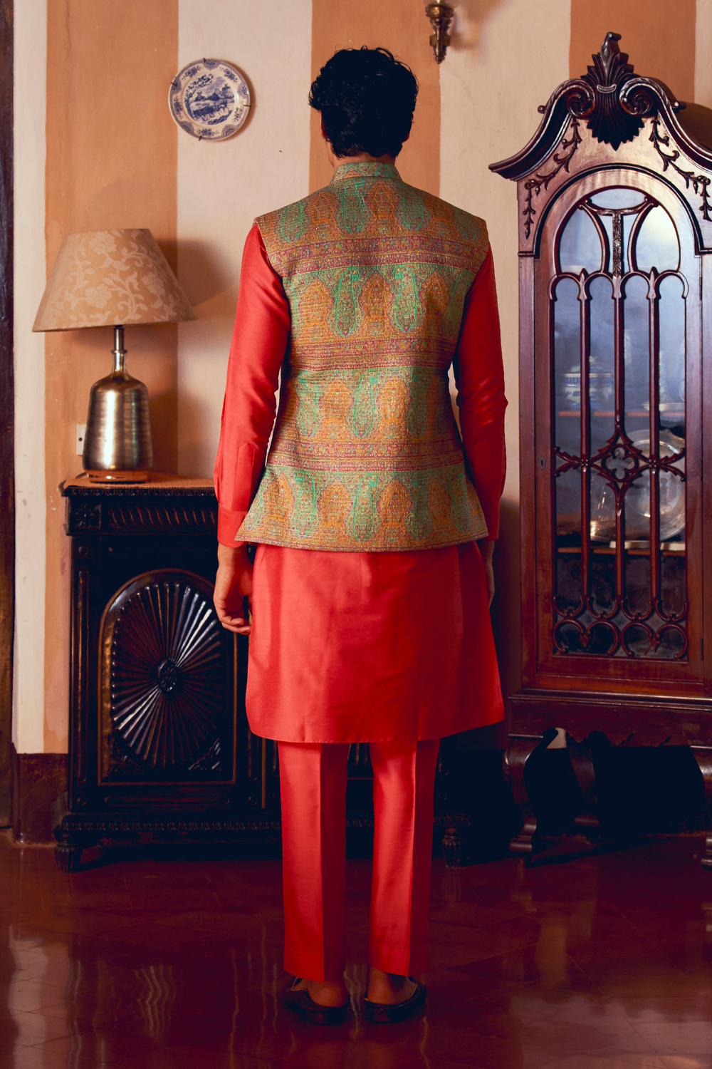 This classic multicoloured Banarasi Jamawar men's jacket set is intricately quilted with silk zari and adorned with semi precious meenakari buttons, is paired with a beige silk cotton kurta and pants, blending opulence with refined simplicity.