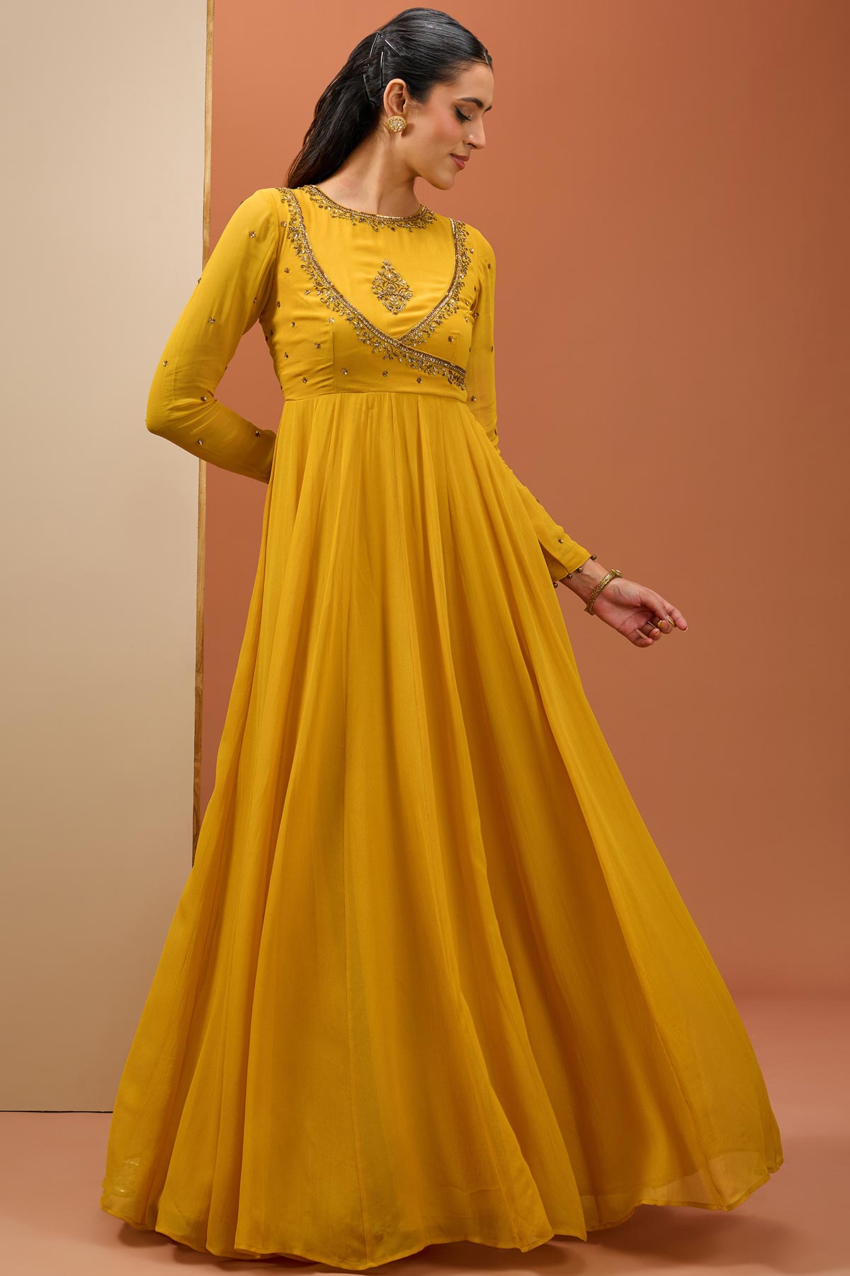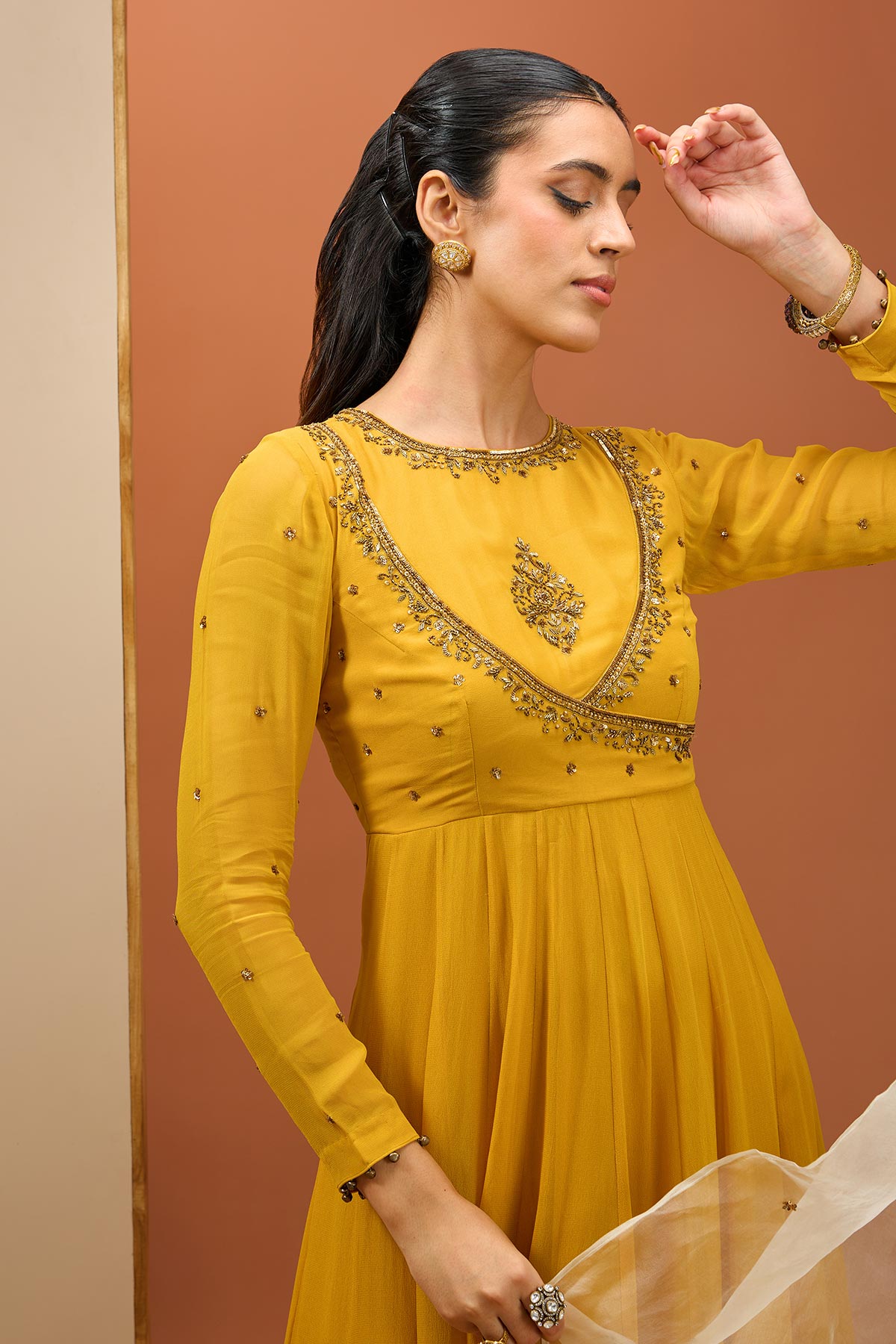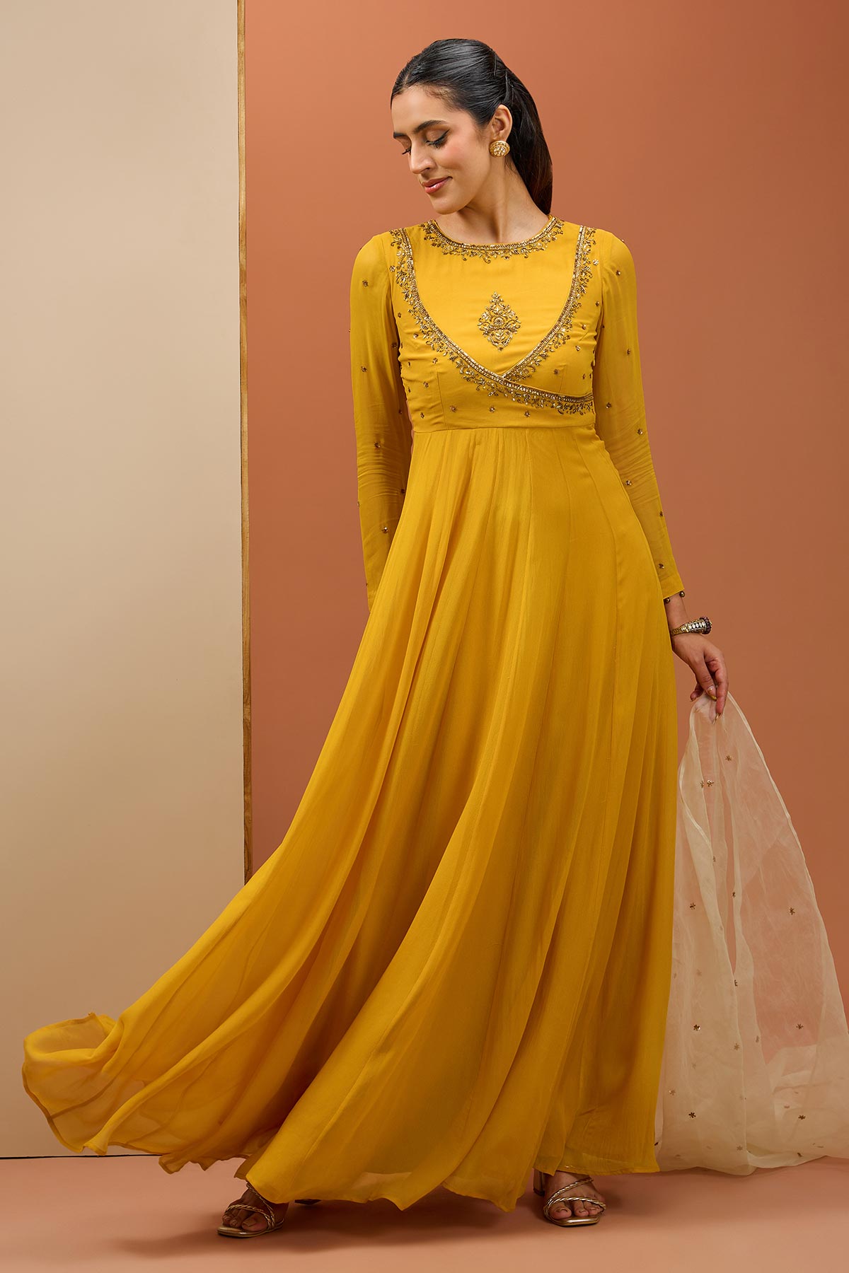 This consist of mustard angrakha style Anarkali with hand work on neckline. It is paired with organza Dupatta.