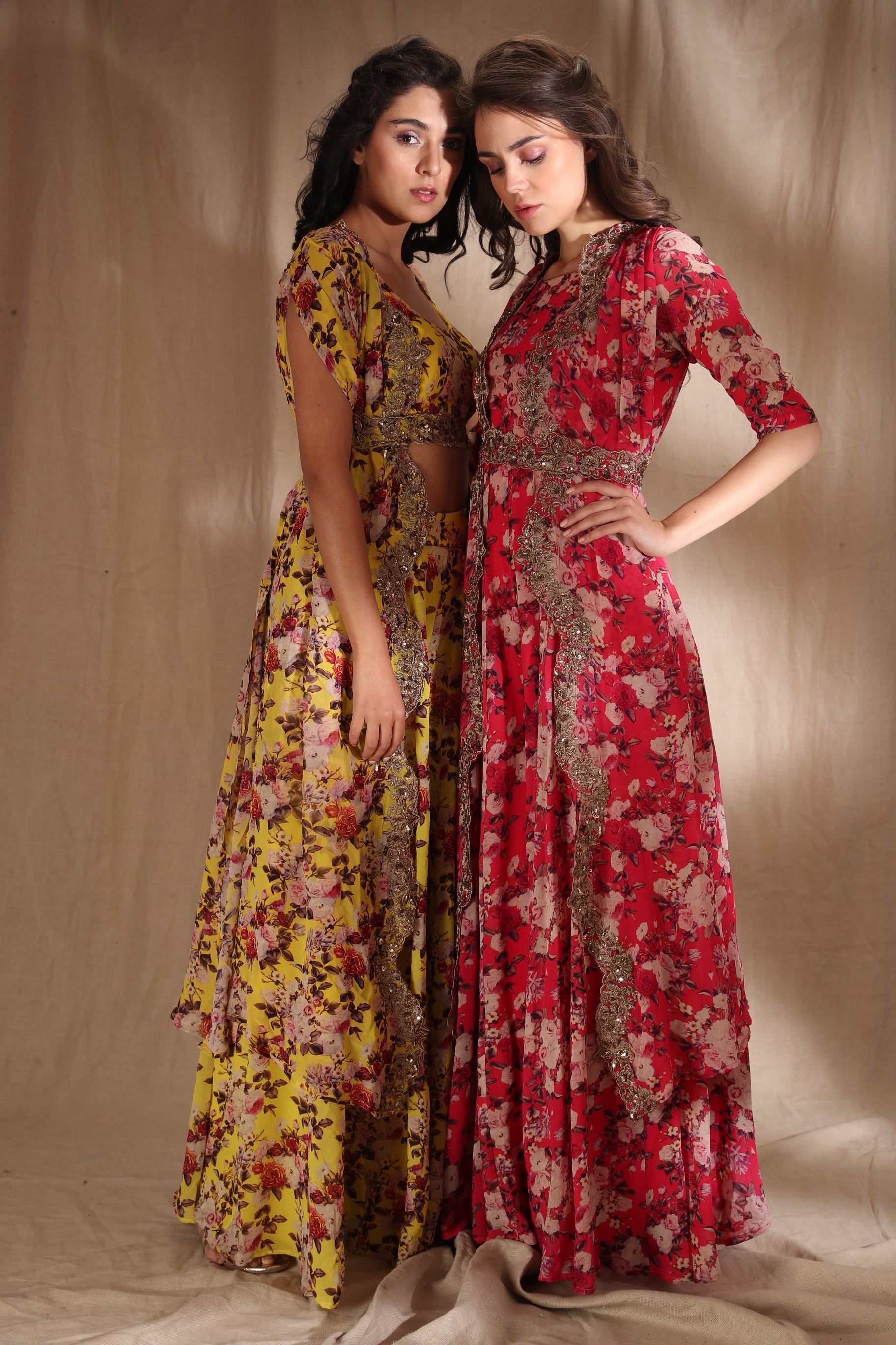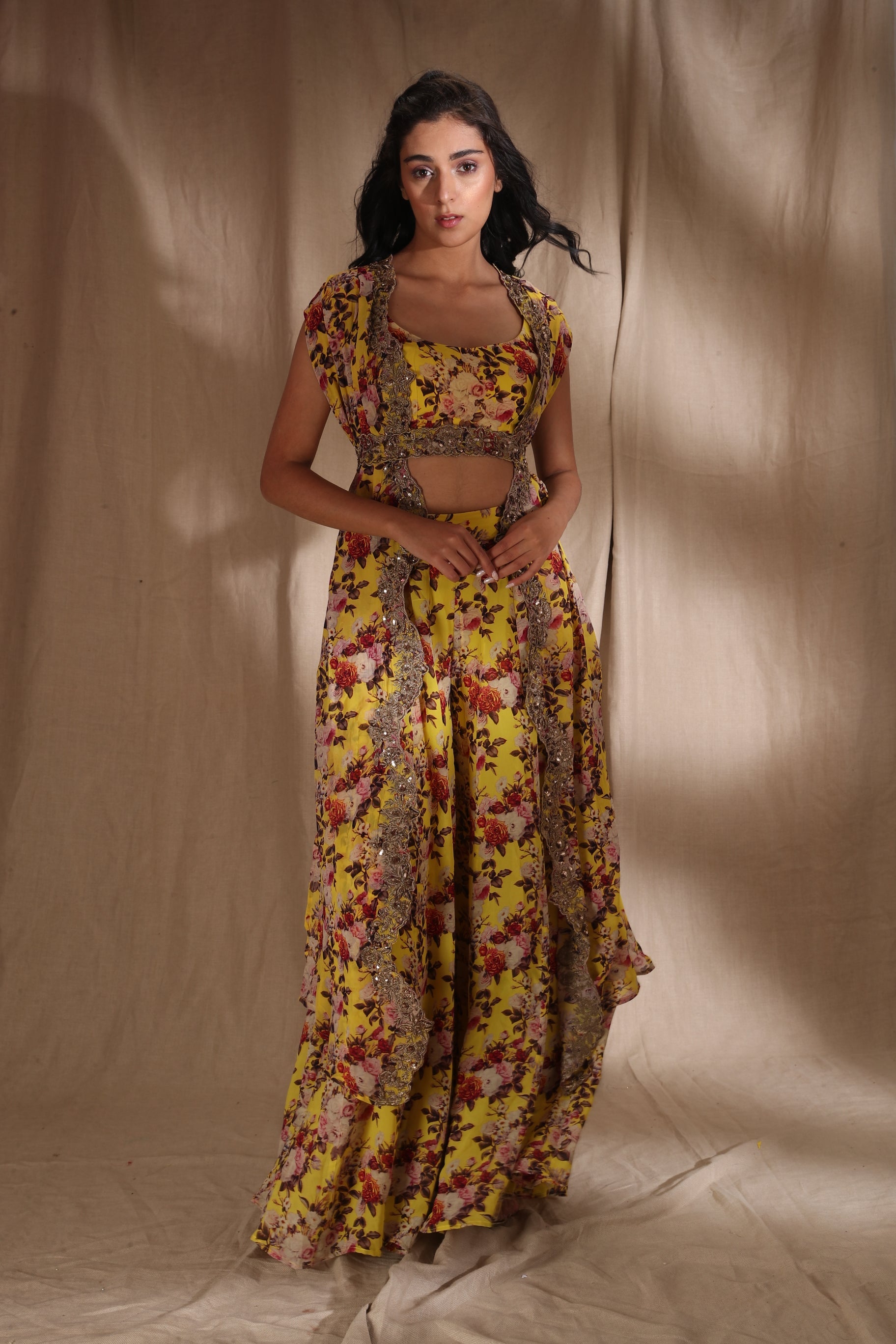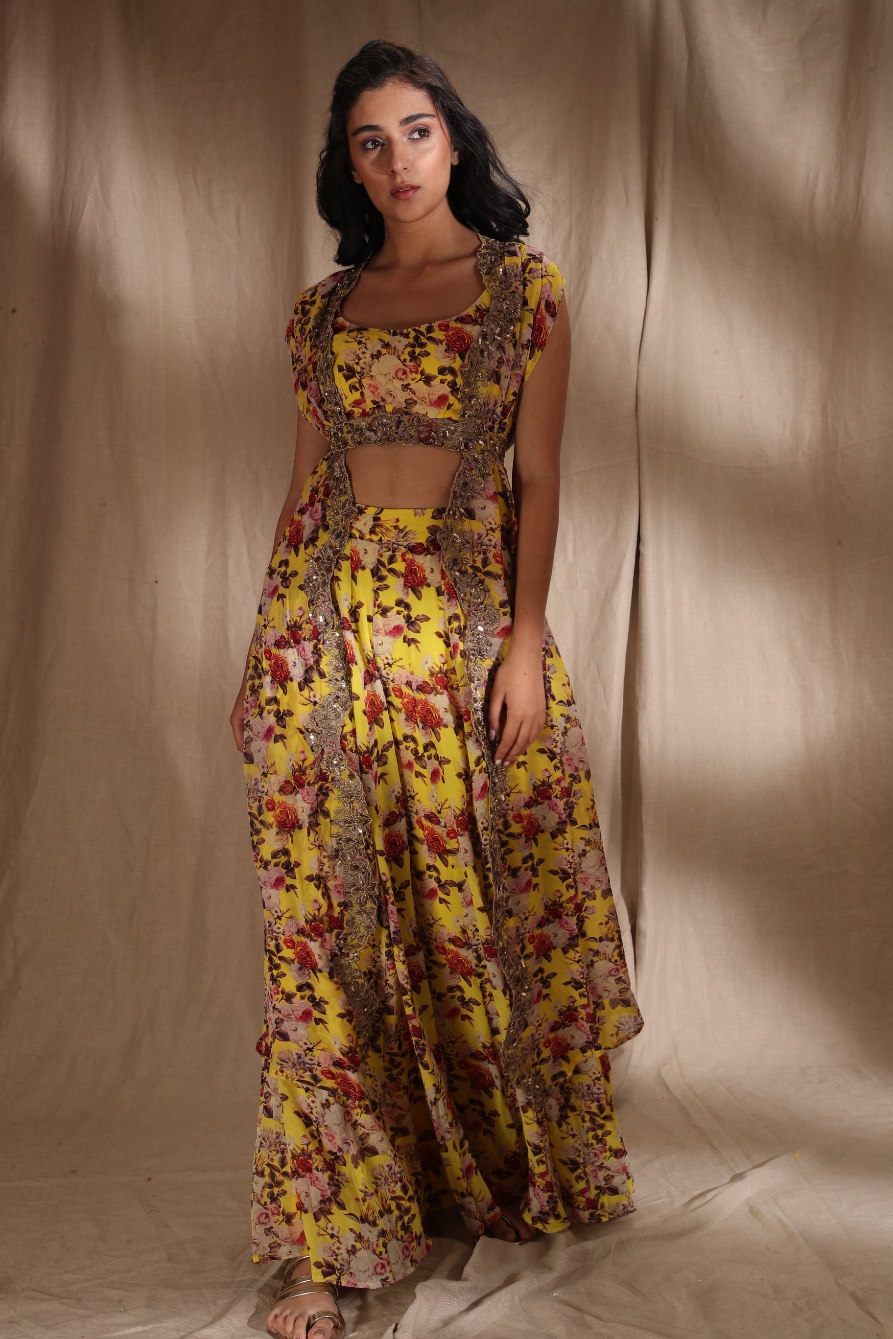 Featuring a MUSTARD FLORAL CROP TOP WITH SHARARA PANTS Set in GEORJETTE.