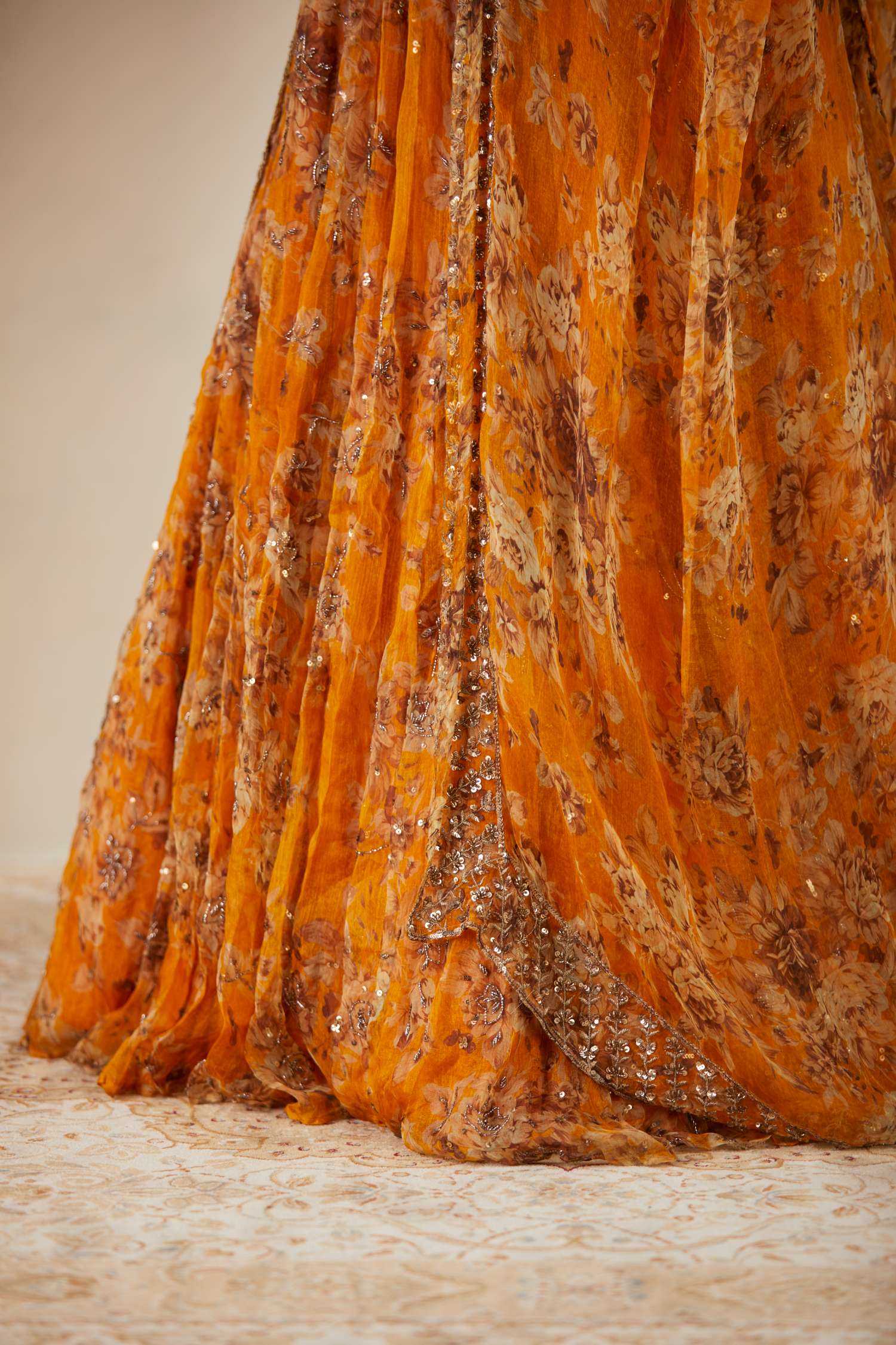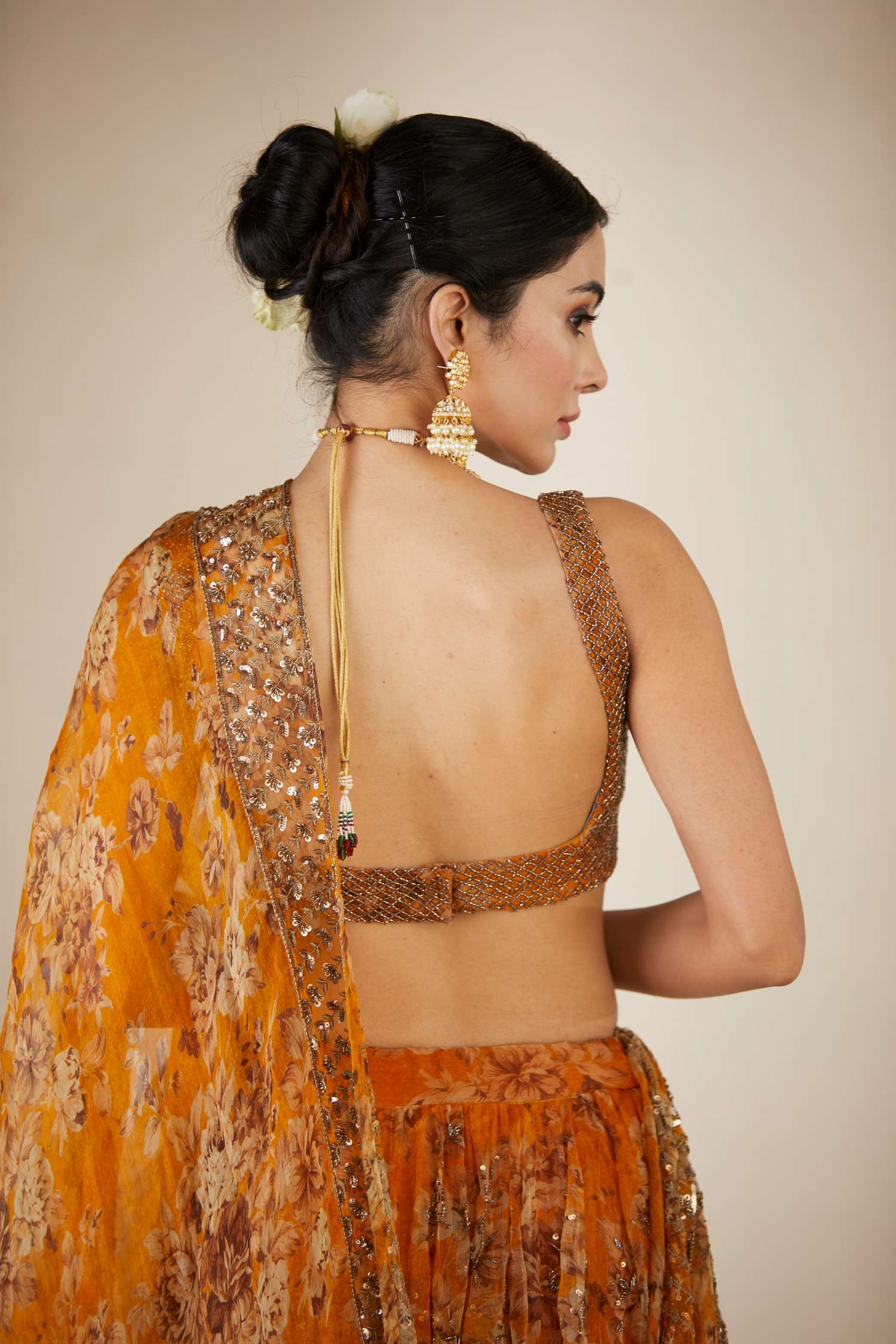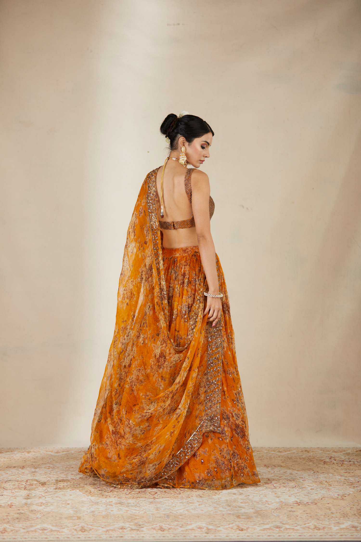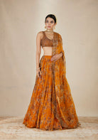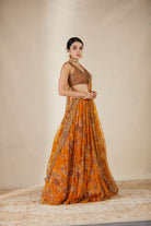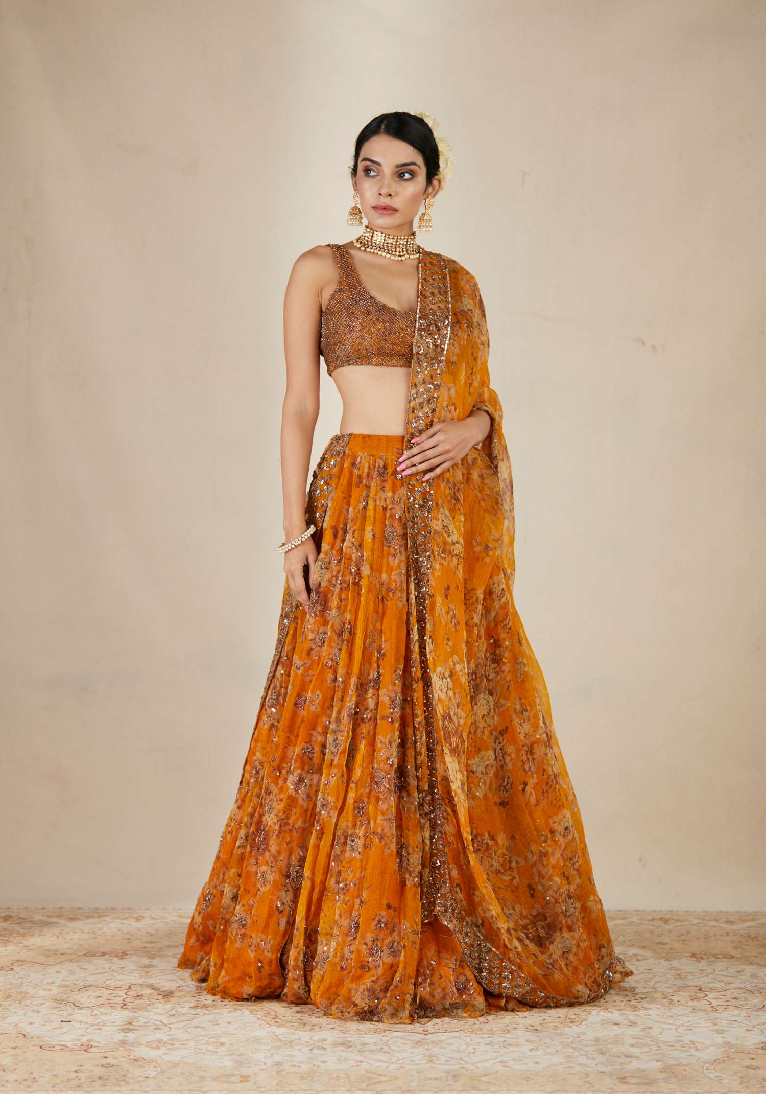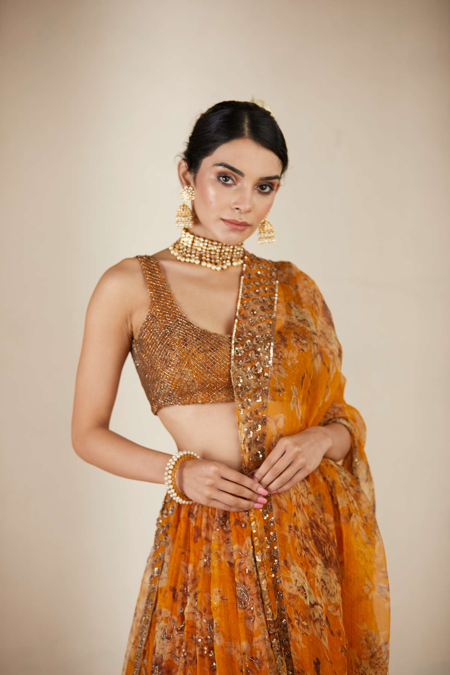 Featuring a Mustard Floral Lehenga Set in Organza.