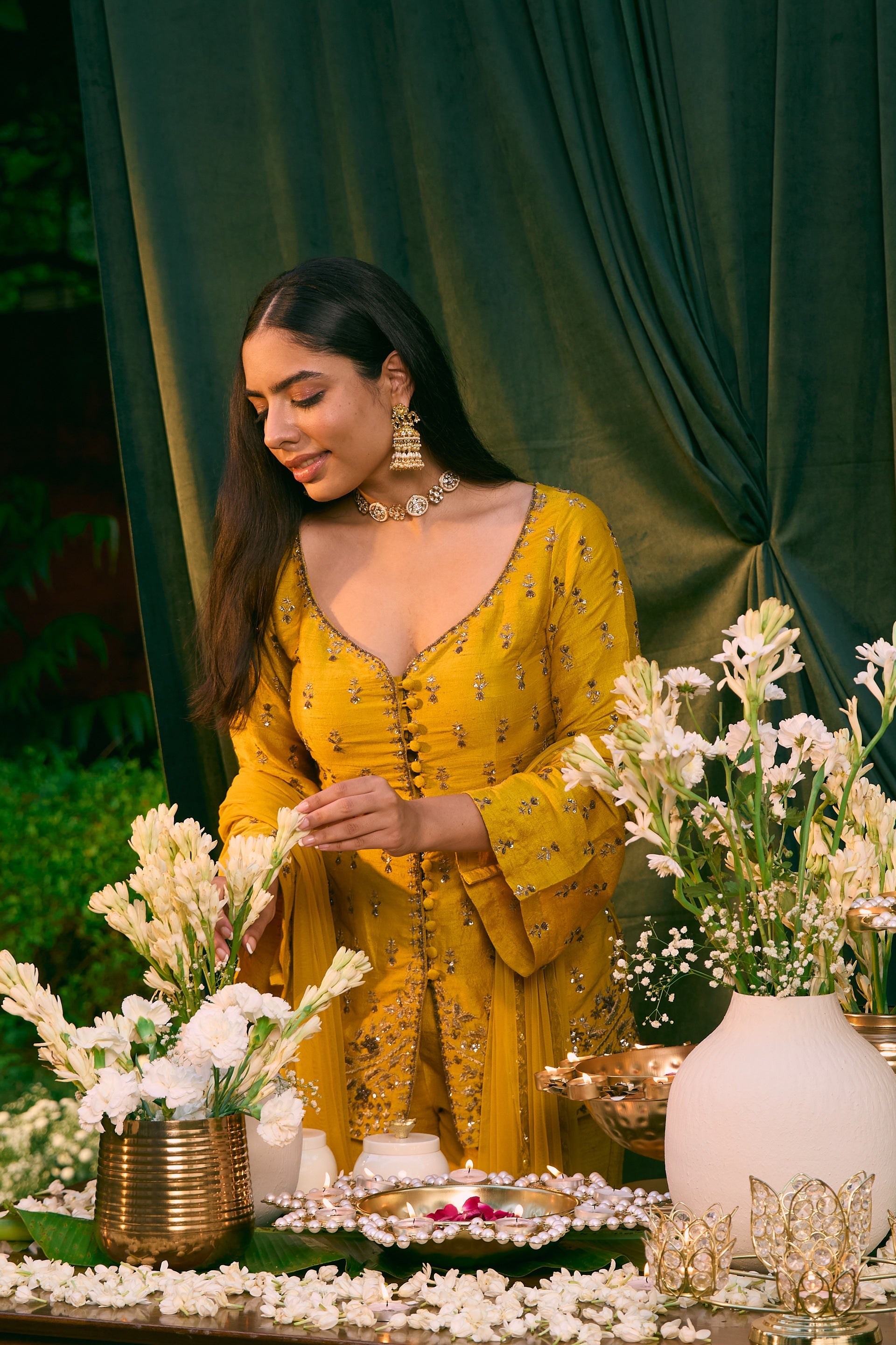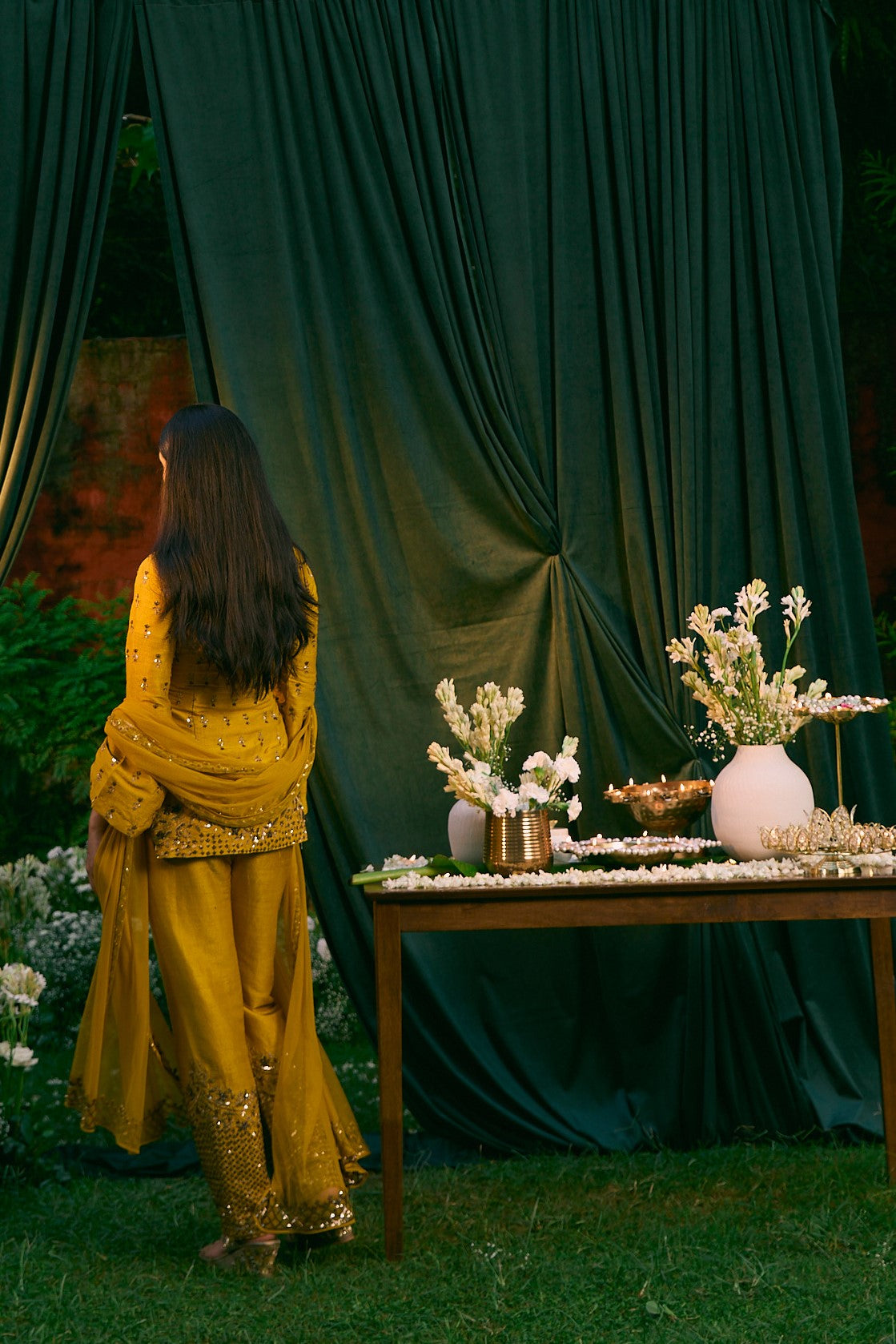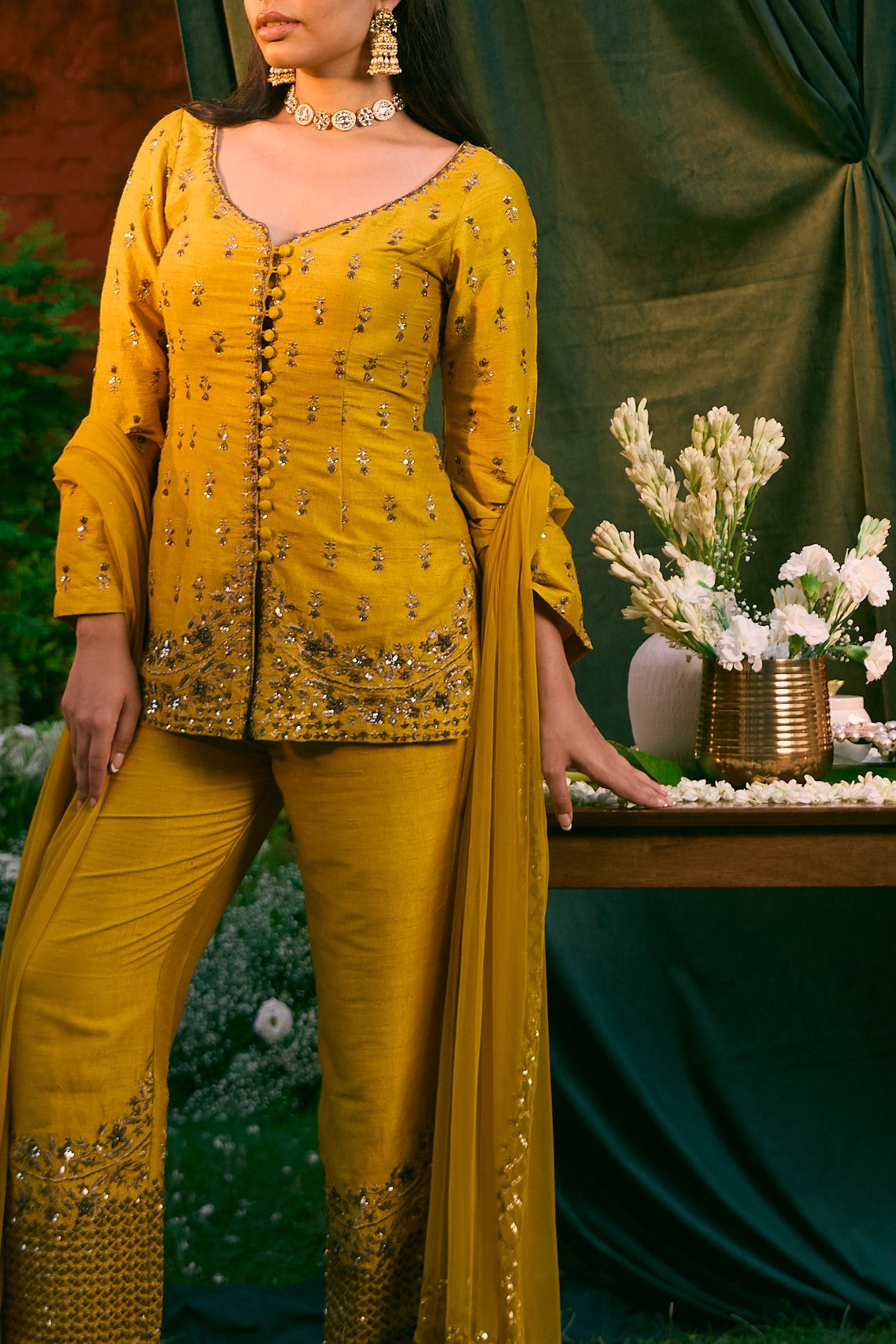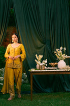 Featuring a Mustard Front Open Short Kurti with Pant Set in Organza Silk.