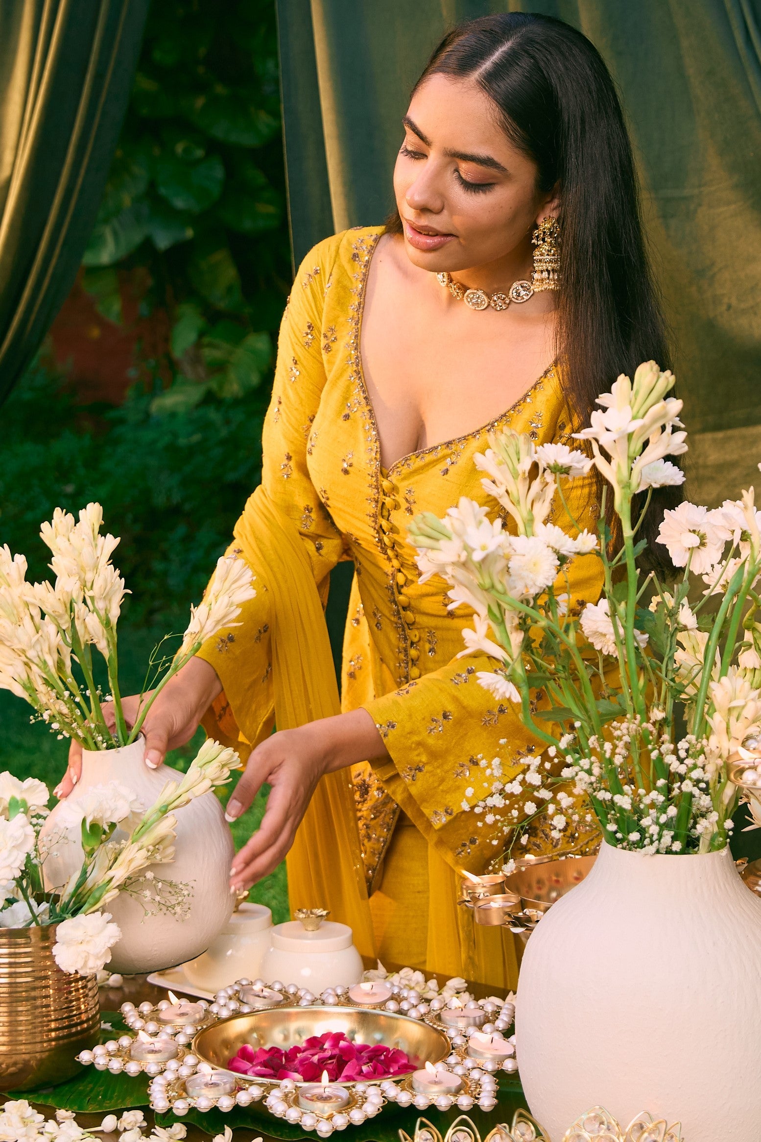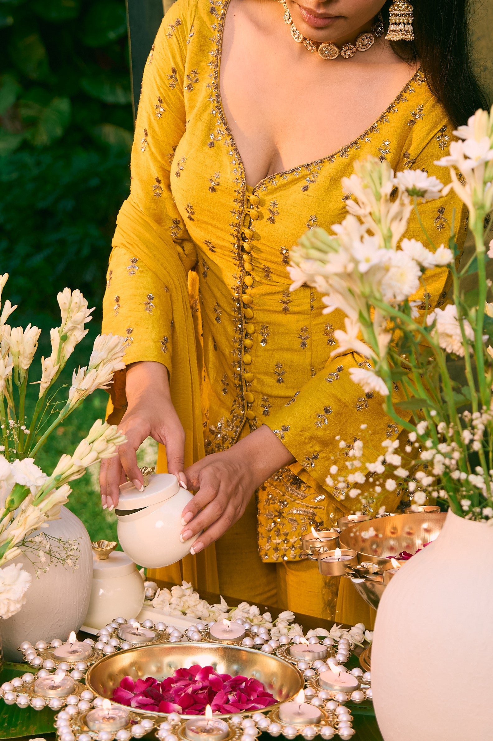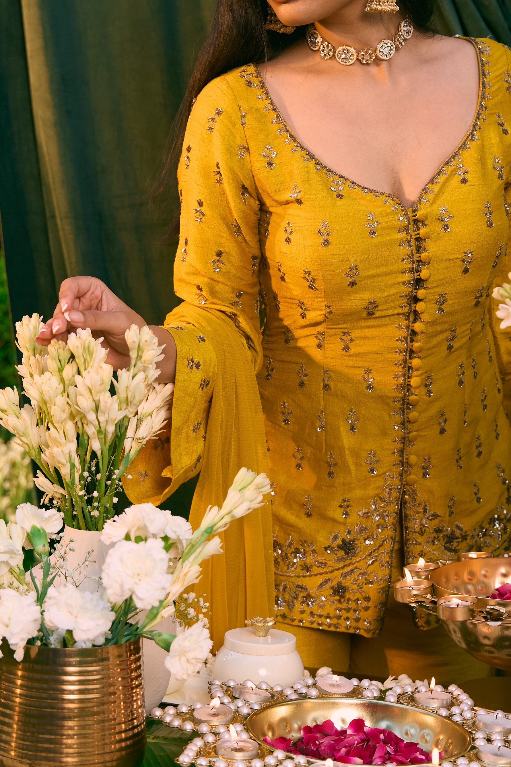 Featuring a Mustard Front Open Short Kurti with Pant Set in Organza Silk.
