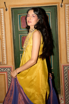 This kalidar choga, crafted in a harmonious blend of misted marigold and purple cotton tissue, blooms with delicate leafy motifs and intricate sequin embellishments. Framed by richly textured borders, it exudes timeless charm with layered elegance and graceful depth.