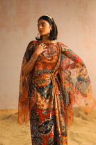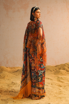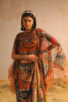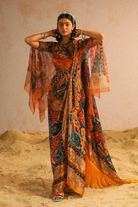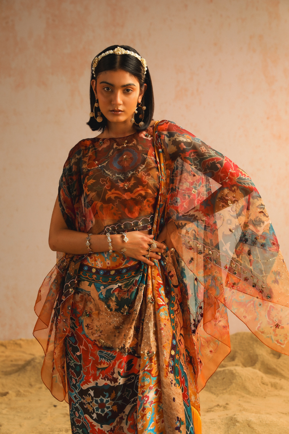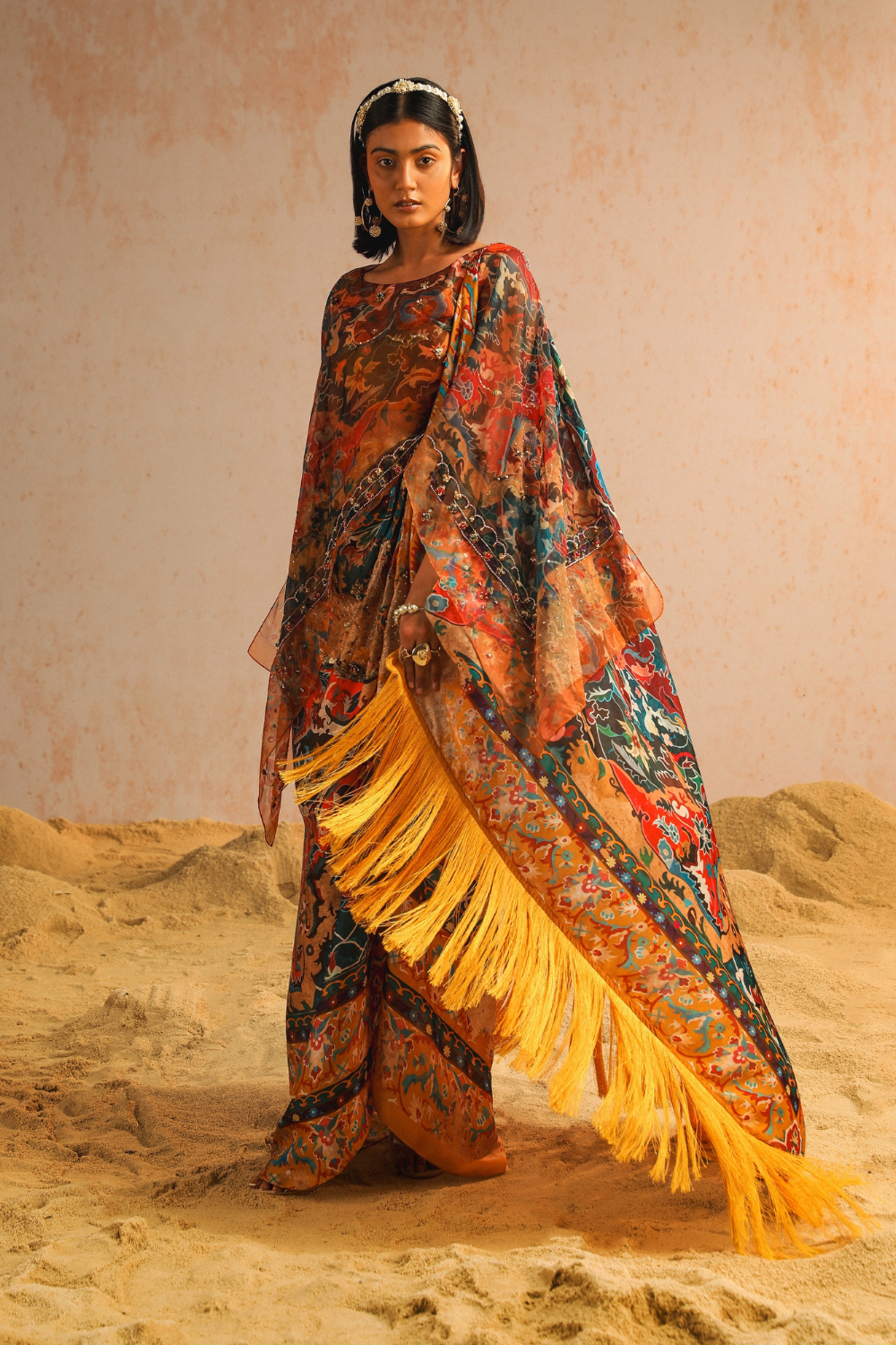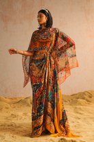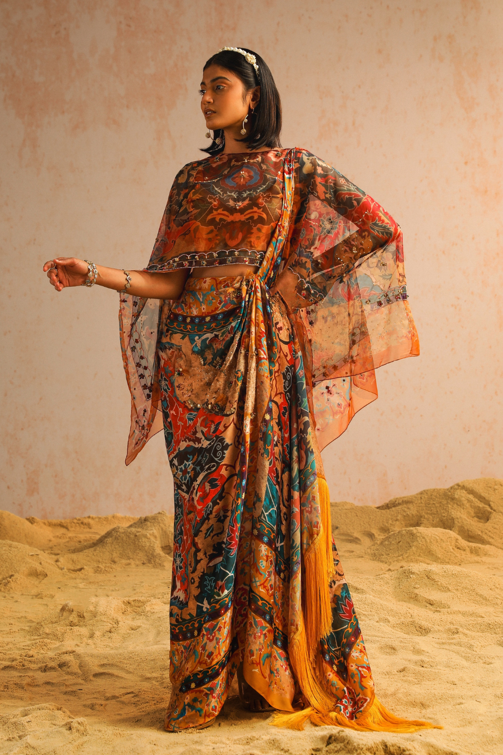 This mustard yellow satin Georgette draped saree showcases our signature draping style, adorned with intricate motif print inspired by Jan Kath's erased carpets. It is paired with a matching raw silk blouse and an organza cape, adding layers to the silhouette for enhanced depth and dimension. The delicate sheerness of the fabric enhances the overall elegance. Vibrant hues, reminiscent of macaw plumage, lend an exotic allure. The ensemble is further enhanced with delicate aari and zardozi work using sequins and pearls, along with tassels and thick fringe borders on the dupatta's hem, creating movement and an artistic feel to the outfit