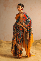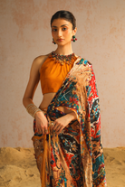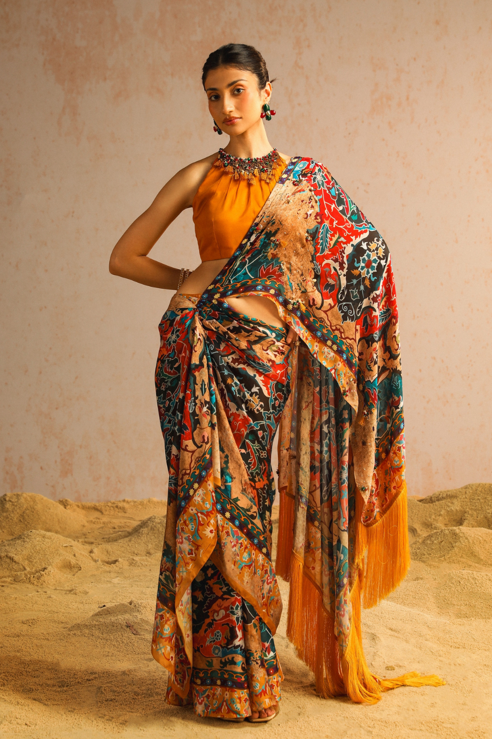 This mustard yellow satin Georgette draped saree embodies our distinctive draping style, elegantly wrapping around the body to create fluid lines and graceful folds, adorned with intricate motif print inspired by Jan Kath's erased carpets. It is paired with a matching halter neck organza blouse lined with crepe. The blouse features a keyhole back and is adorned with intricate embroidery along the neckline. Vibrant hues, reminiscent of macaw plumage, infuse the ensemble with an exotic allure. The detailed aari and zardozi work, including sequins, pearls, tassels, and thick fringe borders on the dupatta's hem, add movement and artistic charm to the outfit.