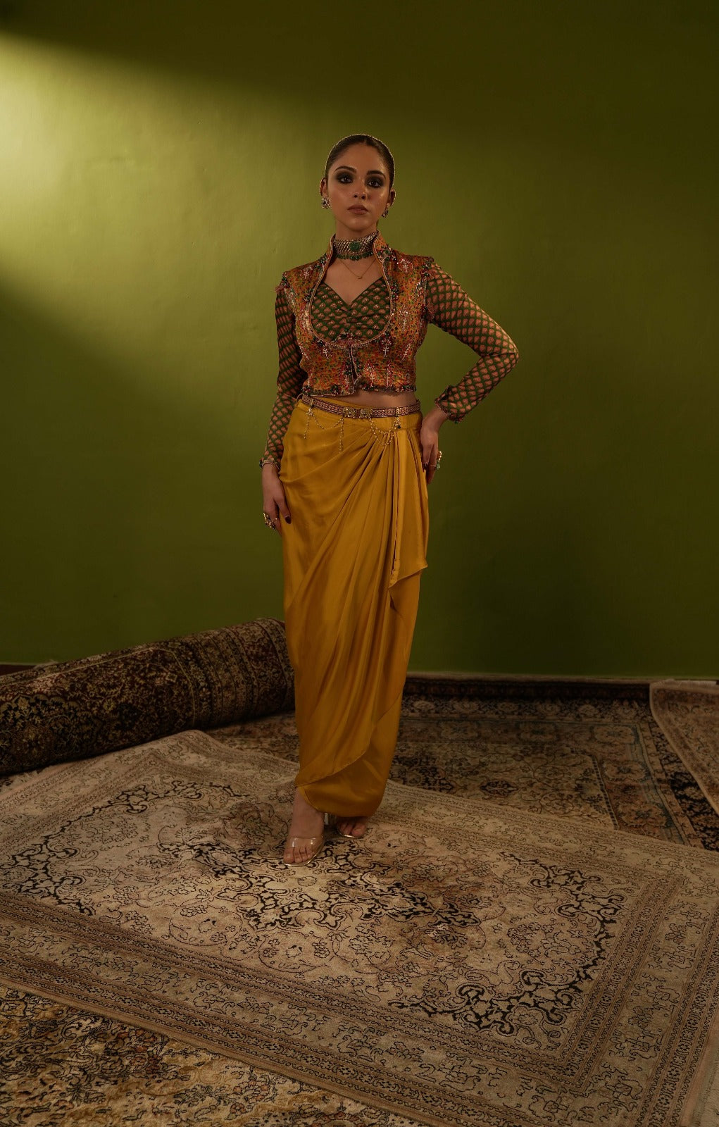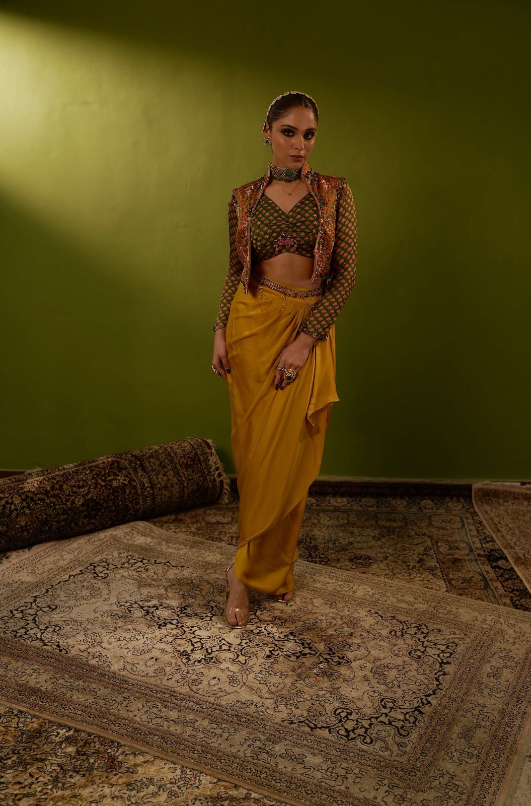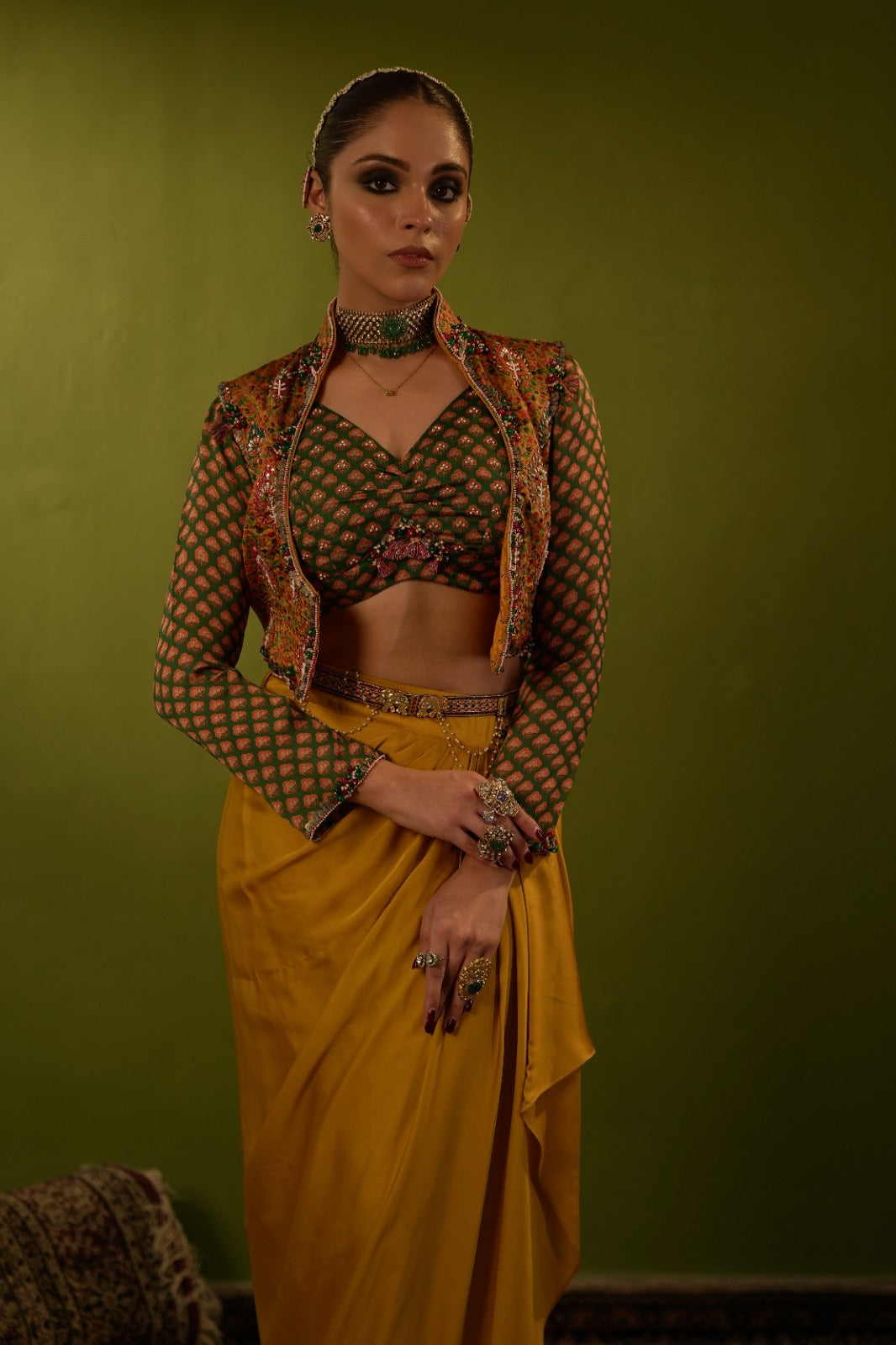 Mustard yellow draped skirt with jamawar jacket and green blouse