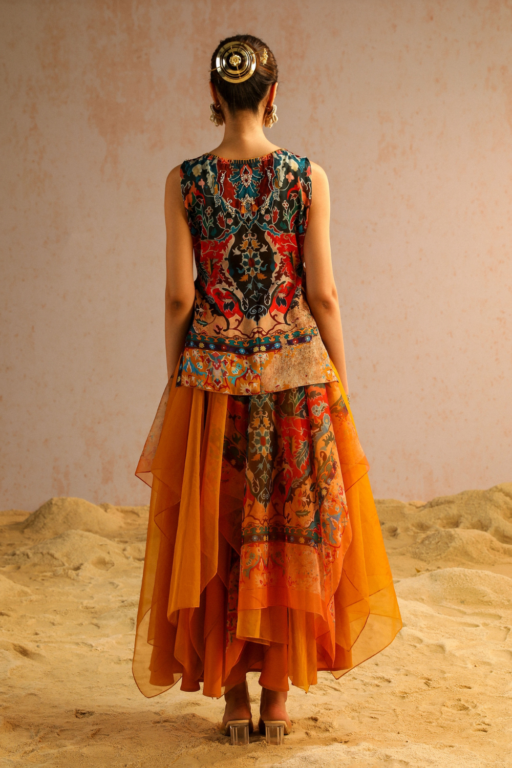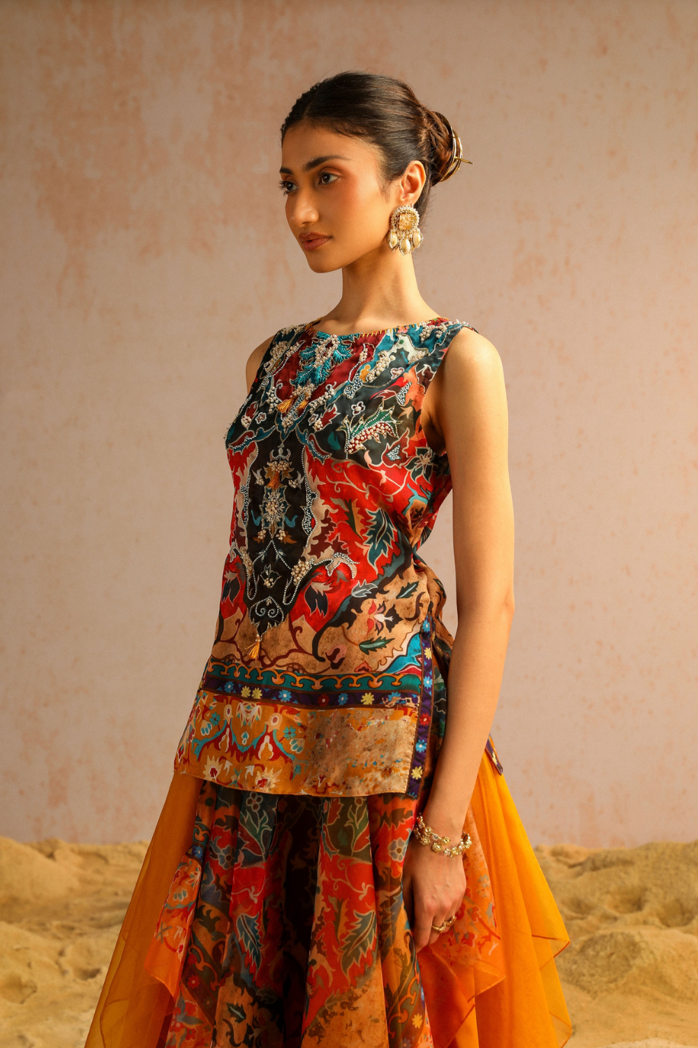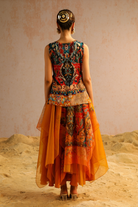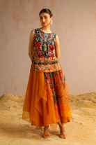 This captivating Mustard yellow organza layered skirt drapes elegantly around the body, creating fluid lines and graceful folds. Adorned with intricate motif print inspired by Jan Kath's erased carpets, the skirt exudes a sense of artistic beauty. The combination of plain and printed organza adds a sophisticated charm, enhancing its feminine appeal. Paired with a short kurta in matching tones, the ensemble is further enhanced by the embroidered neckline, both at the front and back, which adds a touch of intricacy and detail. The meticulous aari and zardozi work, featuring sequins, pearls, and tassels, brings movement and artistic elegance to the outfit, while vibrant hues reminiscent of macaw plumage create an exotic allure
