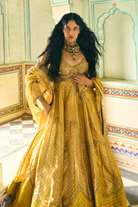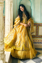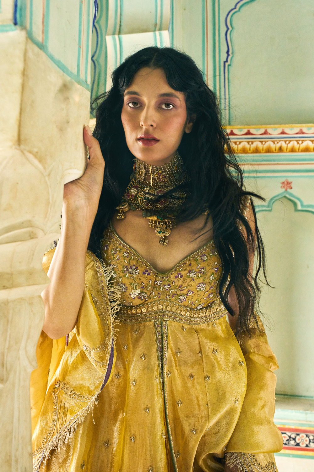 This kalidar jacket, crafted in Mustard yellow pure tissue and cotton tissue, blooms with delicate lilac flowers and lush green leaves, adorned with pearl detailing and dainty paisley motifs in gota patti work. A vibrant green border adds the perfect highlight. Paired with a crushed tissue skirt in a soft misted marigold hue, the ensemble exudes elegance with a whisper of tradition.