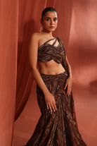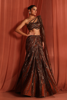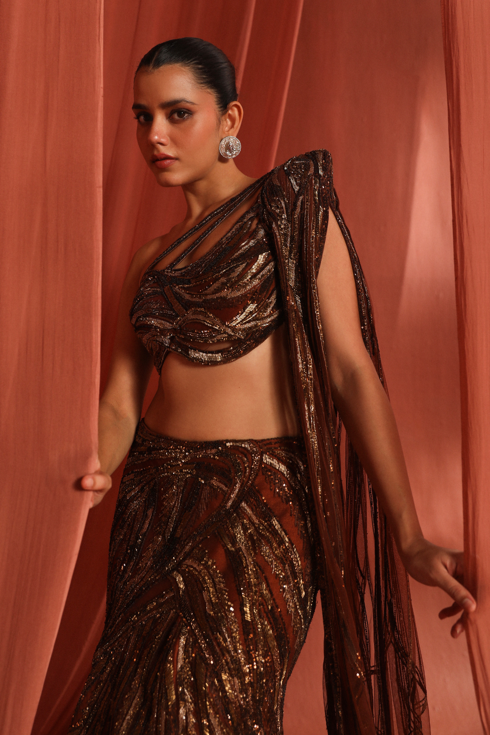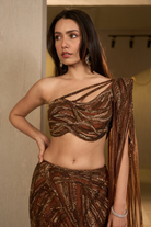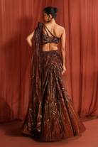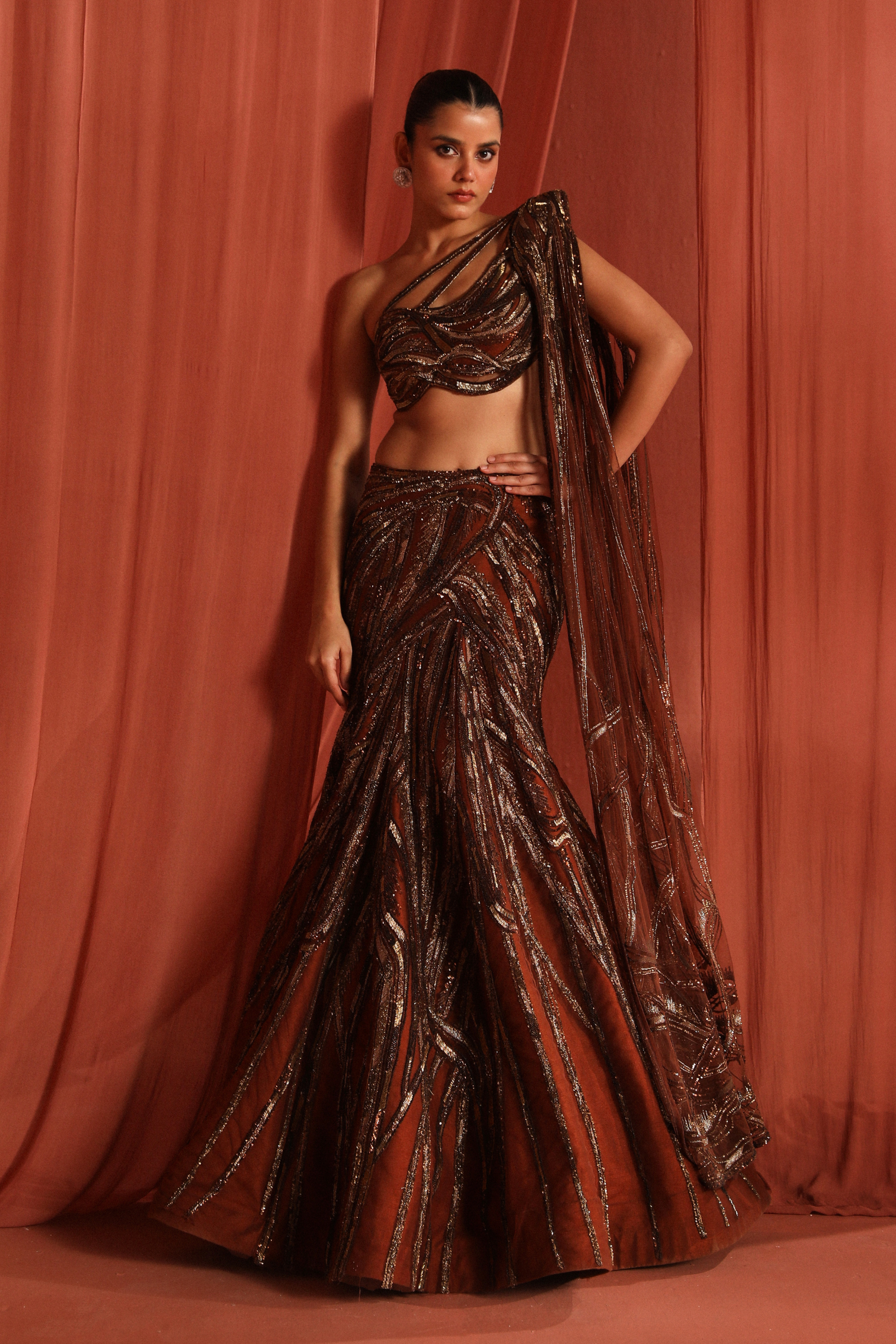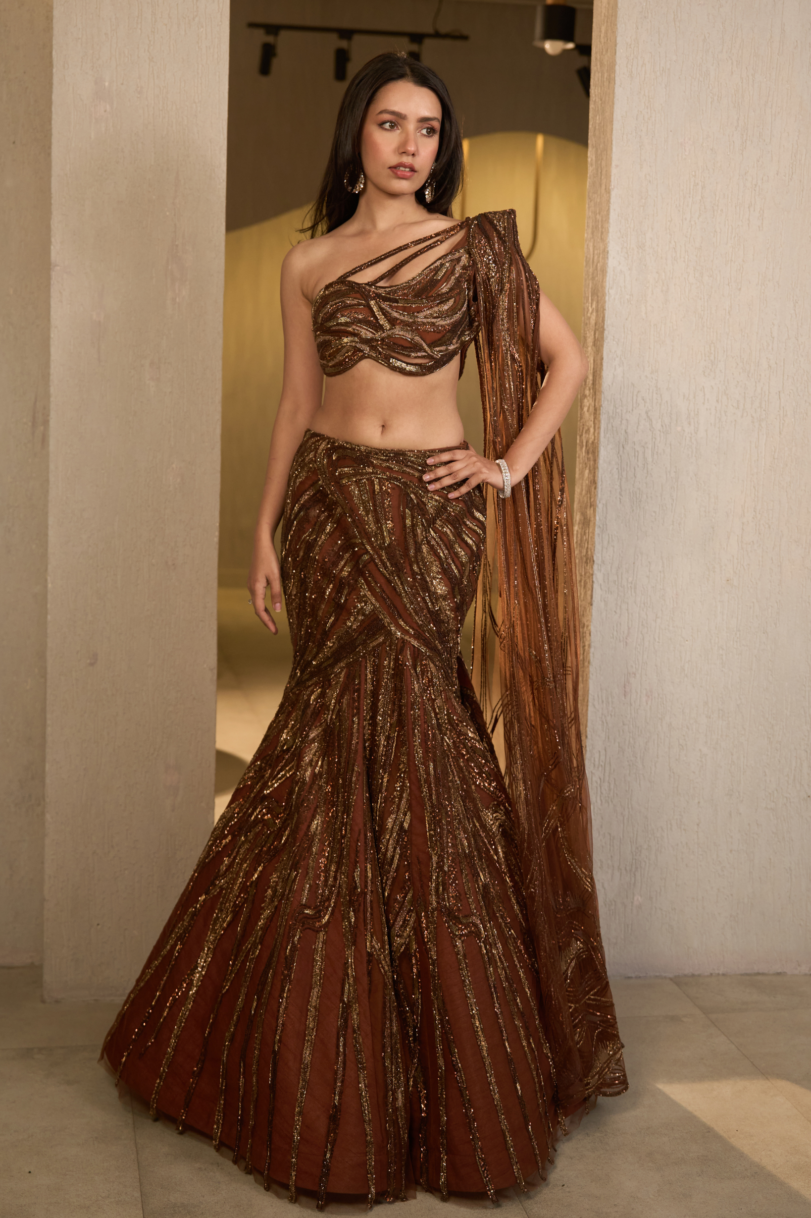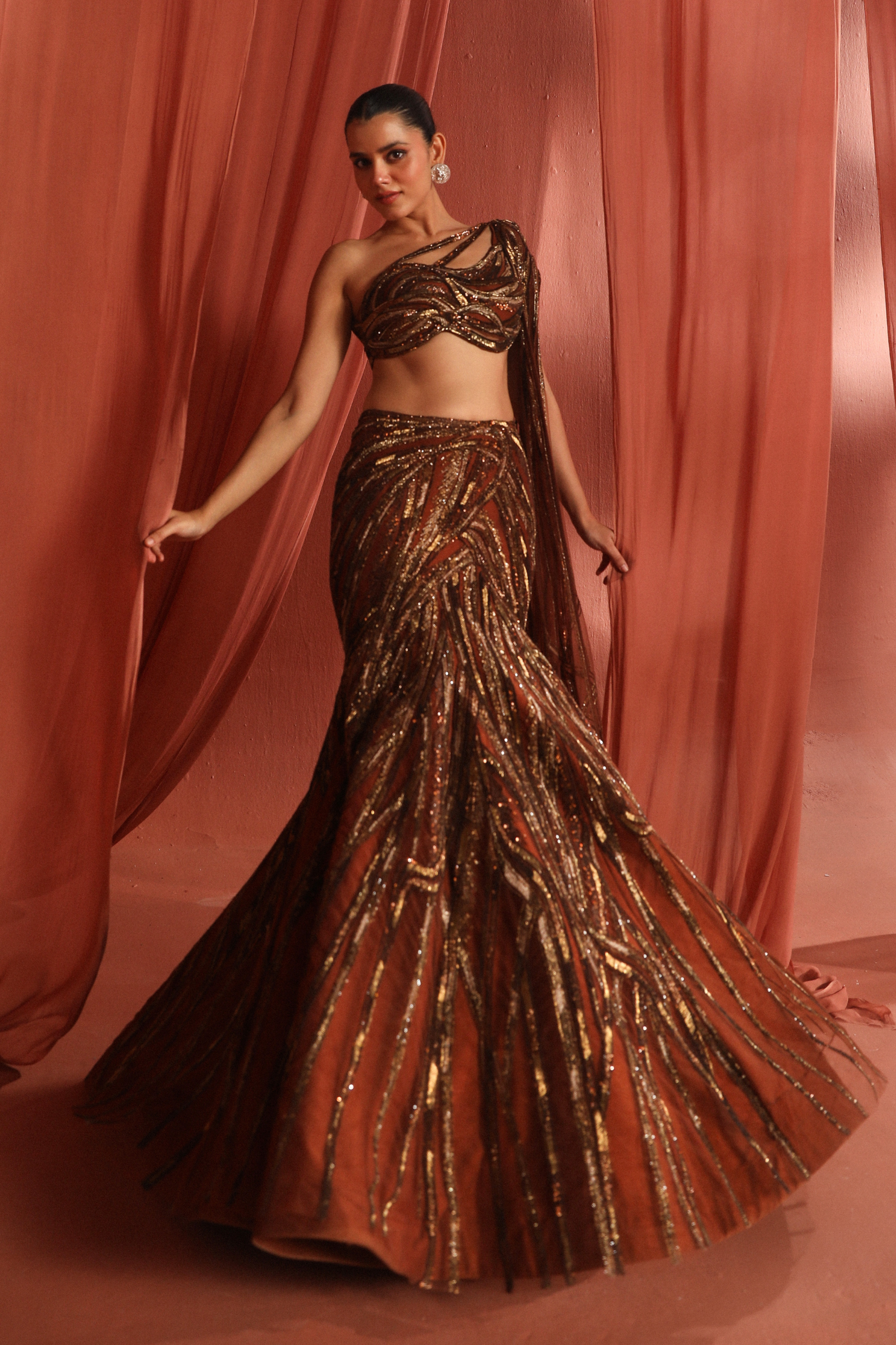 This bronze top and skirt set features bold, flowing lines and intricate dori work. Hand-embroidered with crystals, cutdana, and sequins. It offers a chic, modern look with a touch of luxurious detail, perfect for any special occasion.