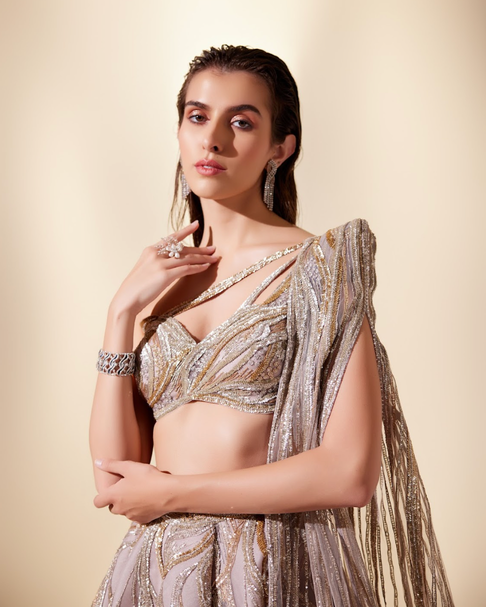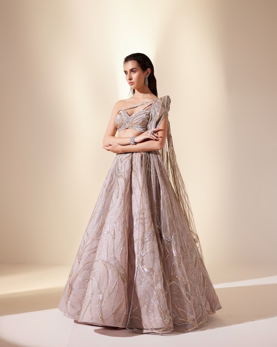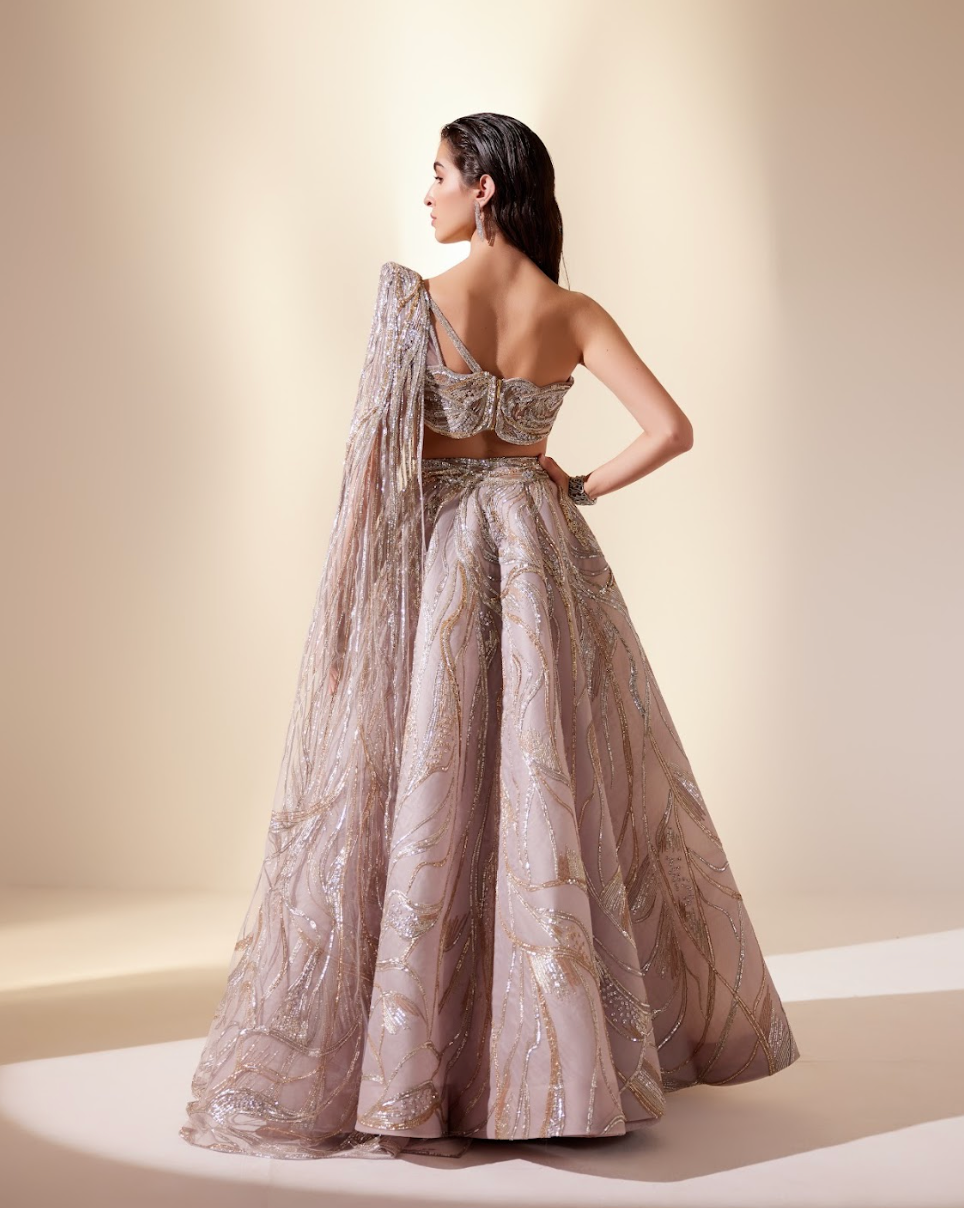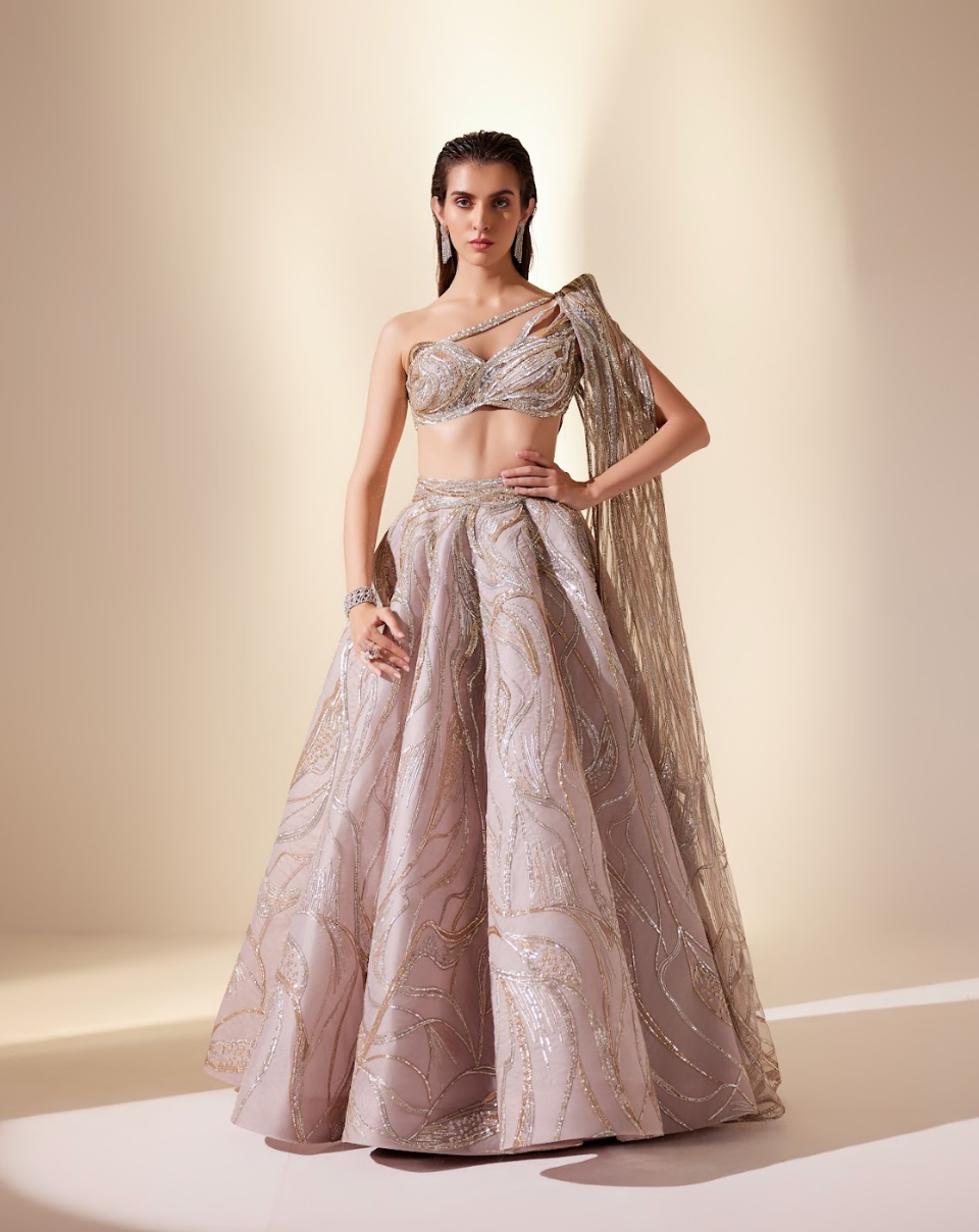 The flowing lehenga, paired with a matching blouse featuring delicate work and corsages on shoulders with brimming dramatic drapes.