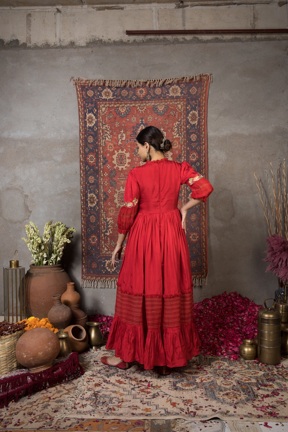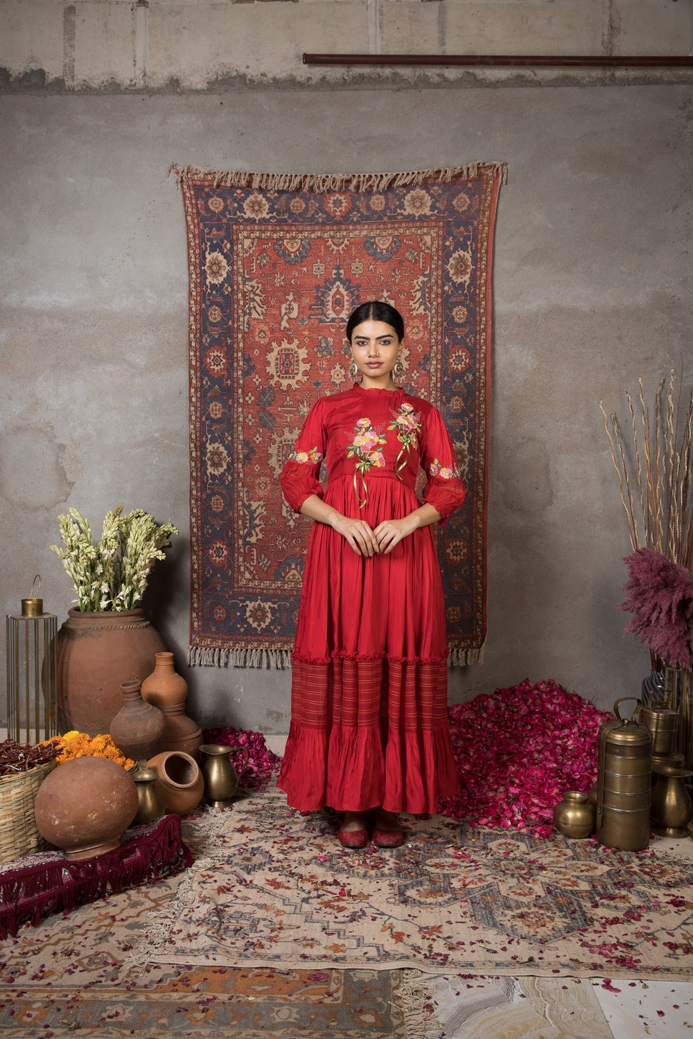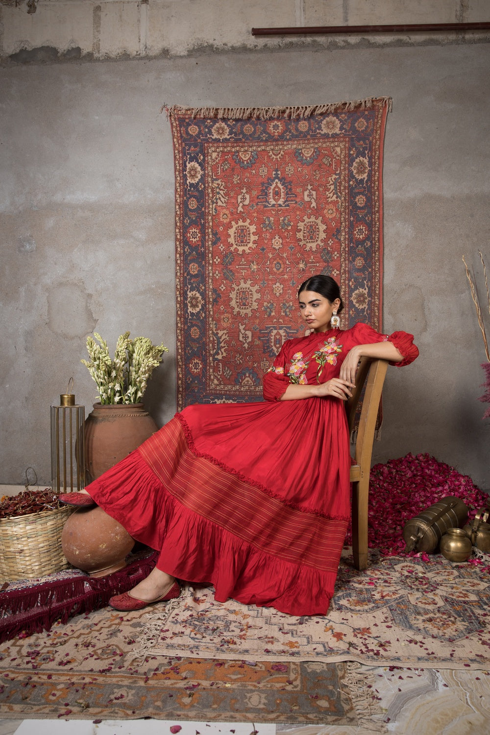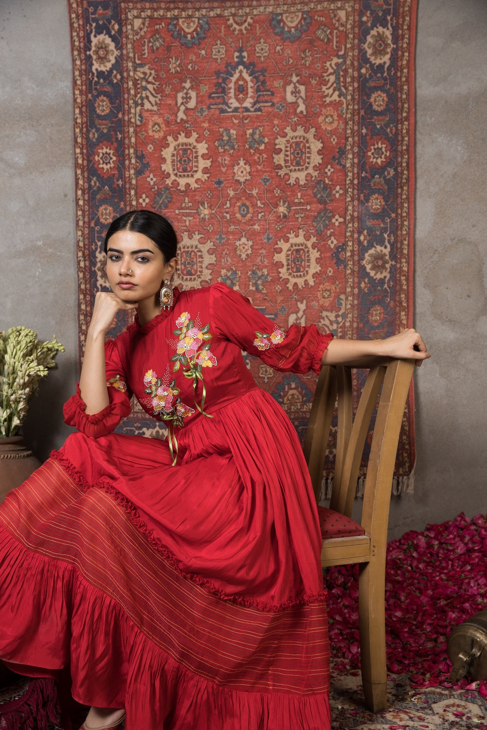Featuring mesmerizing scarlet red silk dress, herading a modern reinterpretation of traditional elegance. This versatile ensemble is perfect for attending bridal ceremonies exuding regal beauty.