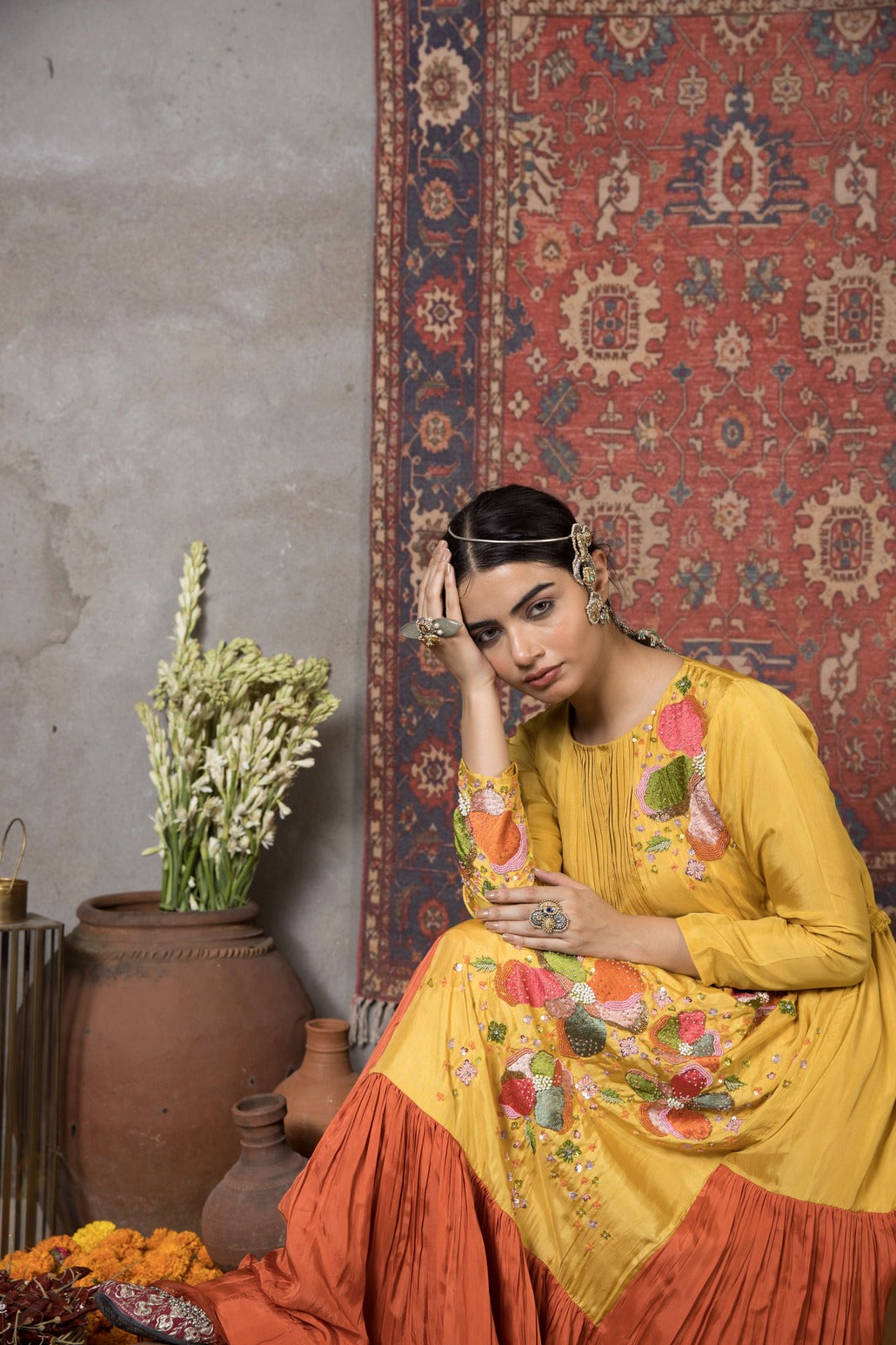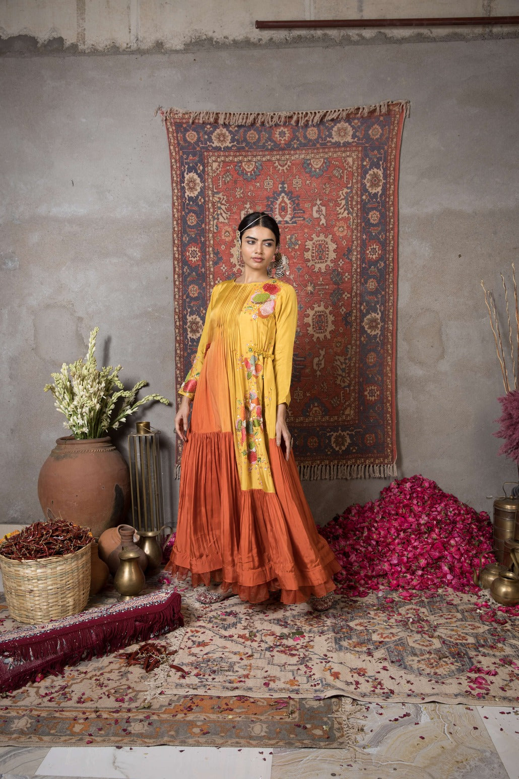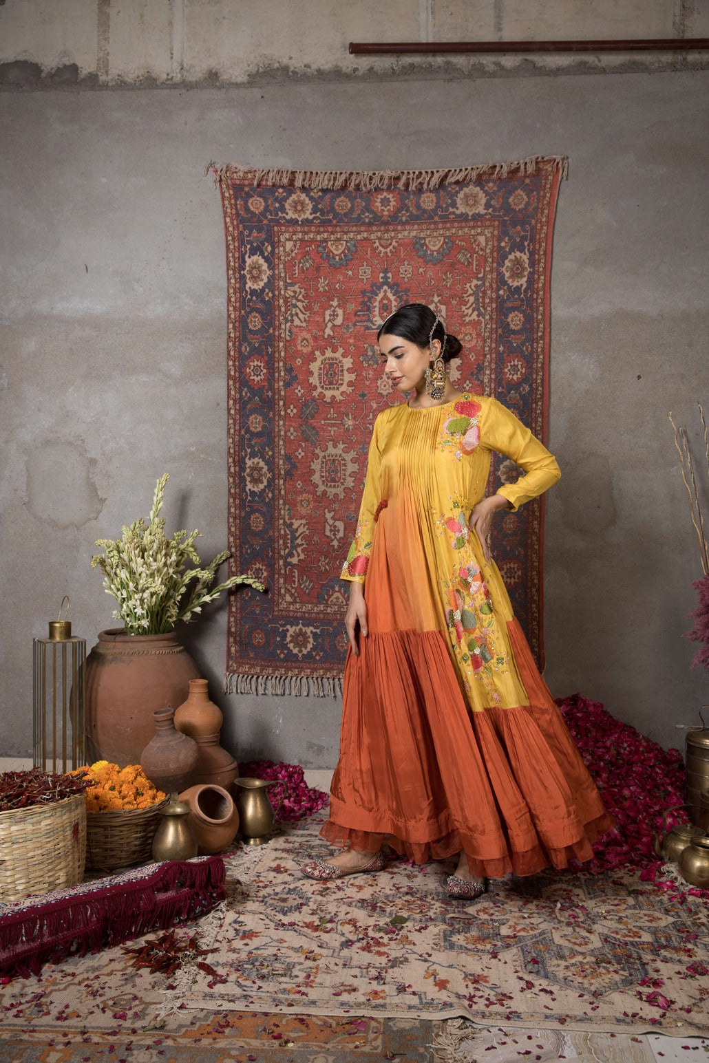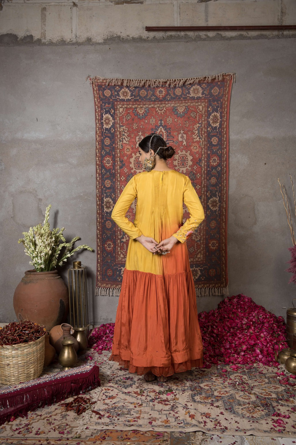 Featuring mesmerizing sunset yellow and orange shaded dress, herading a modern reinterpretation of traditional elegance. This versatile ensemble is perfect for attending bridal ceremonies exuding regal beauty.