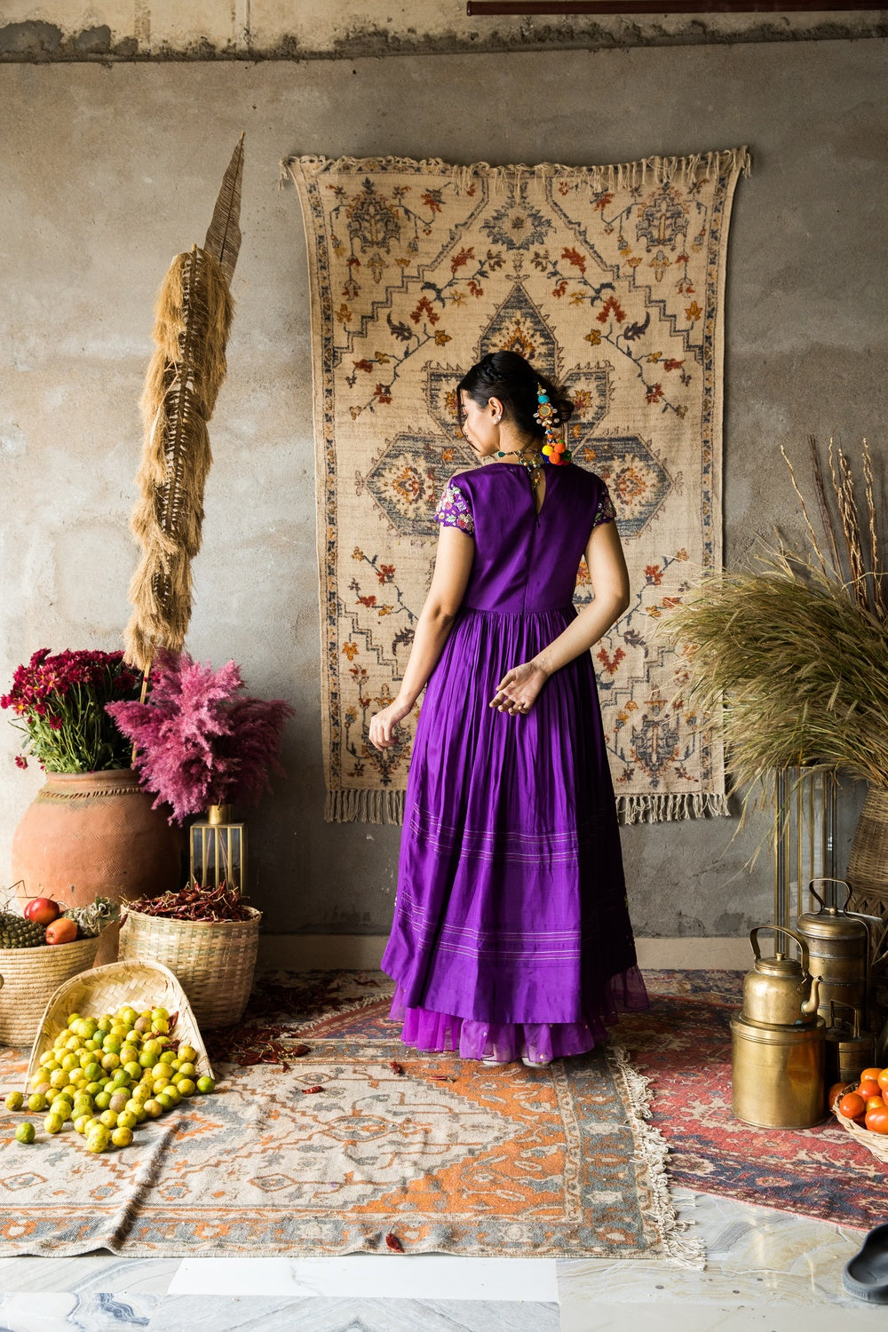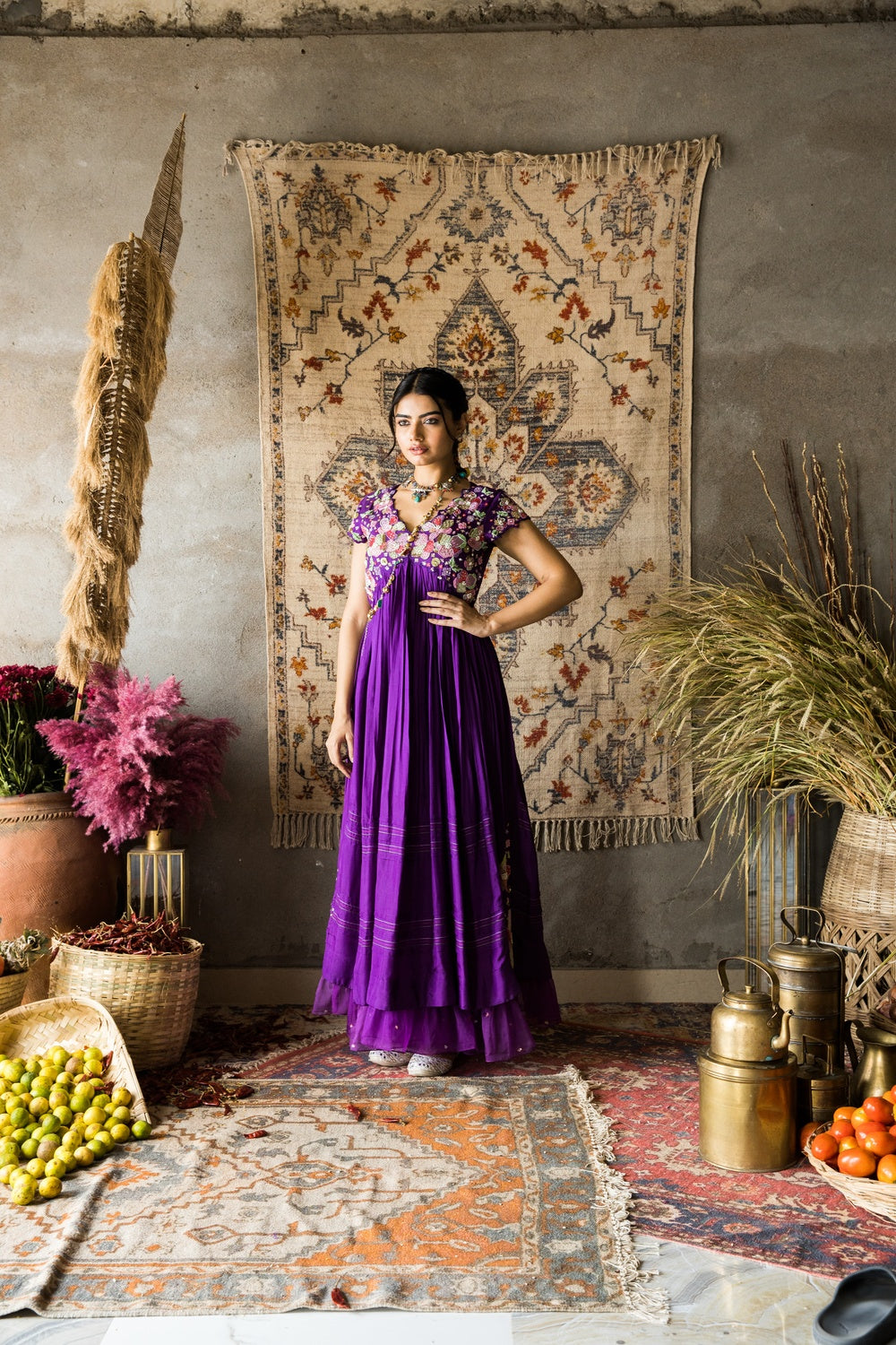 Featuring mesmerizing twilight purple silk dress, herading a modern reinterpretation of traditional elegance. This versatile ensemble is perfect for attending bridal ceremonies exuding regal beauty.