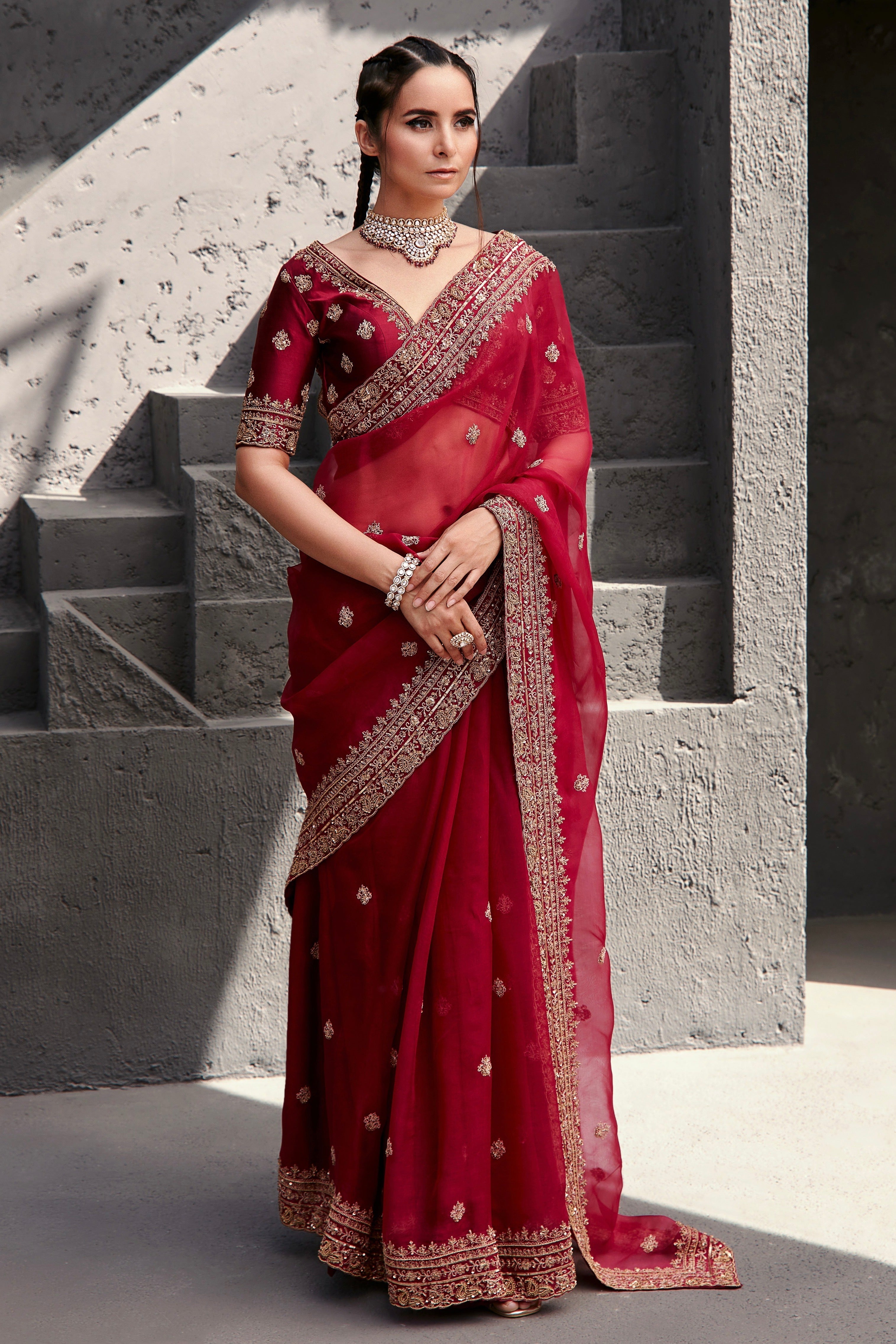Featuring an organza base wine saree paired with a blouse in Chiniya silk with gold dori and aari work