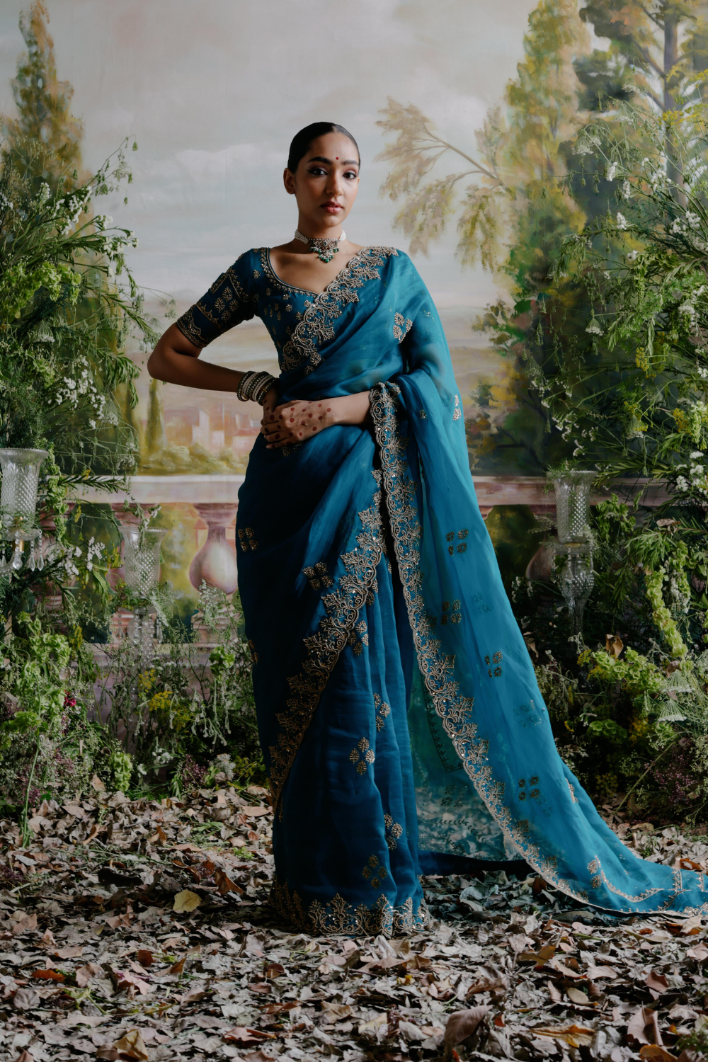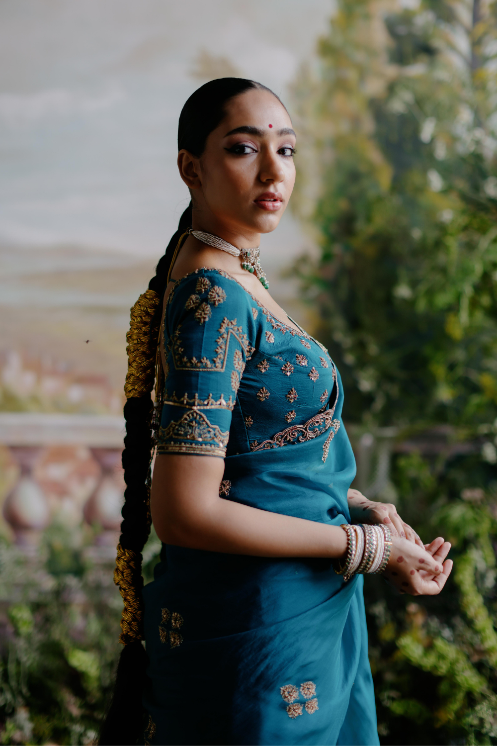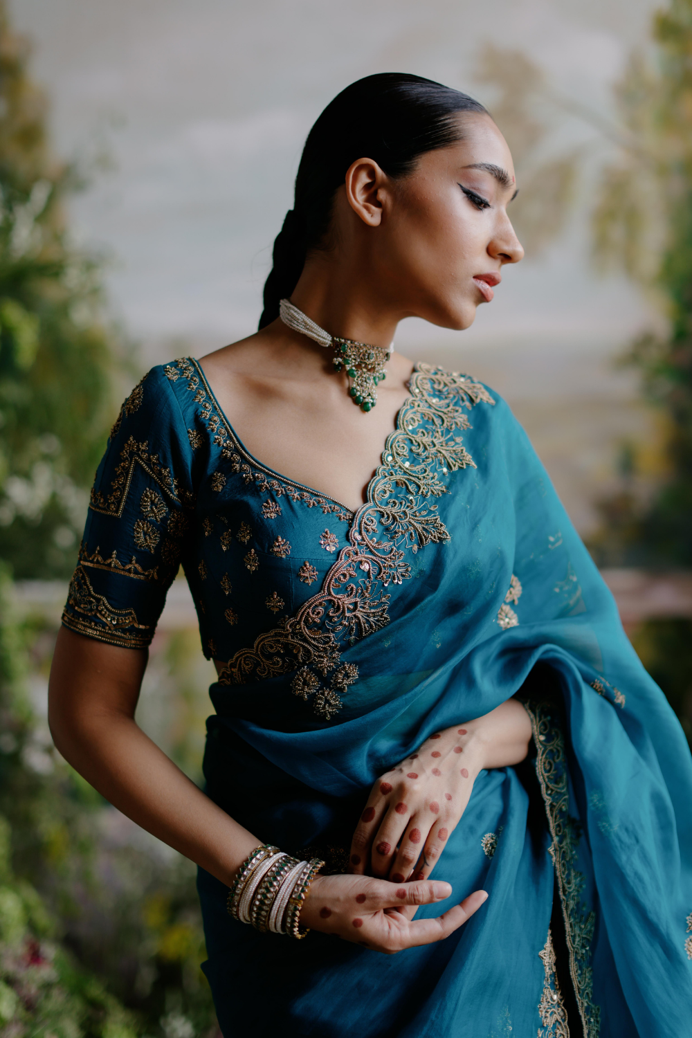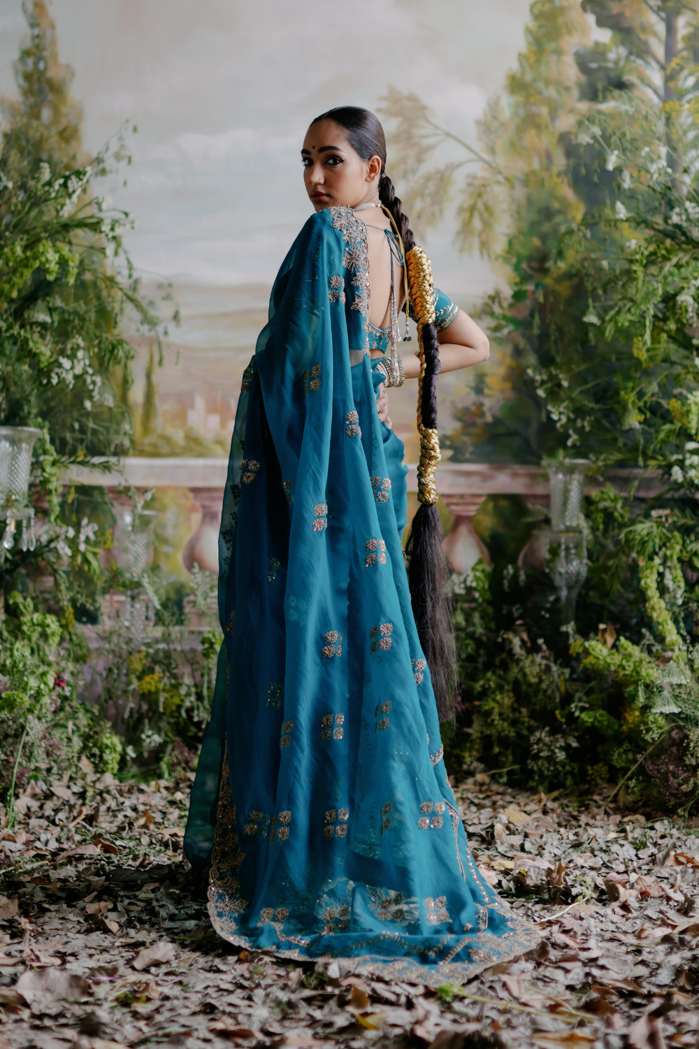 Featuring an organza base teal saree paired with a dupion silk base blouse with antique gold dori and embellished handwork.