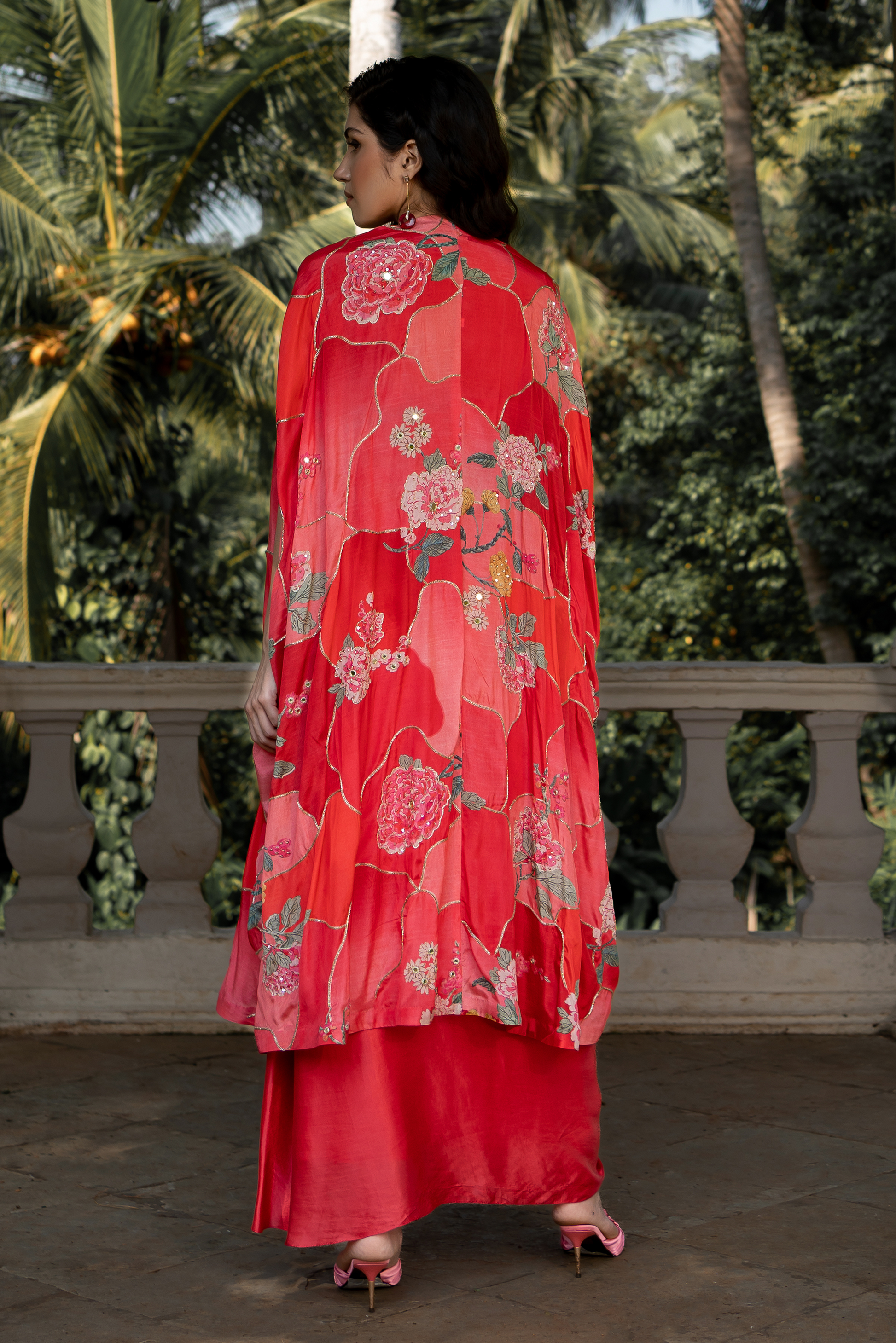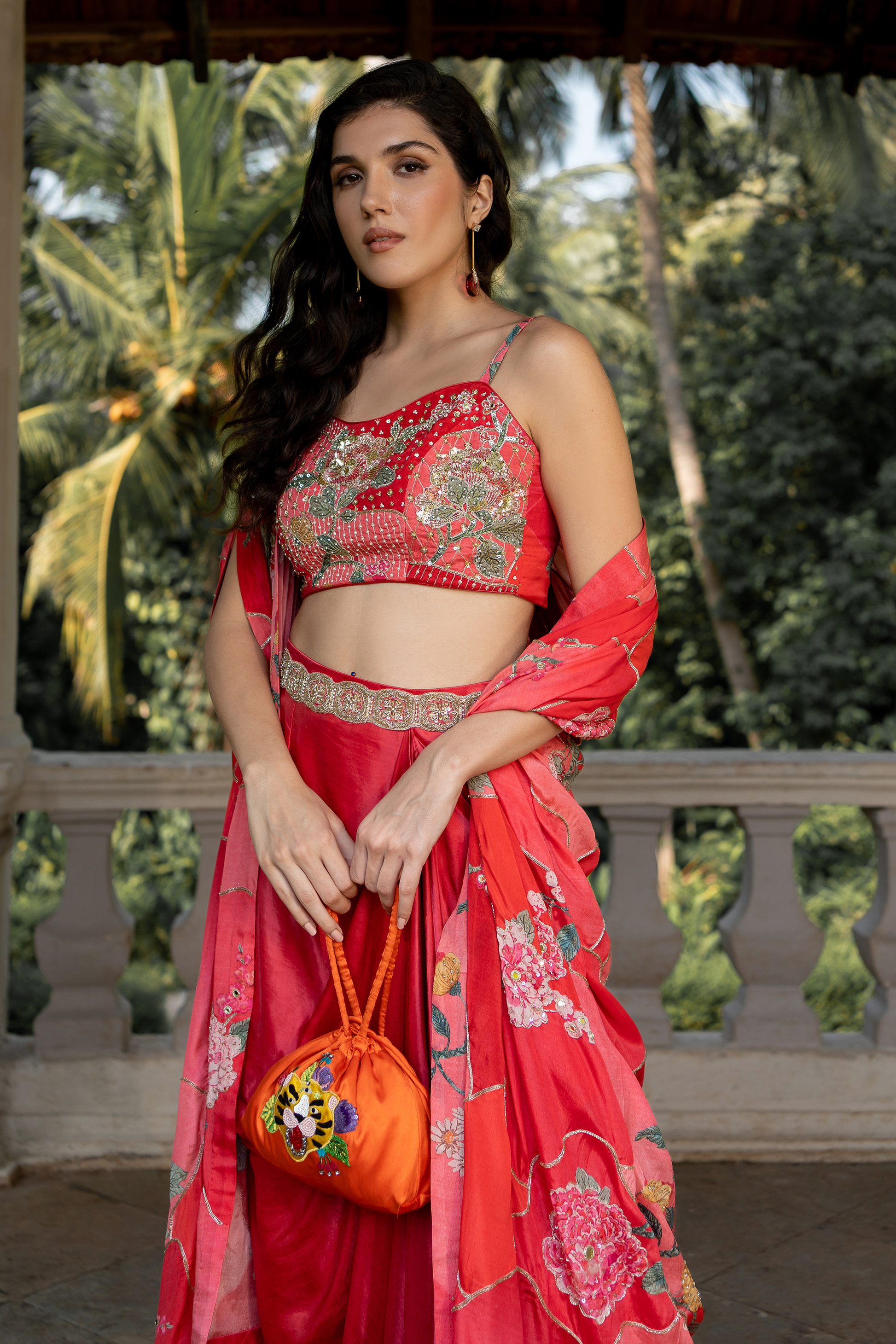 A cherry red jacket set crafted in our signature nasha print and tailored from pure fabrics. The blouse is hand-embroidered in mirror, resham thread, nakshi, cutdana, moti, sequins. The jacket is sprinkled with khatli embroidery and it is paired with satin pre–draped skirt. It is paired with cutdana hand embroidered belt to add beauty to the set.