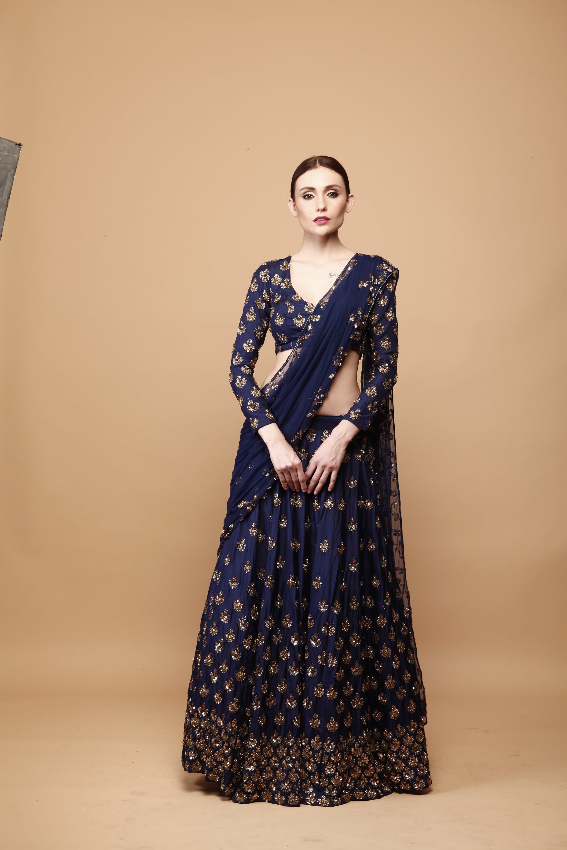 Featuring a NAVY BLUE EMBROIDERY BOOTI LEHENGA SET IN SILK.