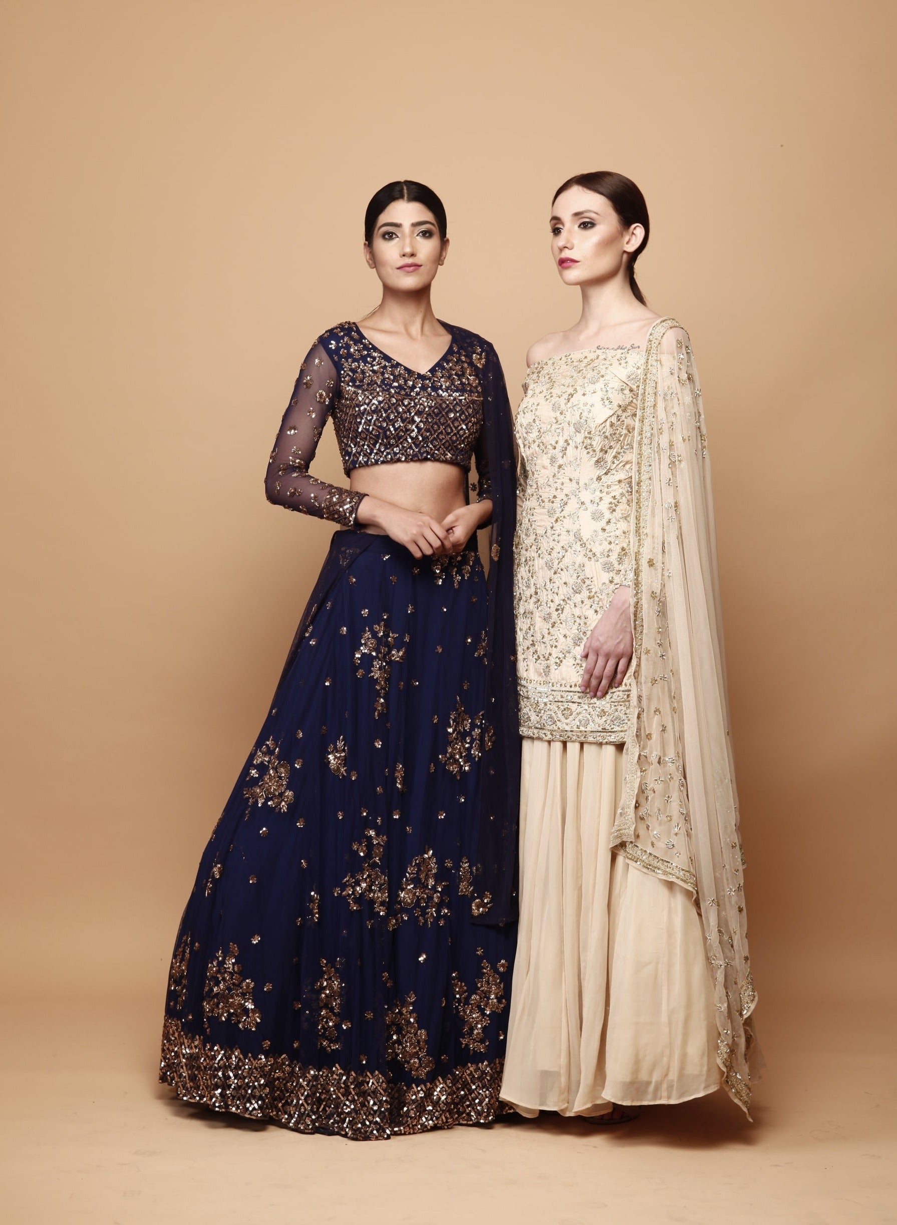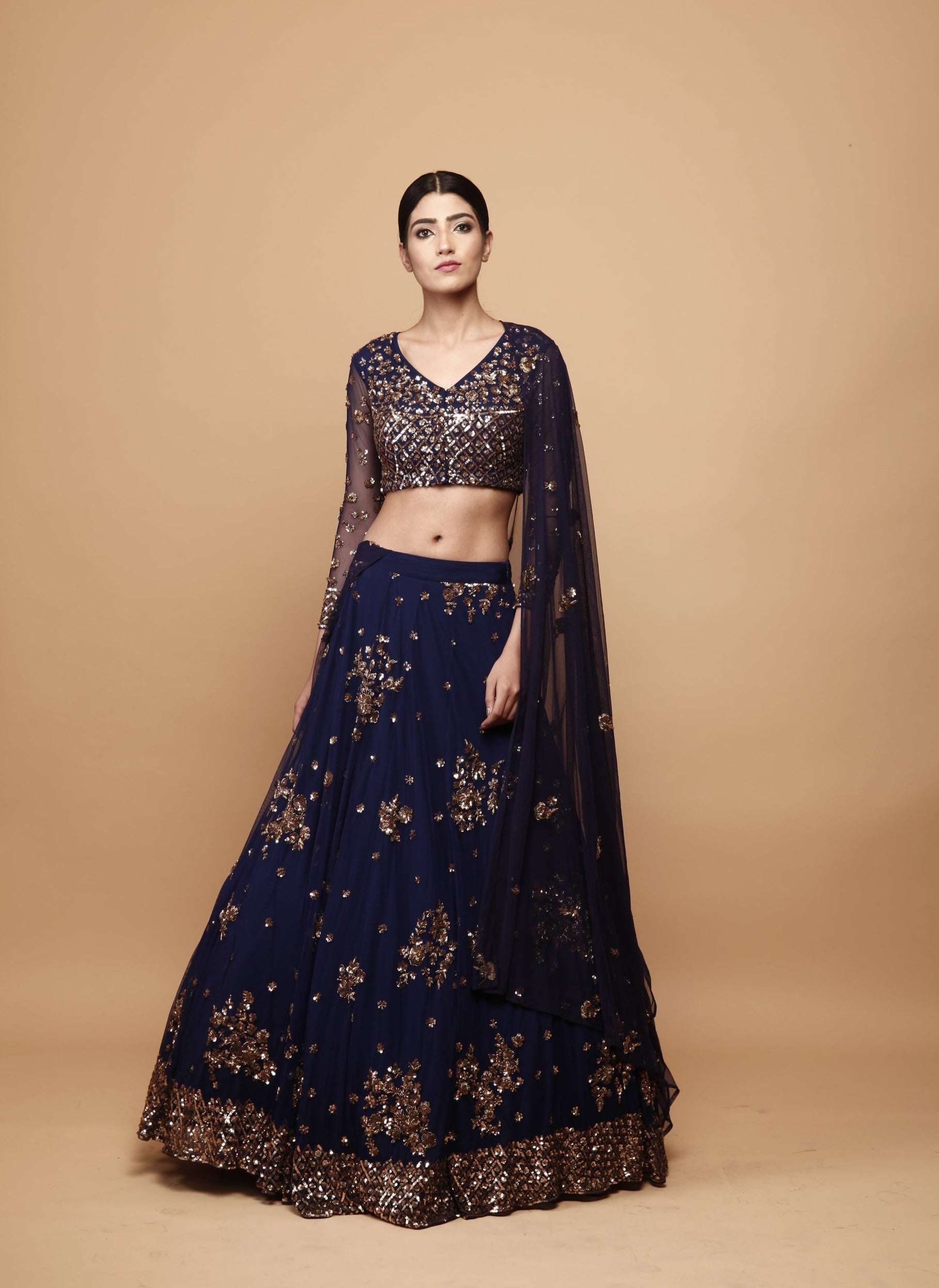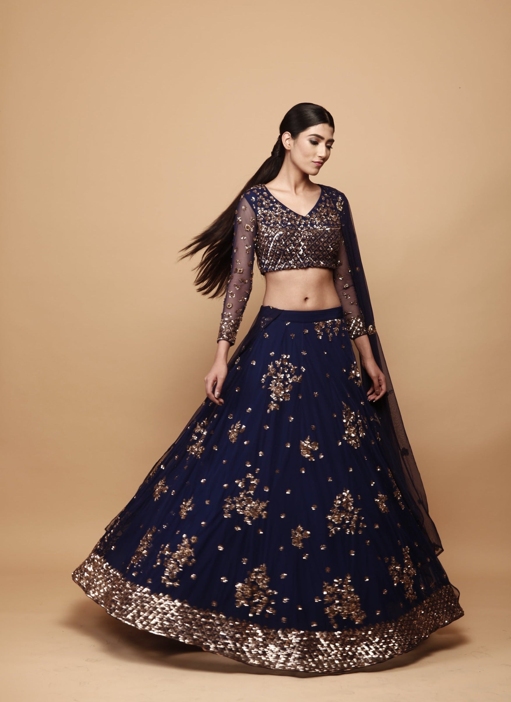 Featuring a NAVY BLUE FLORAL LEHENGA SET IN NET.