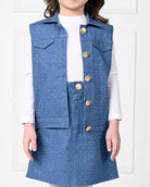 This versatile navy blue sleeveless denim jacket is a must-have addition to any wardrobe. Made of high-quality denim, it is both durable and stylish. The sleeveless design allows for easy layering and the classic navy blue color goes with any outfit. Perfect for any season, this jacket is a timeless piece that will elevate any look.
