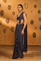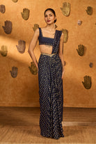 Details: Stitched Saree- Beautiful Stillwater placement foil print on the pallu, complemented by an all-over snowlight foil print across the saree | Finished with an intricately embroidered waistband for a touch of elegance. Blouse- Scoop neckline with a center back opening for a refined, classic finish