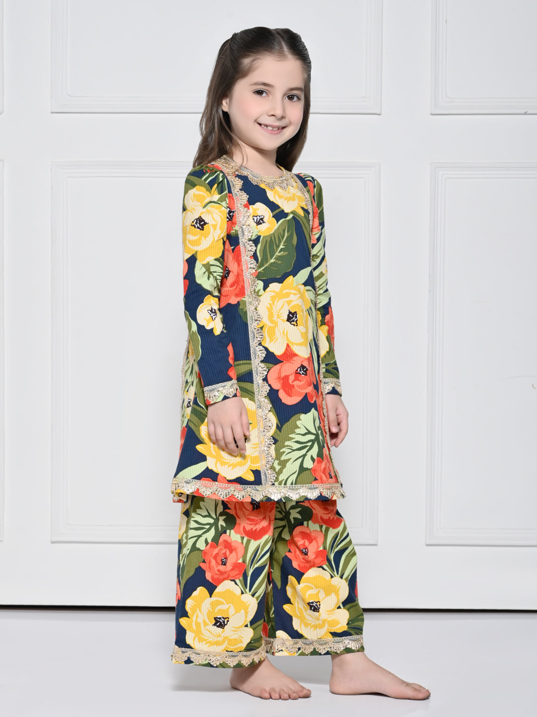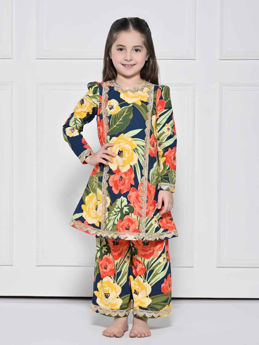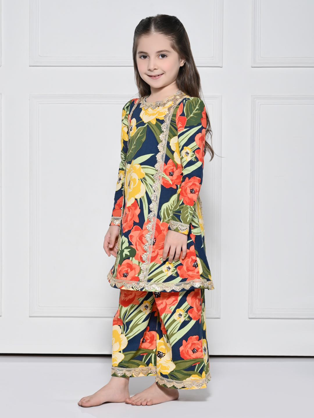Navy Floral - A Navy Blue Cotton Suit with a Bold Floral Print for girls