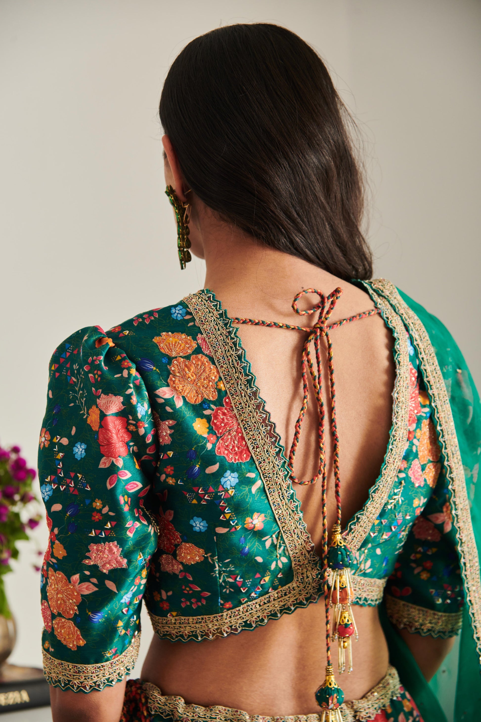Emerald floral printed lehenga with hand embellished golden cord with multicolored thread and sequence details comes with a v cut blouse and organza dupatta with golden