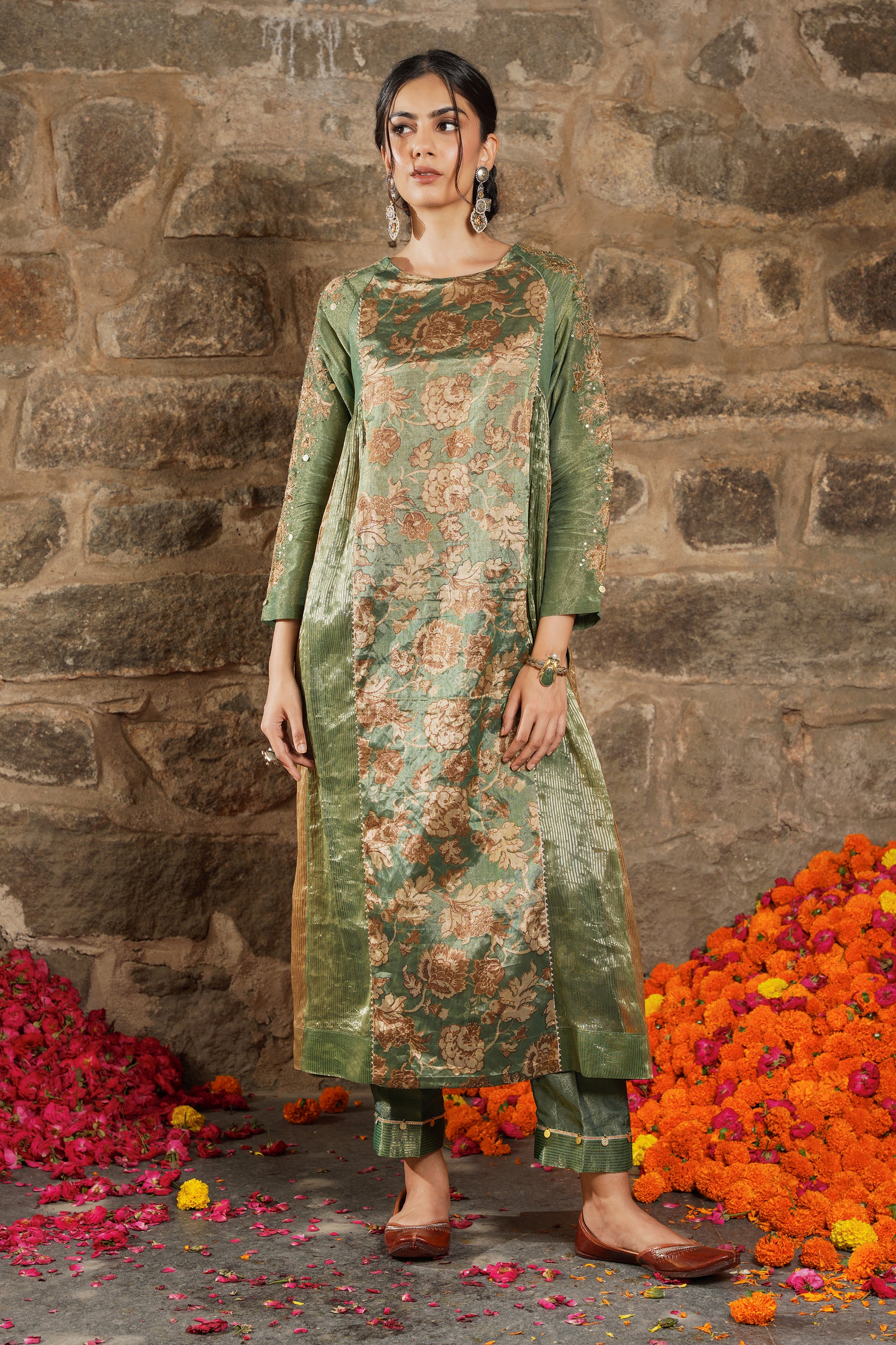 Forest green silk tissue kurti set is a glamorous and elegant ensemble, with its captivating hue with mettalic sheen, is perfect for festivals and special occasions exuding femininity.
