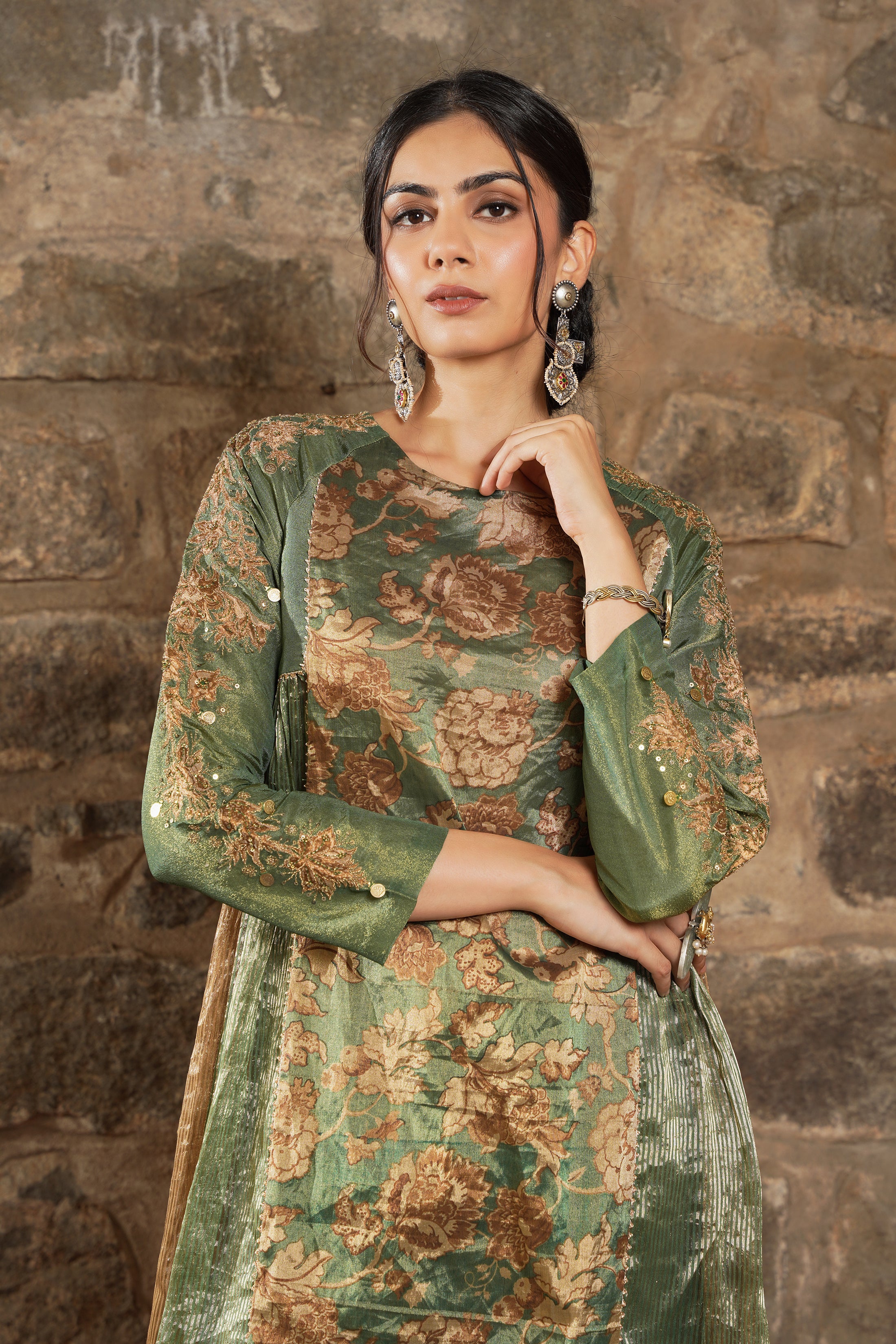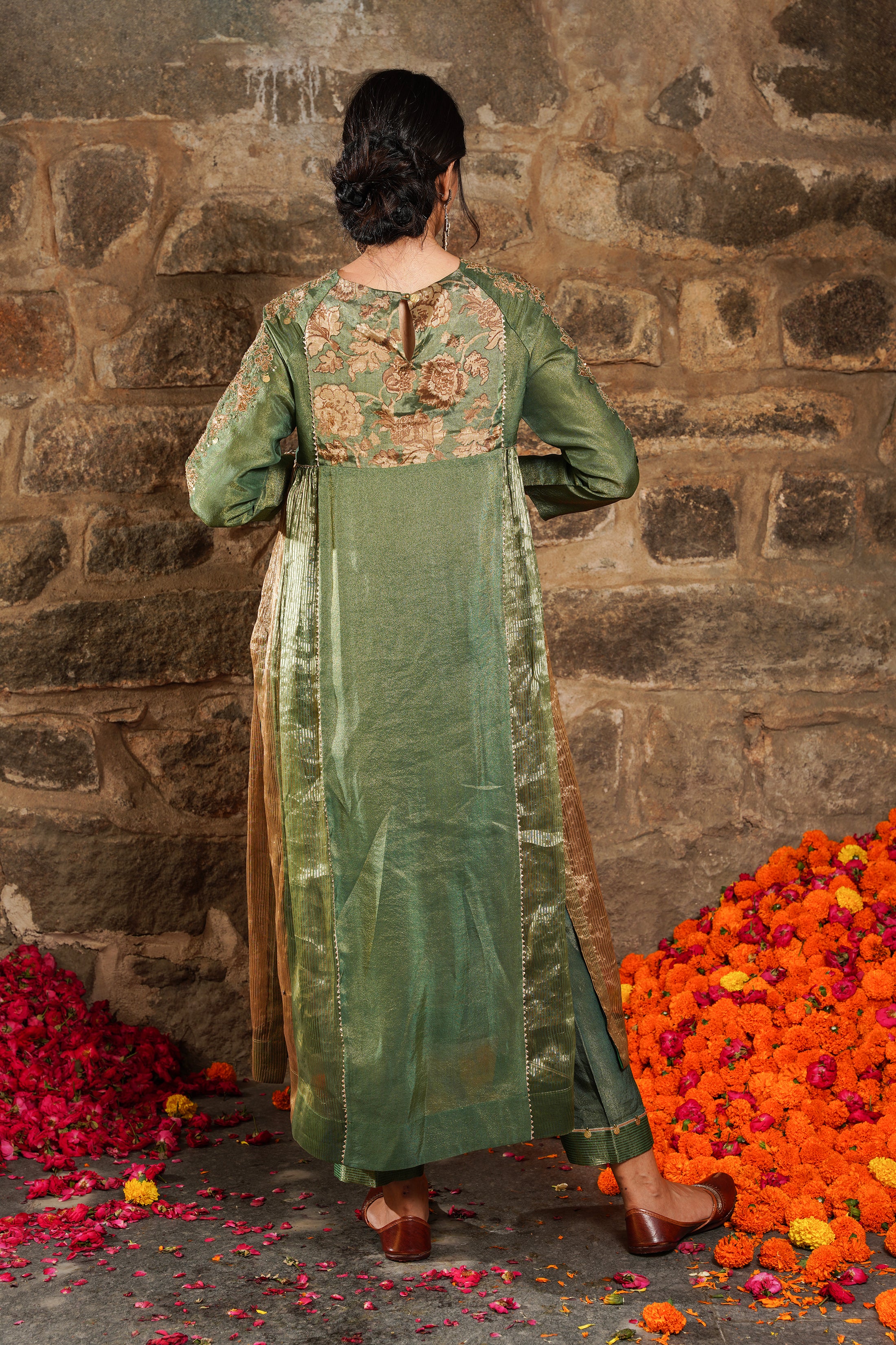 Nazaha- Forest Green Silk Tissue Kurti Set
