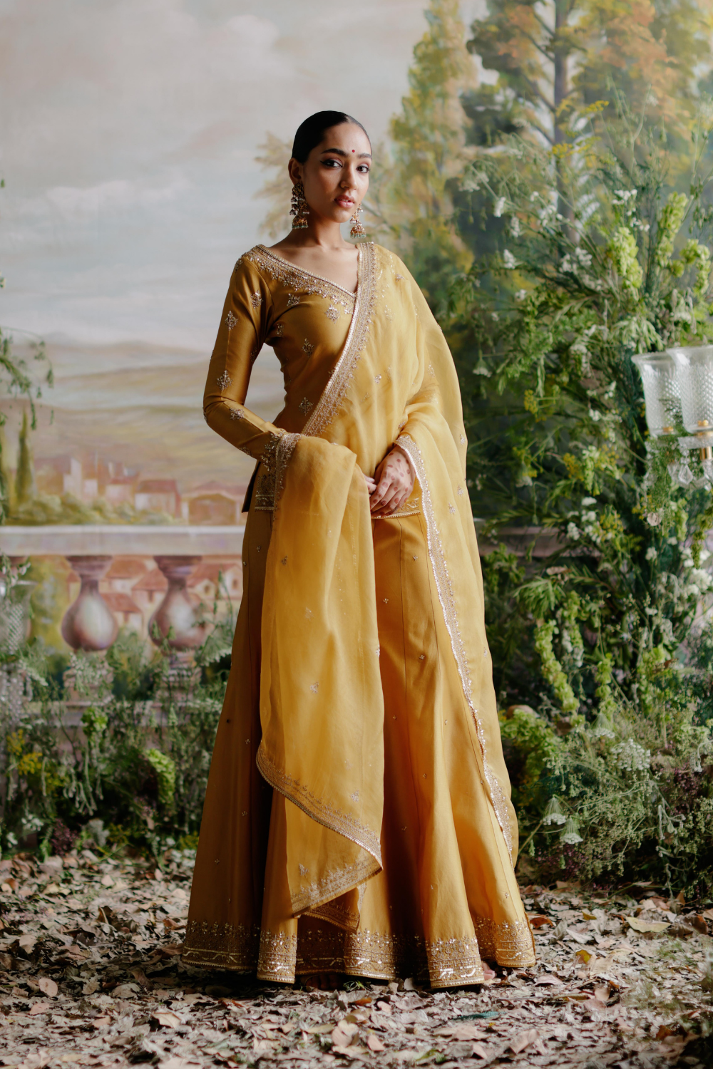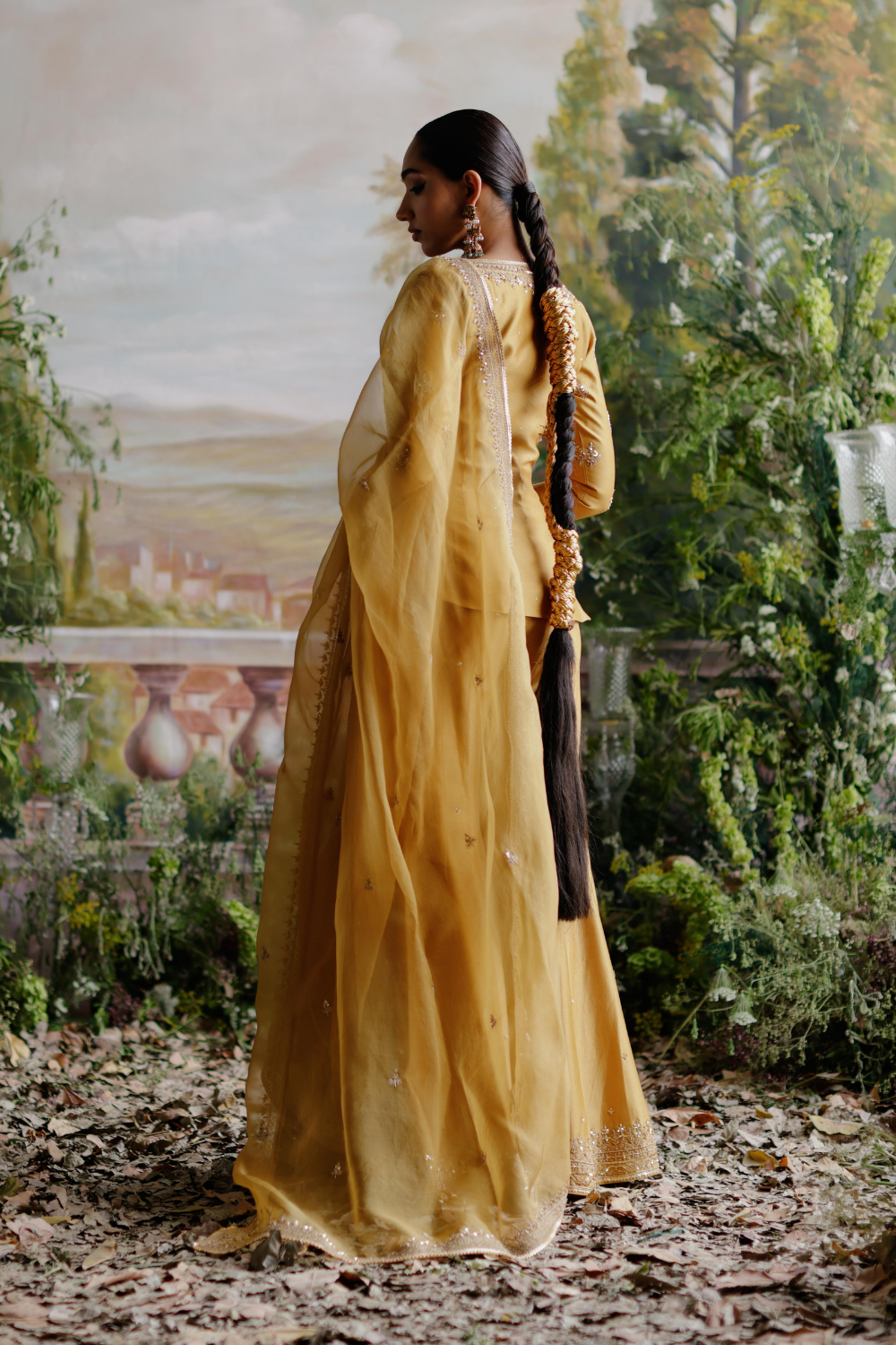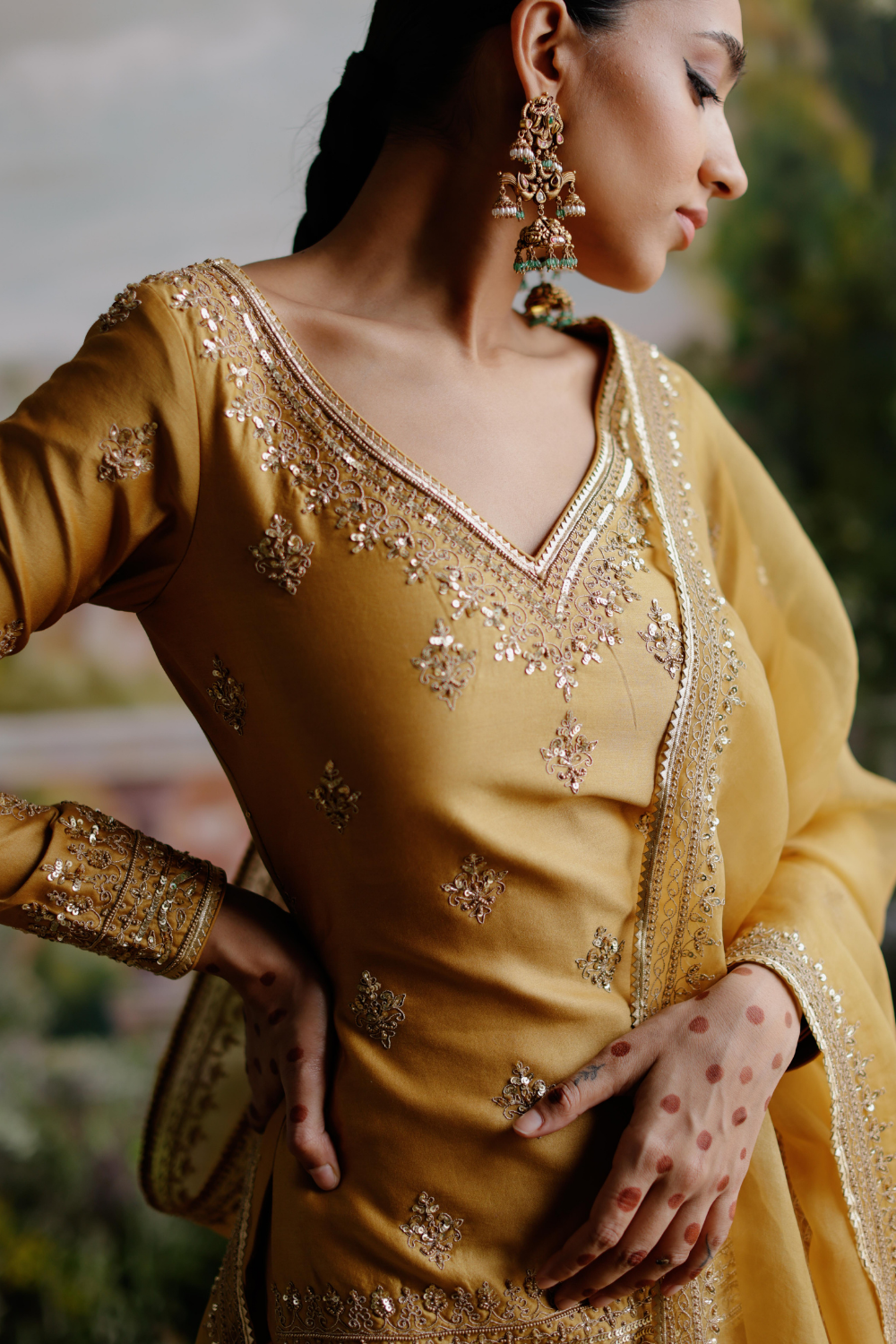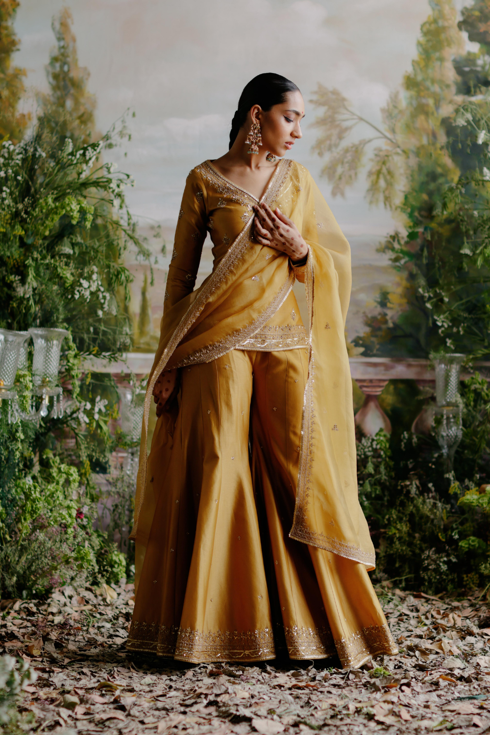 Featuring a Tuscany mustard Chanderi sharara set paired with an organza base dupatta with antique gold dori and aari embroidery.