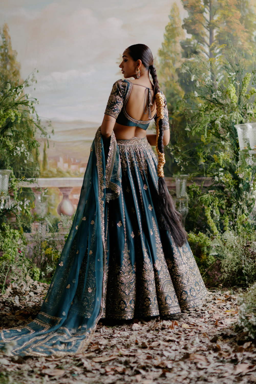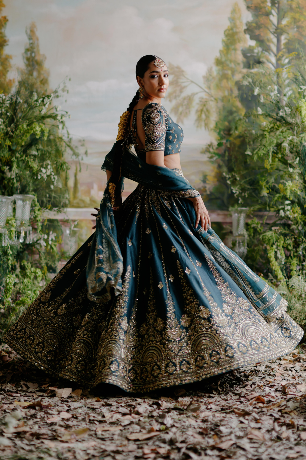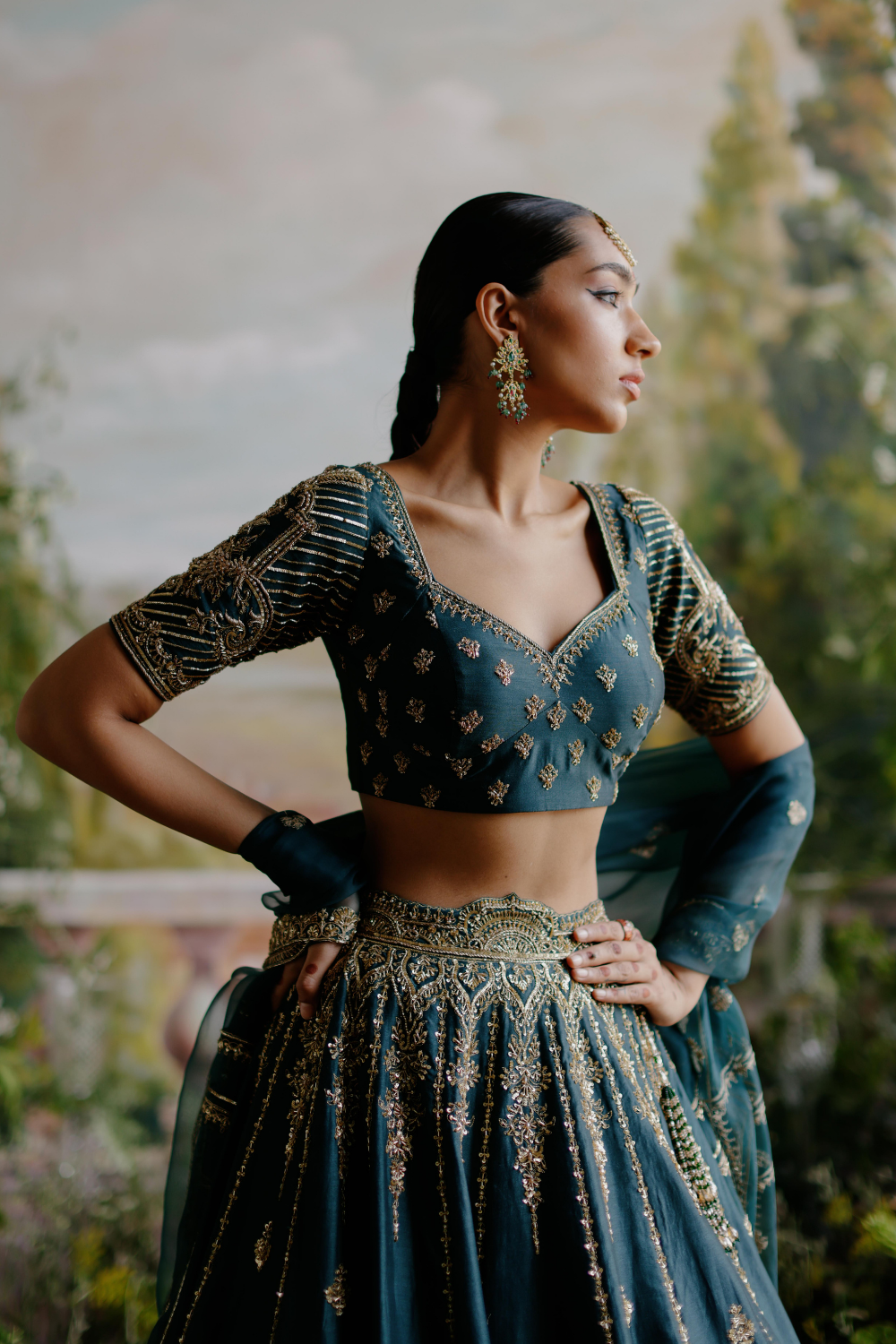 Featuring a dark green Chanderi lehenga set paired with an organza base dupatta with antique gold dori and embellished hand embroidery.
