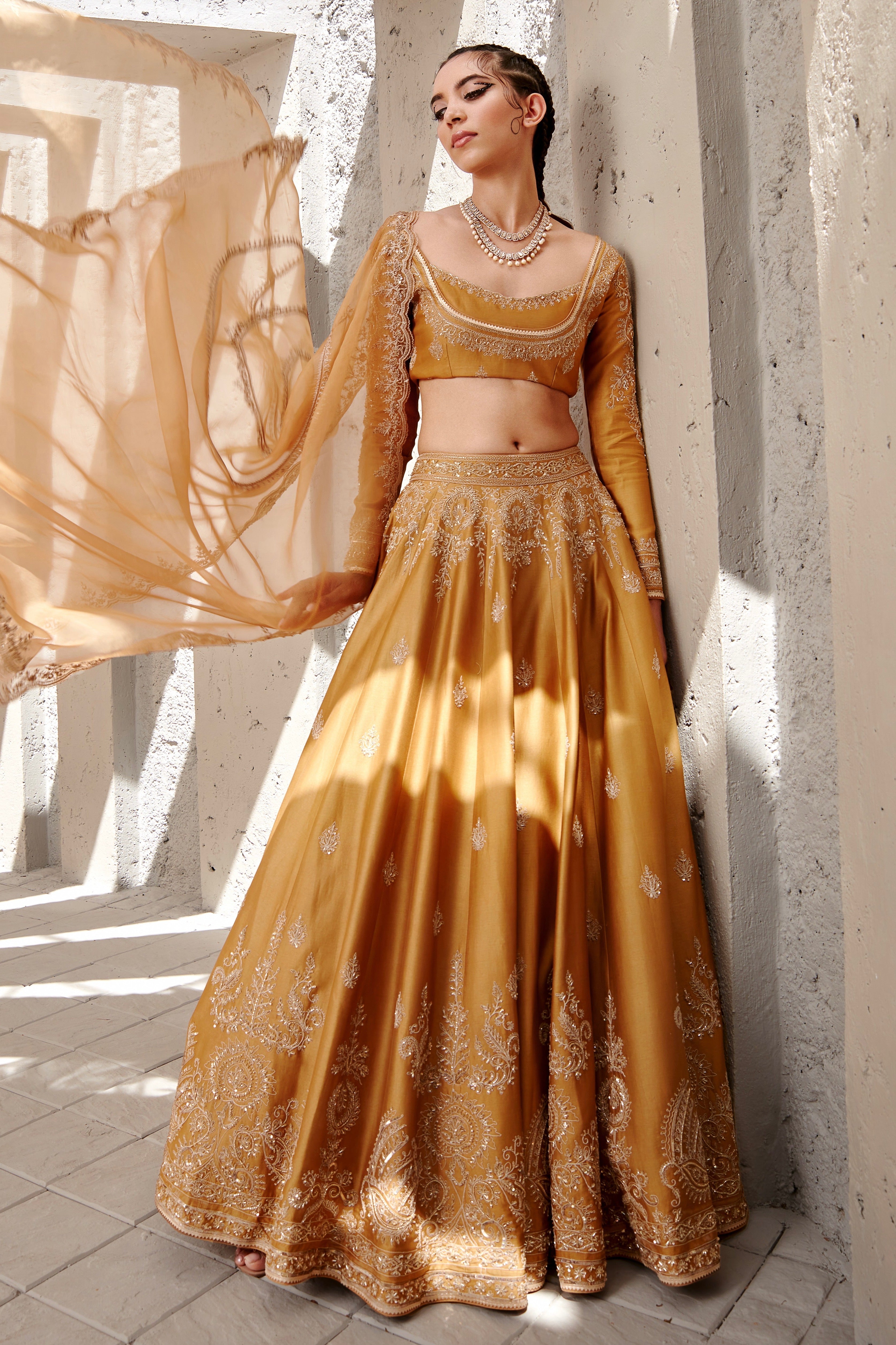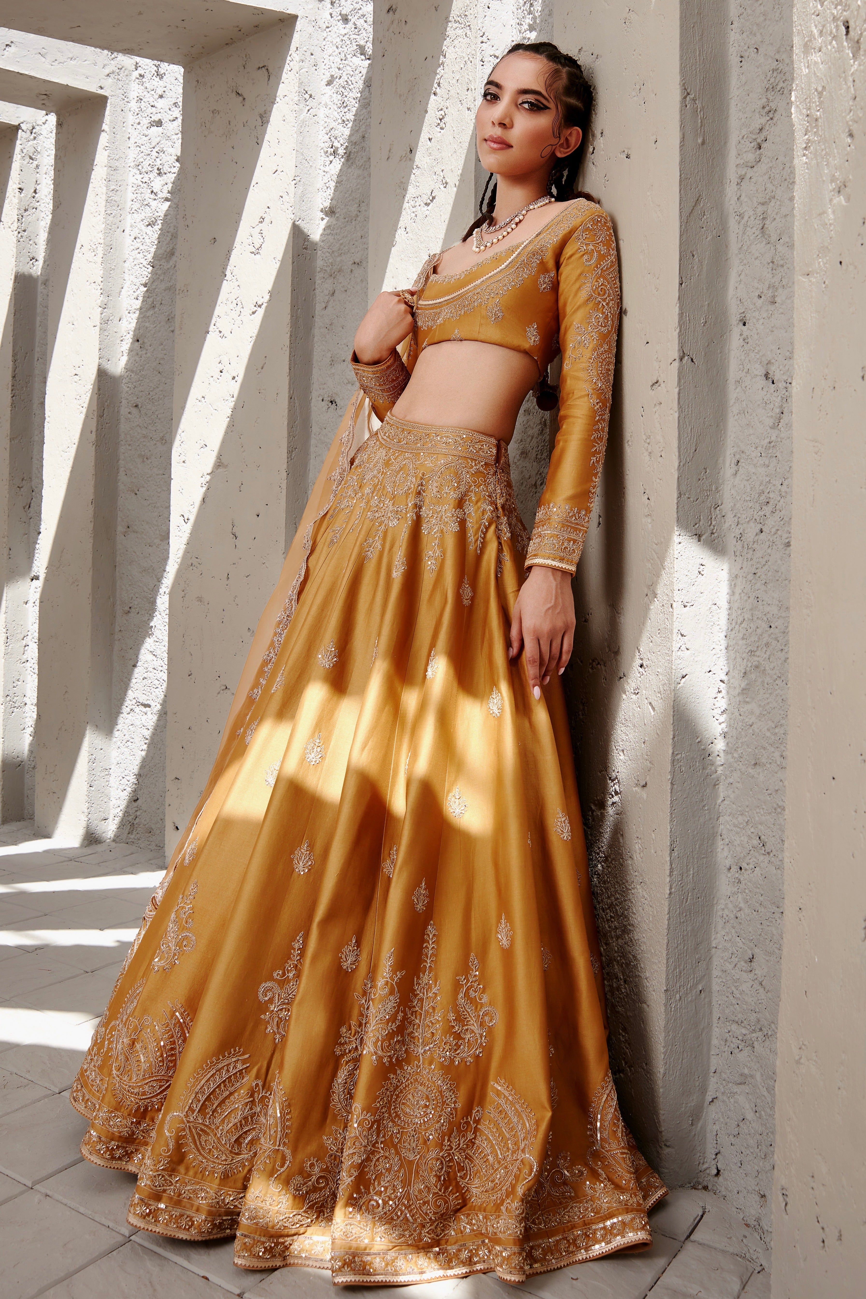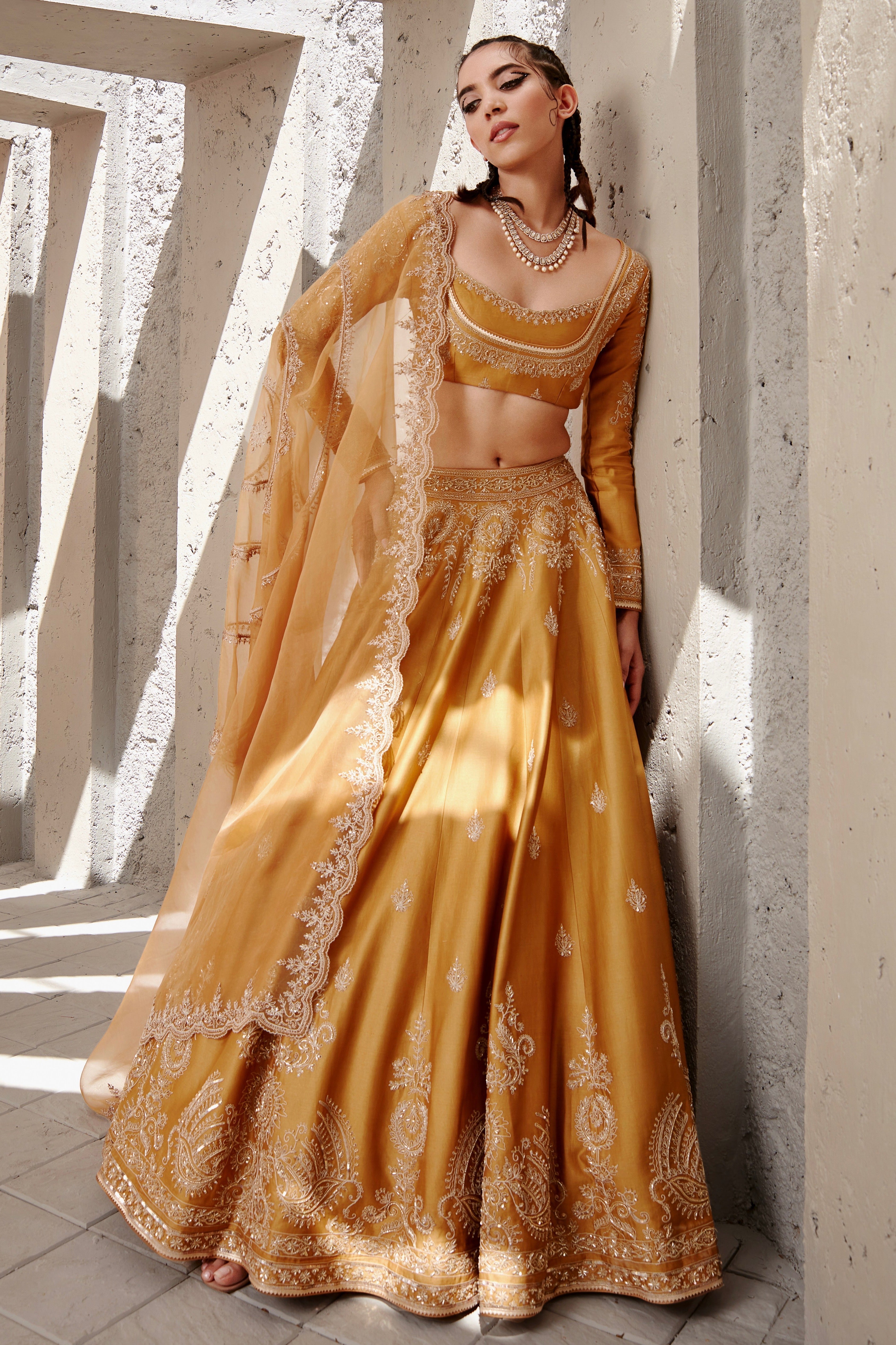 Featuring a mustard Chanderi Lehenga set paired with organza base dupatta with gold dori and aari embroidery