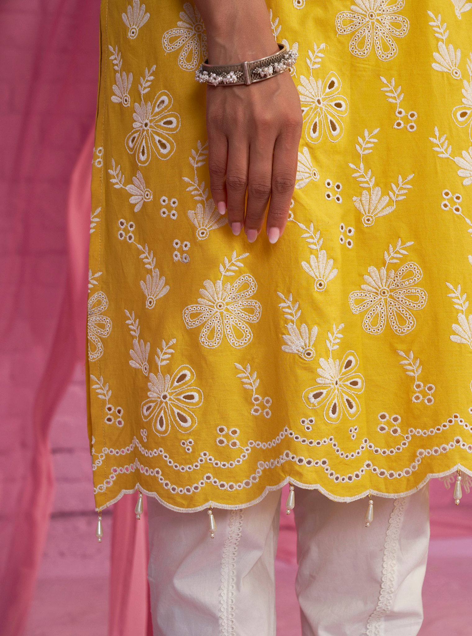 Infuse your wardrobe with the vibrant spirit of sunshine and elegance with this vibrant yellow kurta set. The kurta is adorned with delicate white thread floral embroidery that creates a stunning contrast against the vibrant base, exuding an aura of freshness. The notched neckline is adorned with white intricate embroidery and the hemline is scalloped with delicate pearl hangings.