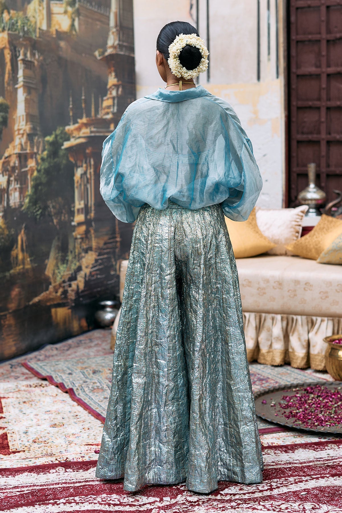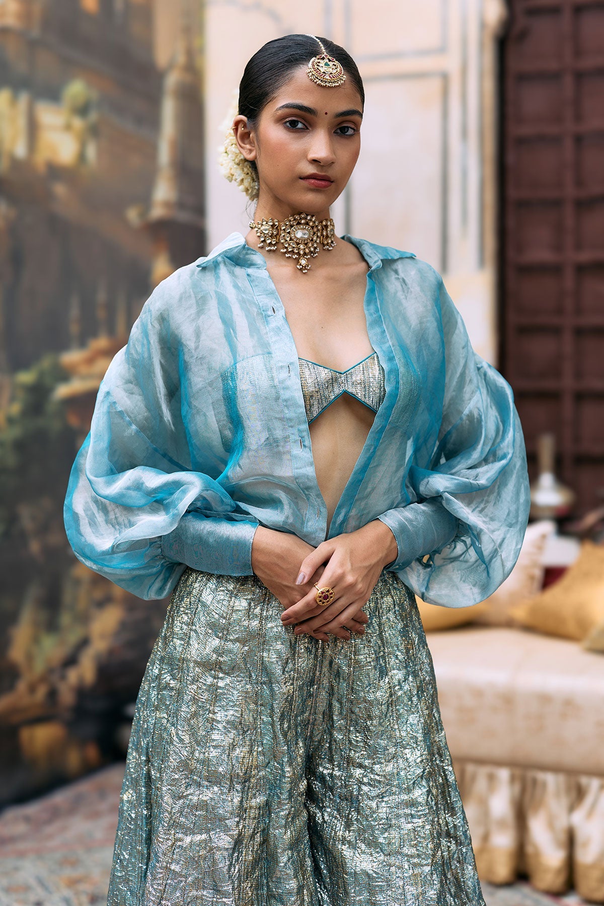 Blue lampi sharara with blue lampi bralette that is paired with the same colour tissue shirt.