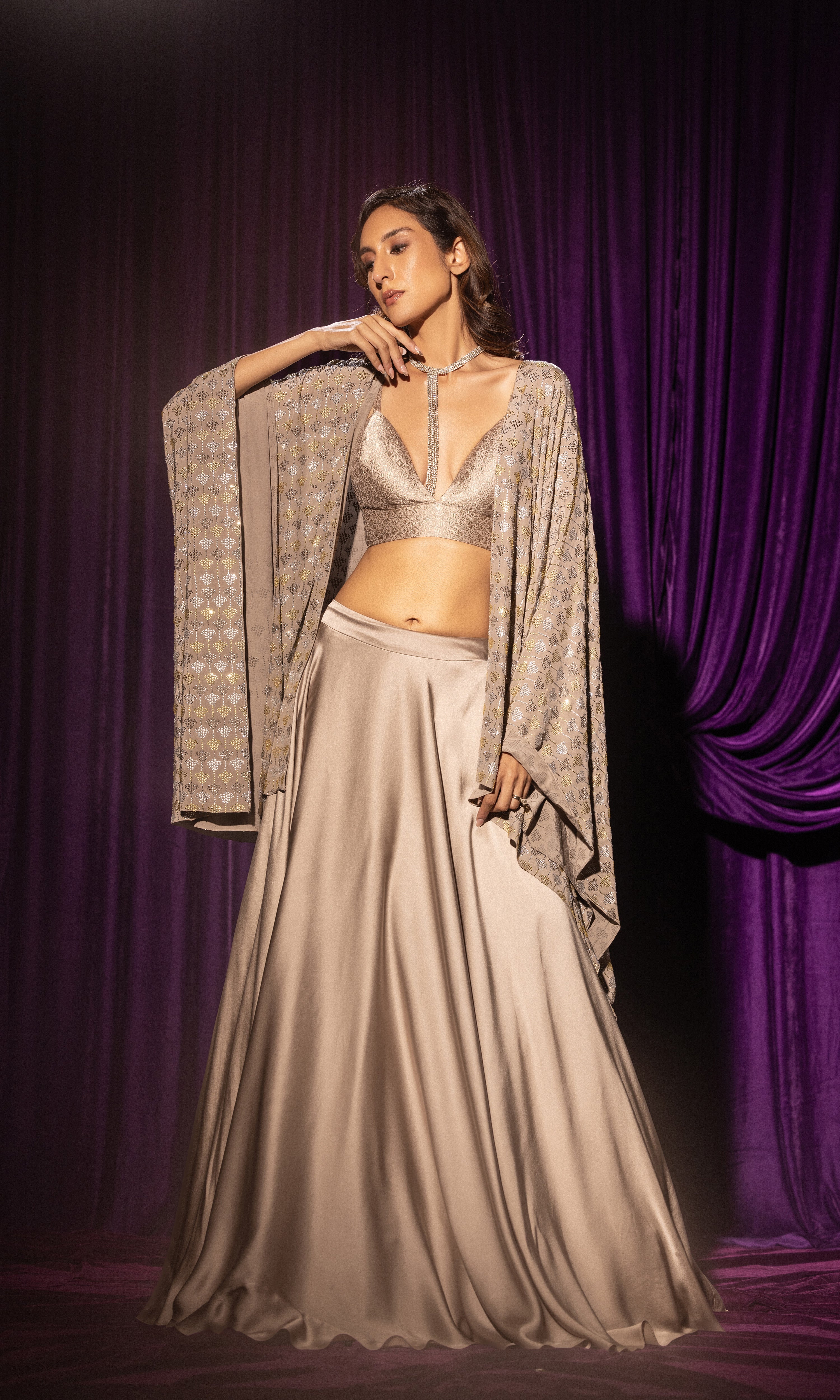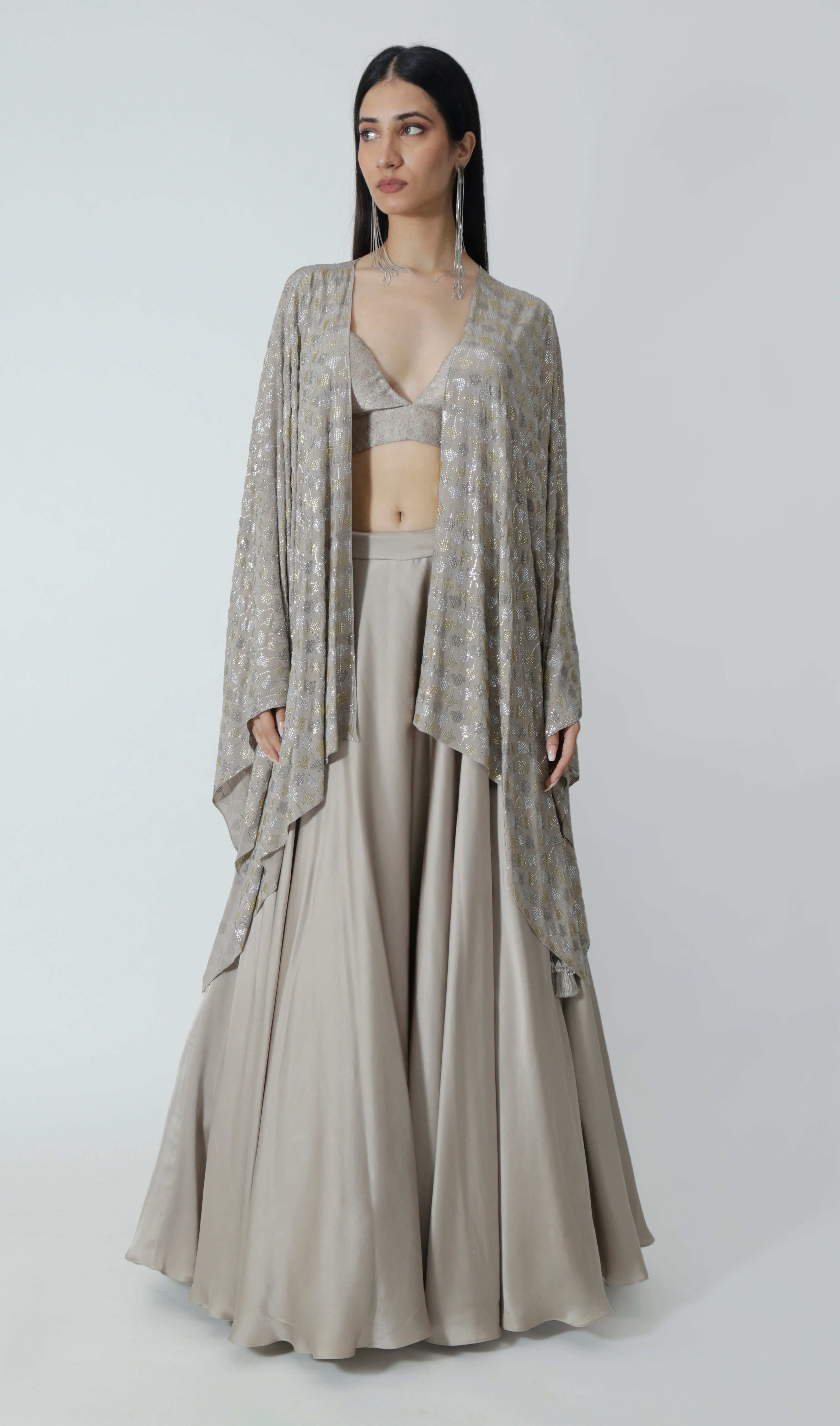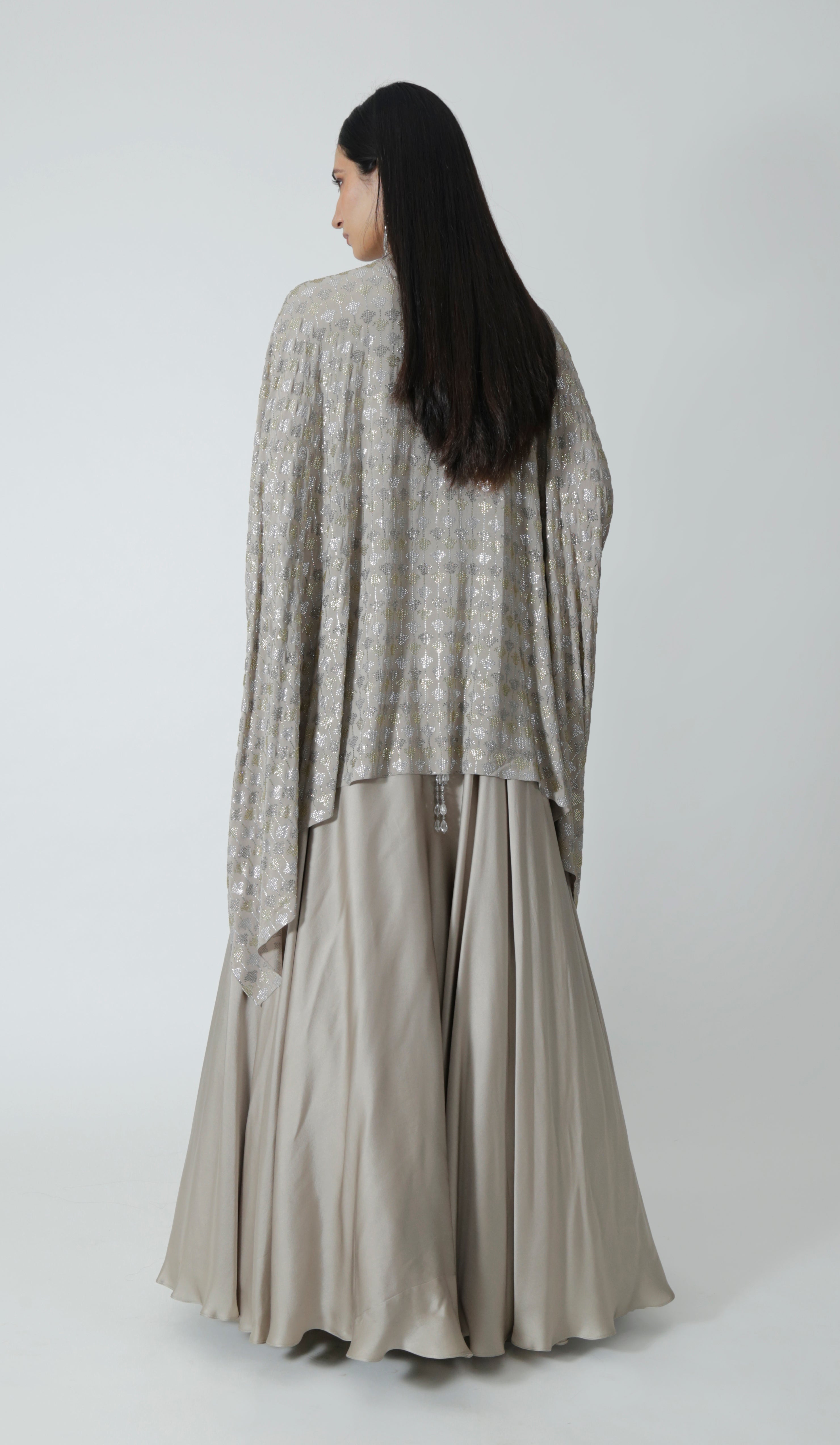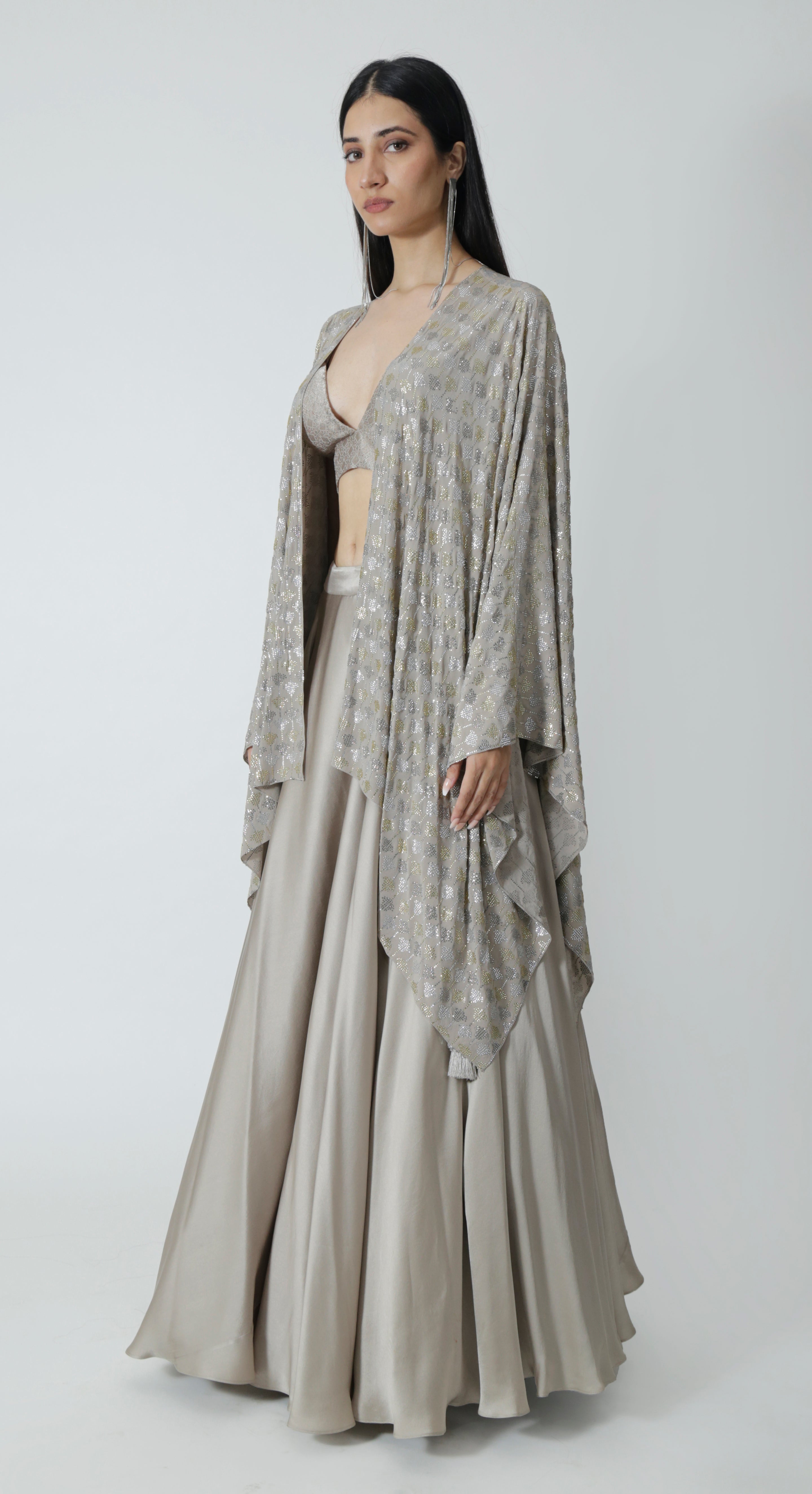 A Silver Grey silk satin skirt, accented with tassels and paired with brocade bralette, accented with rhinestones encrusted cape.