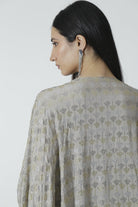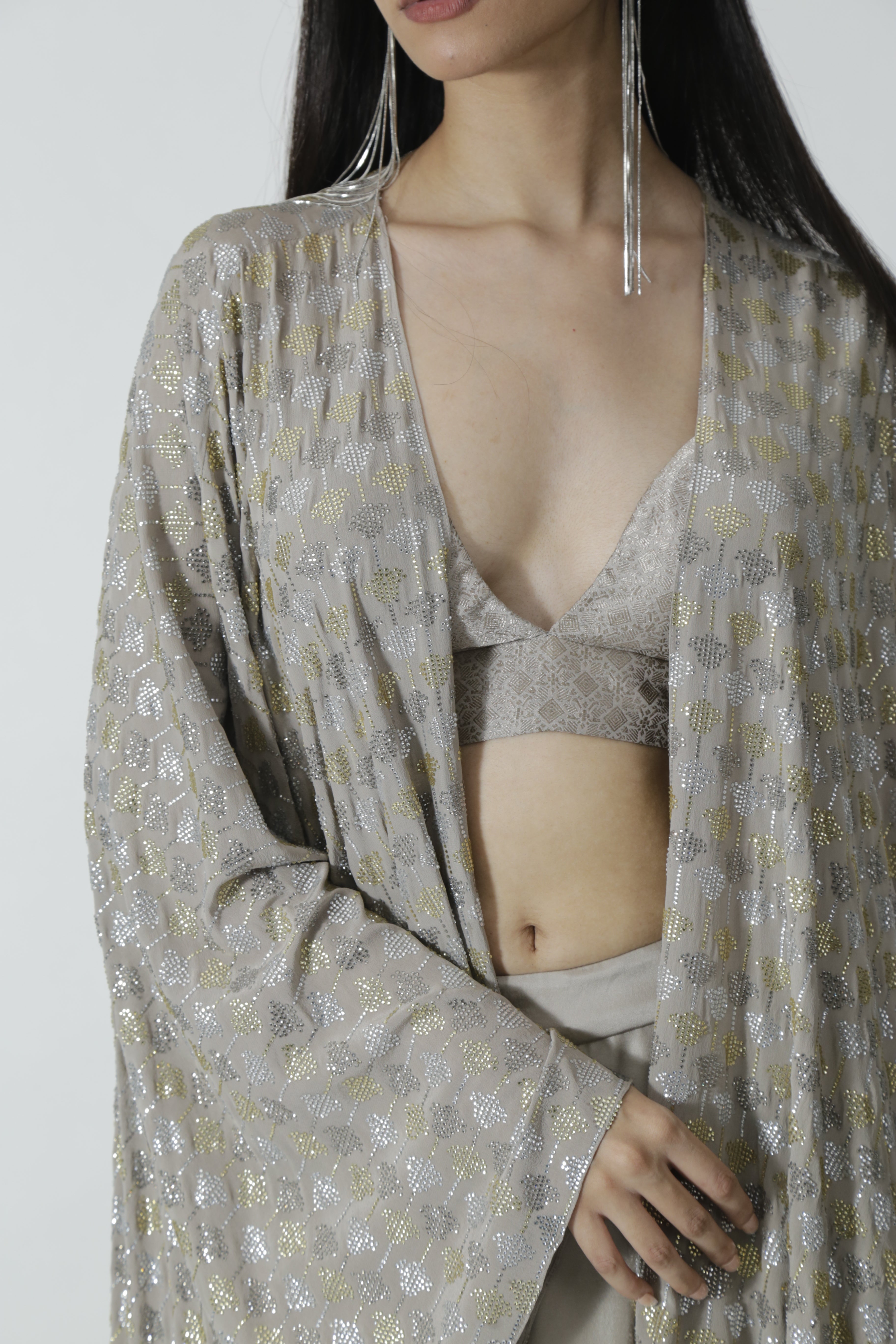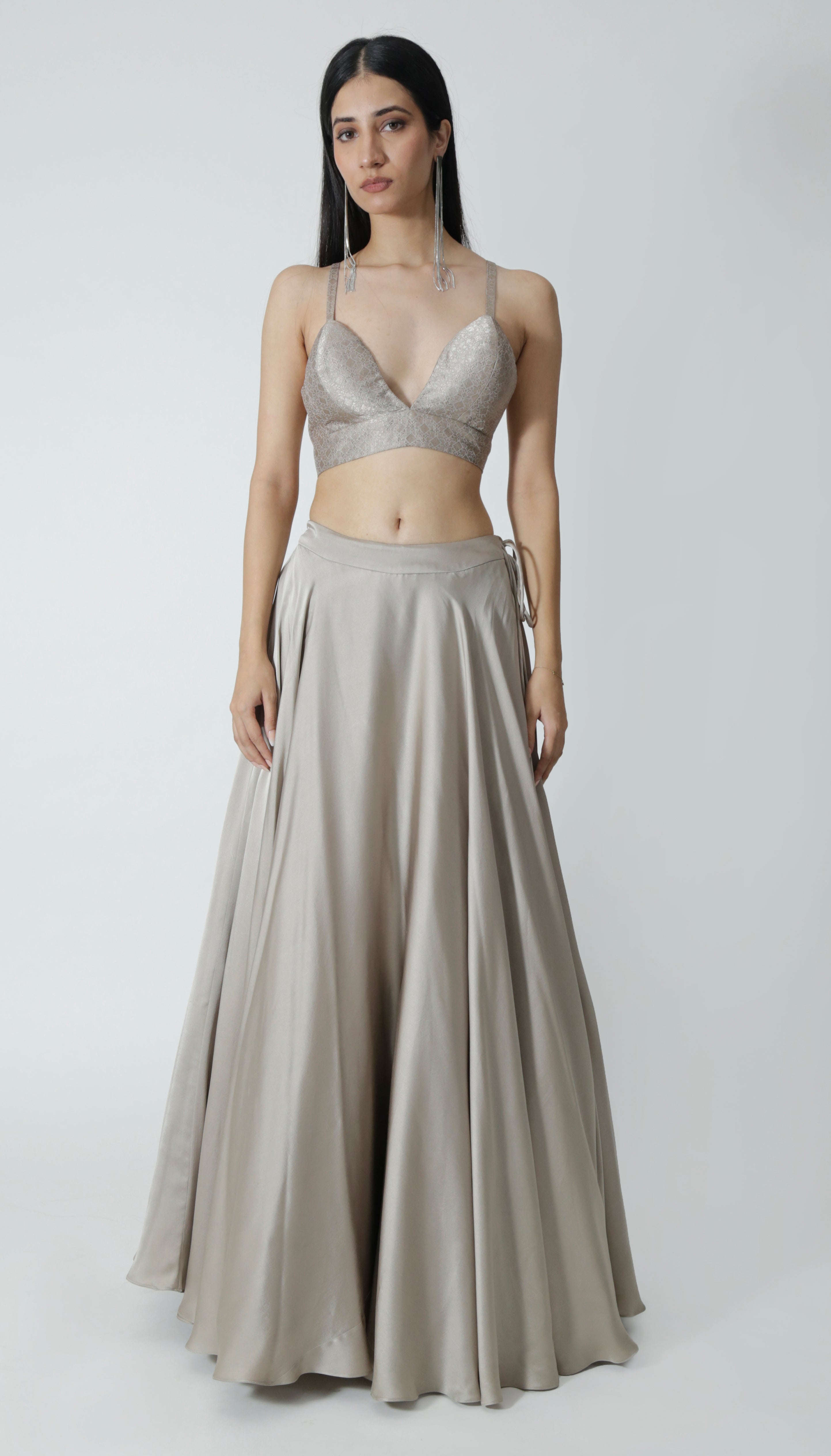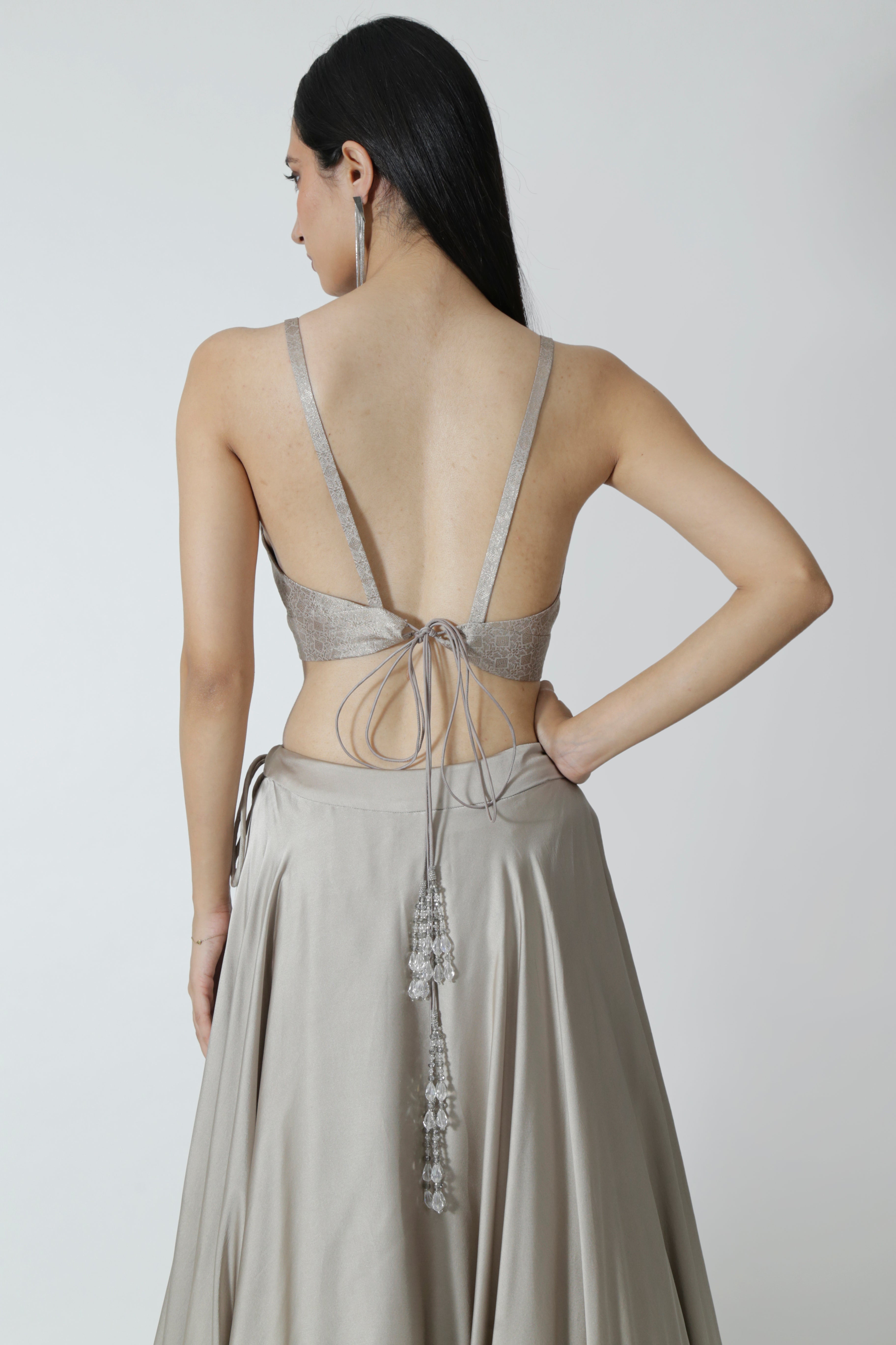 A Silver Grey silk satin skirt, accented with tassels and paired with brocade bralette, accented with rhinestones encrusted cape.