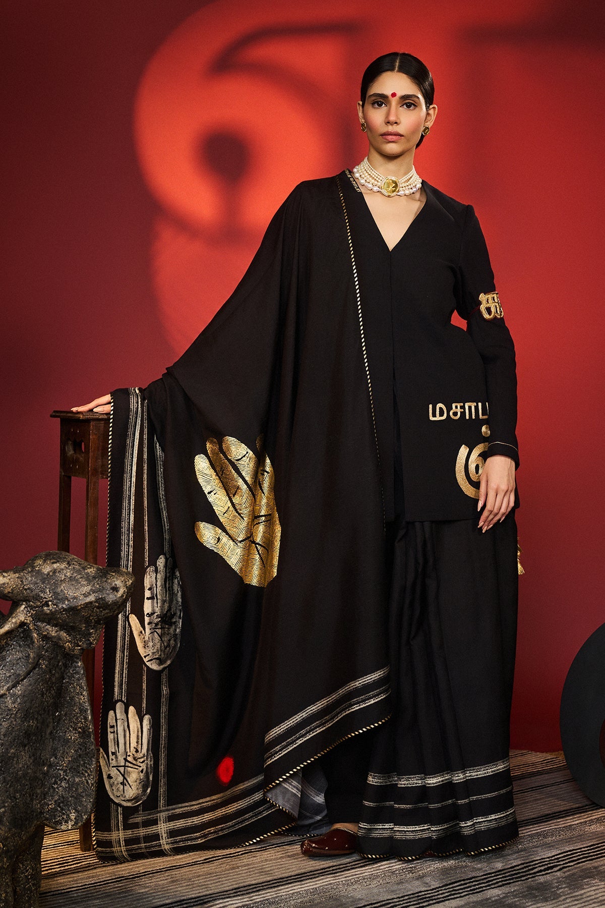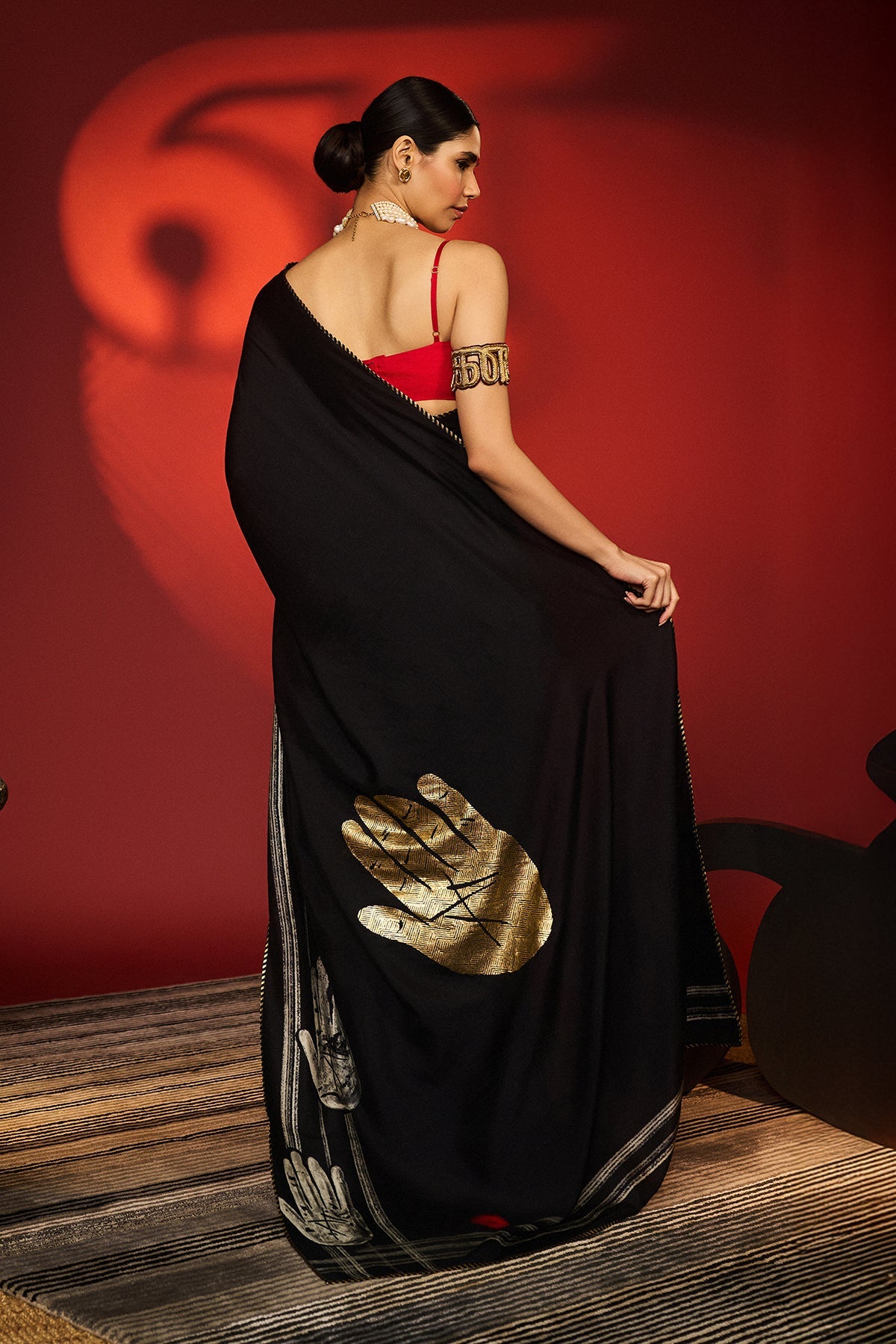 Saree with blouse piece- Never Not Iconic is a statement saree in charcoal black, adorned with bold palm motifs and dynamic strokes in digital print. A touch of gold foil adds luxe with a striking palm accent. Pinstripes piping frames the drape with subtle edge, while the vibrant red blouse brings an unapologetic pop of color.