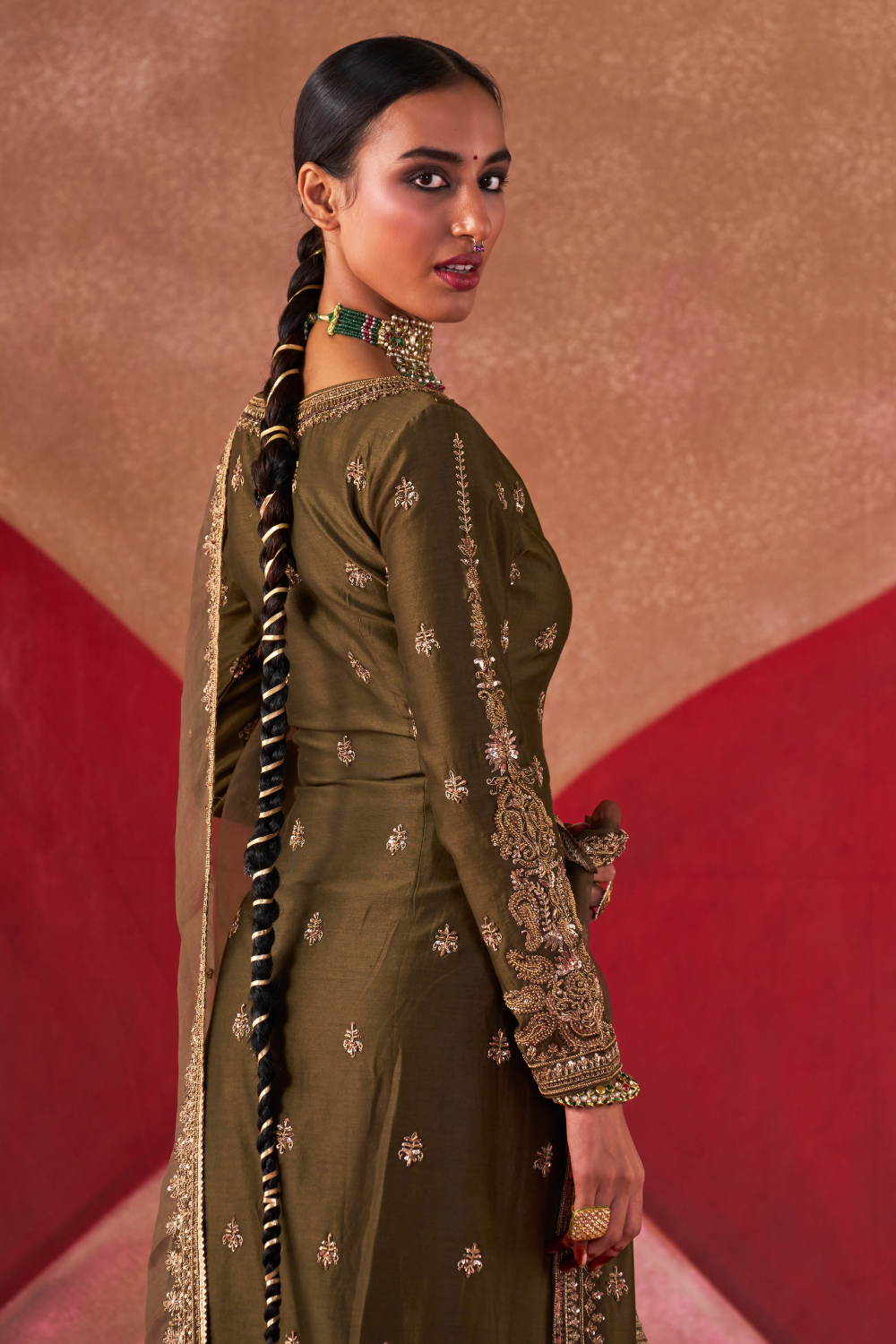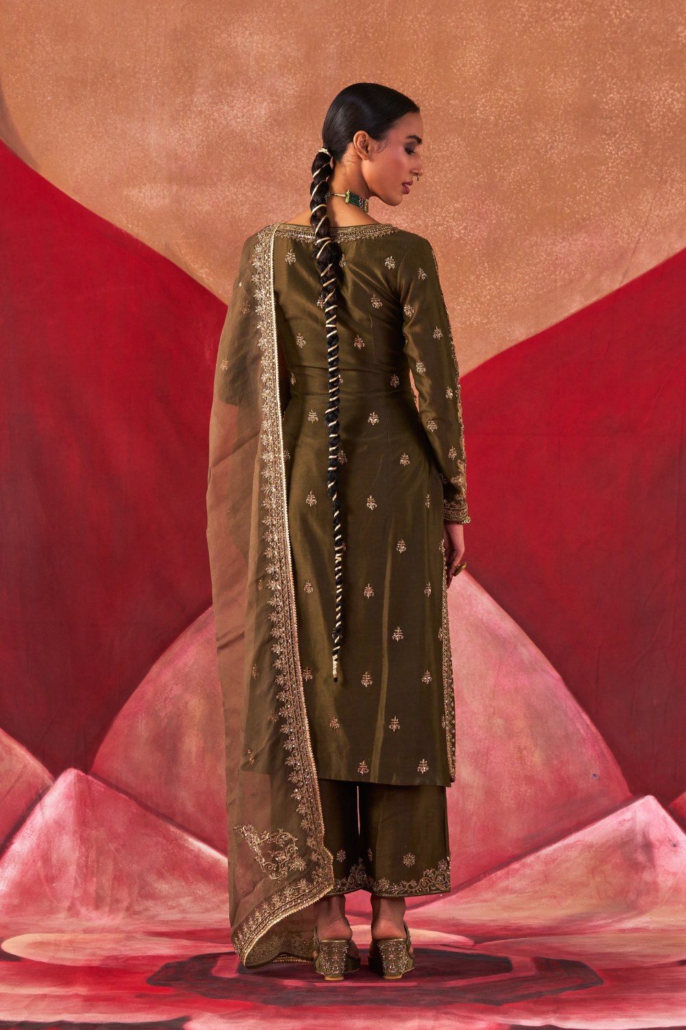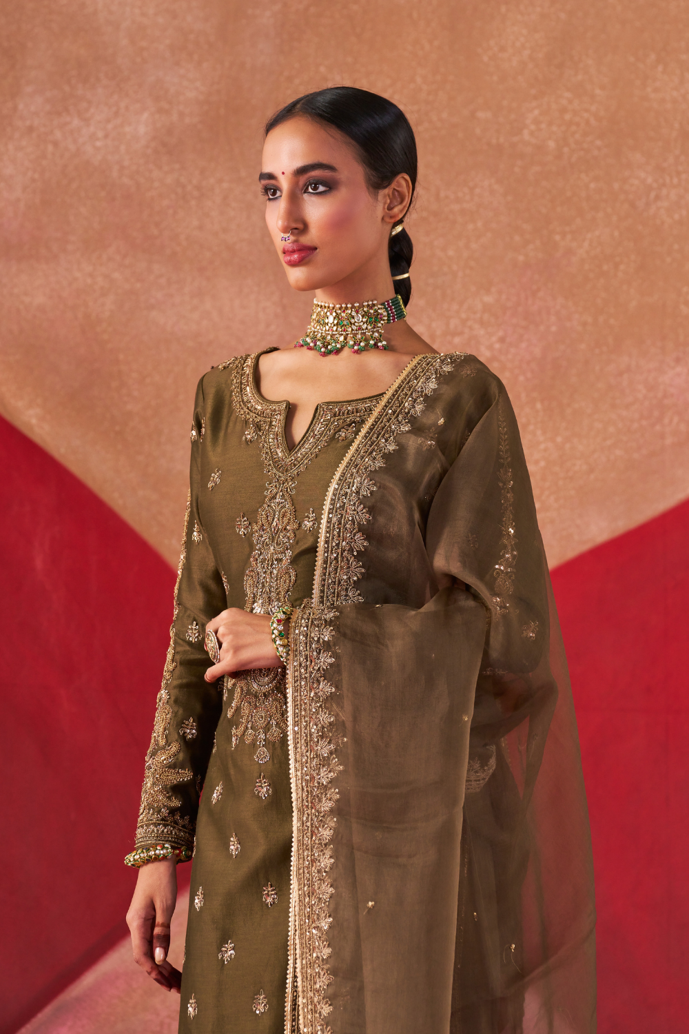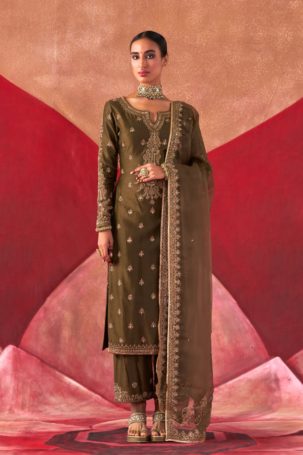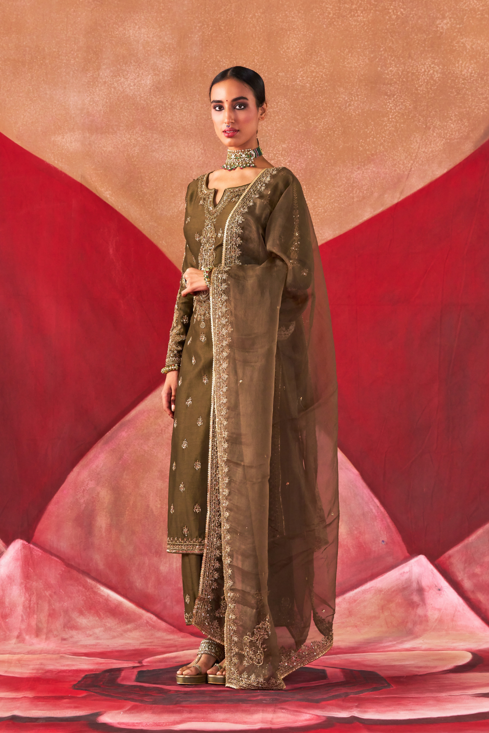 Featuring an olive chanderi silk kurta set paired with an organza base dupatta with antique gold dori and embellished hand embroidery.