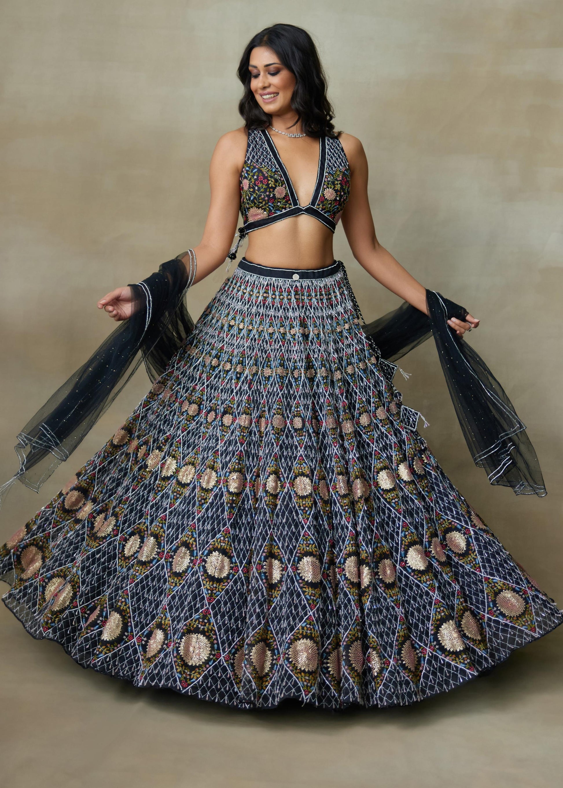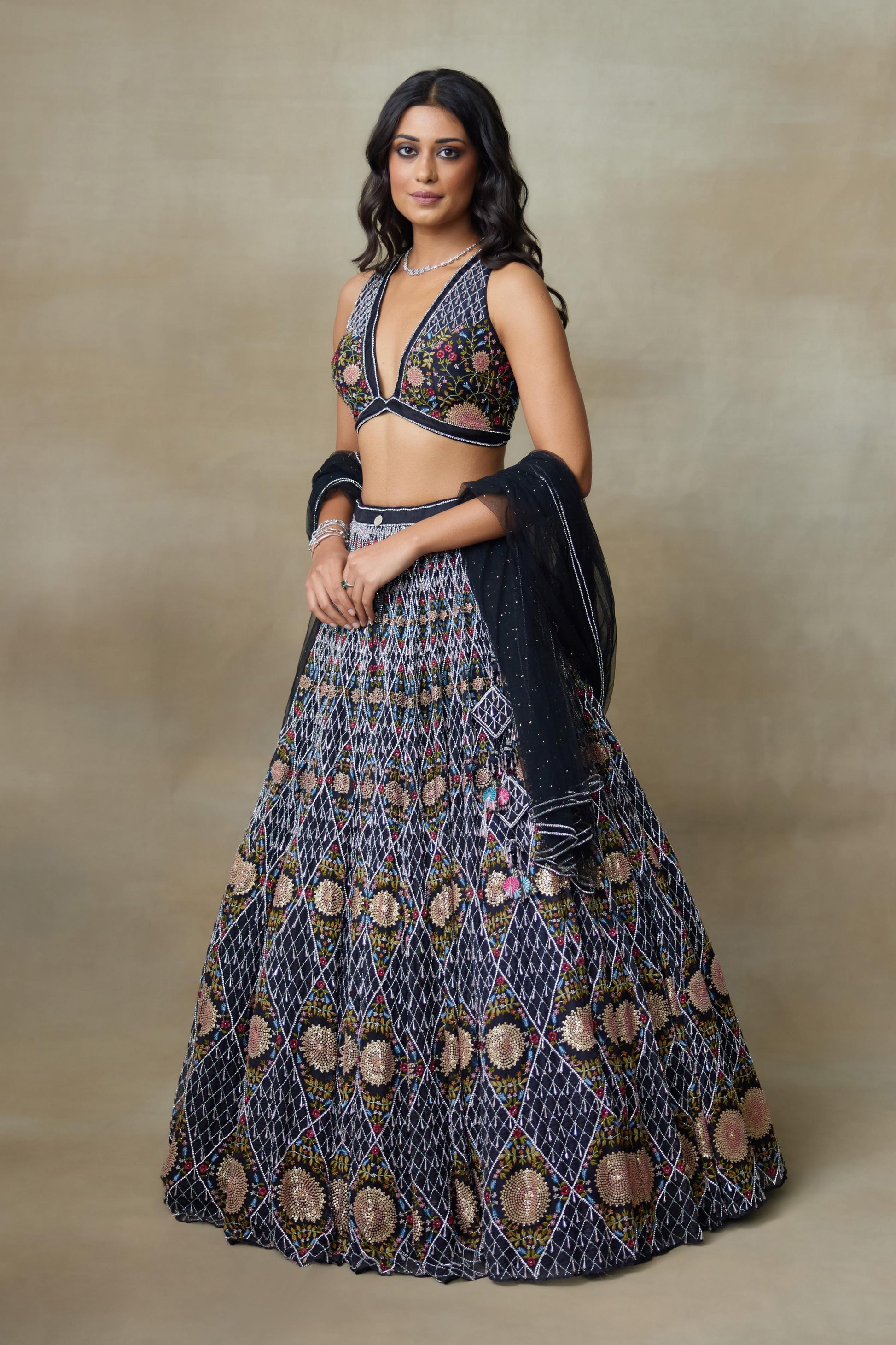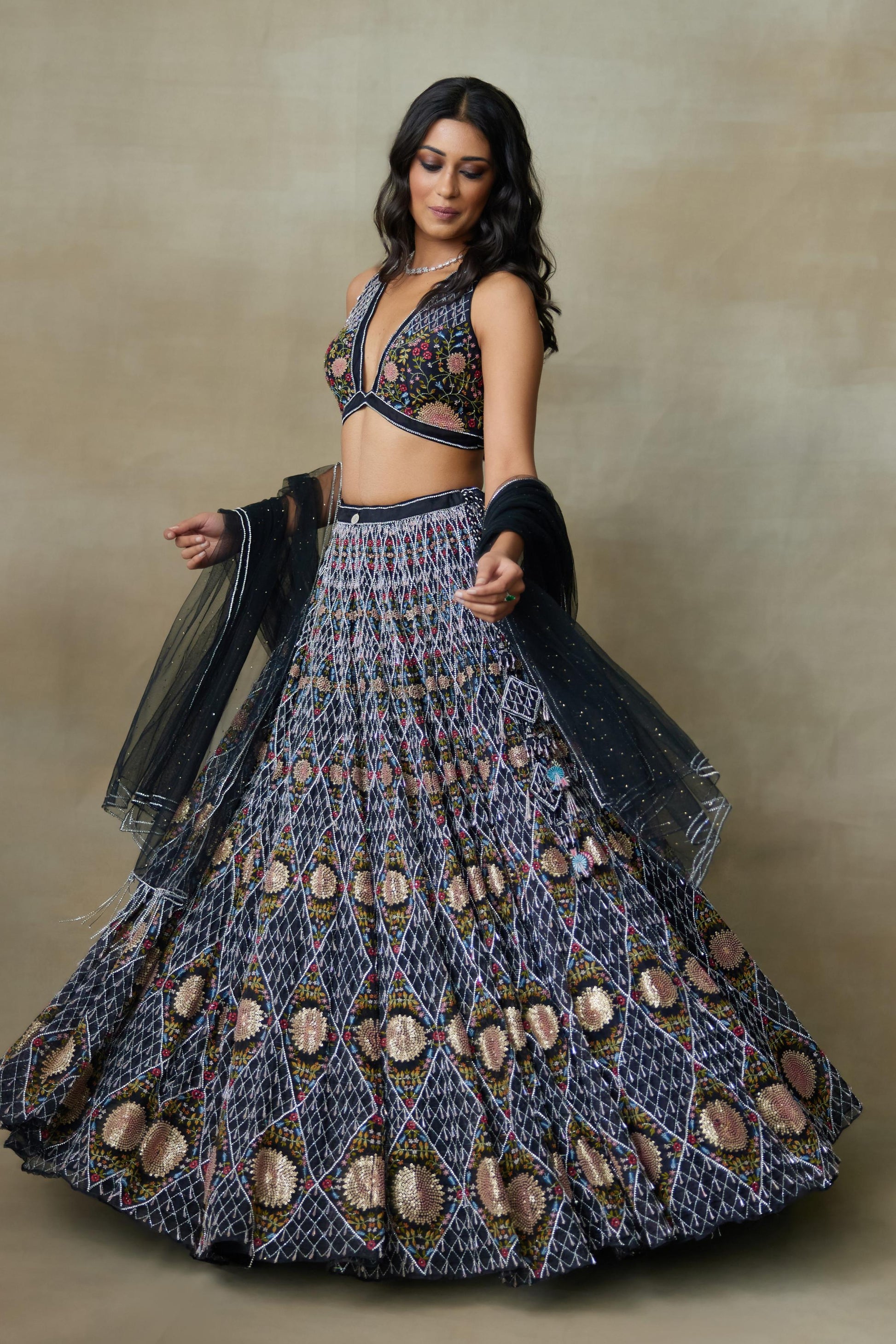 Our Black Silk Organza Lengha Paired With Chamundi Silk V Shaped Neckline Blouse And Mukesh Net Dupatta Is Carefully Hand-Embellished With Sparkling Diamond Accents And Sun Inspired Motifs In The Center With Swarovski Line Of Work Outlined, Delicate Drops Attached Across The Checkered Design And Intricate Floral Work Makes It Have A Stunning Look With Unique Style With Elegance.